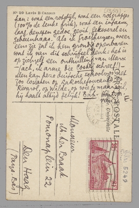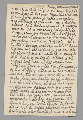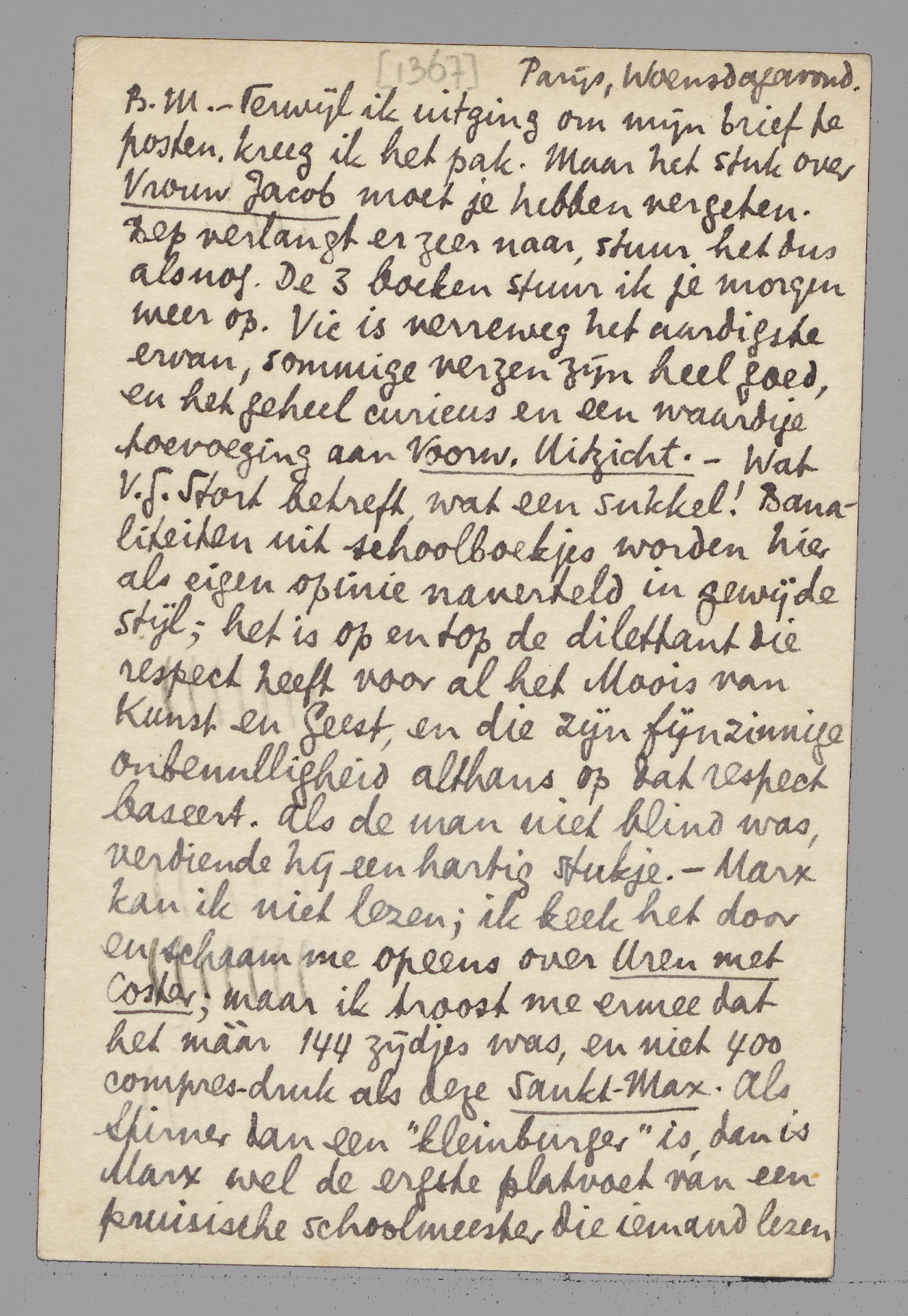 - Terwijl ik uitging om mijn brief te posten, kreeg ik het pak. Maar het stuk over Vrouw Jacob moet je hebben vergeten. Bep verlangt er zeer naar, stuur het dus alsnog. De 3 boeken stuur ik je morgen weer op. Vic is verreweg het aardigste ervan, sommige verzen zijn heel goed, en het geheel curieus en een waardige toevoeging aan Voorw. Uitzicht. - Wat V.G. Stort betreft, wat een sukkel! Banaliteiten uit schoolboekjes worden hier als eigen opinie naverteld in gewijde stijl; het is op en top de dilettant die respect heeft voor al het Moois van Kunst en Geest, en die zijn fijnzinnige onbenulligheid althans op dat respect baseert. Als de man niet blind was, verdiende hij een hartig stukje. Marx kan ik niet lezen; ik keek het door en schaam me opeens over Uren met Coster; maar ik troost me ermee dat het mààr 144 zijdjes was, en niet 400 compresdruk als deze Sankt-Max. Als Stirner dan een ‘kleinburger’ is, dan is Marx wel de ergste platvoet van een pruisische schoolmeester die iemand lezen kan: wat een rotstijl, wat een rotgrapjes (100% de leuke frik), wat een infaam, laag, benepen gedoe, gevit, gekwezel en gebeunhaas. Als ik Groethuysen weer eens zie zal ik hem grondig openbaren wat ik van dit schrijfsel denk: het is op zichzelf een onthulling van Marx - (ach, ik arme die Coster schreef!) - Men kan deze duitsche schoolvos net zoo loslaten op La Rochefoucauld, op Rivarol, op Wilde, op wie je maar wil, hij haalt altijd gelijk! Bah. Hart. gr. van je