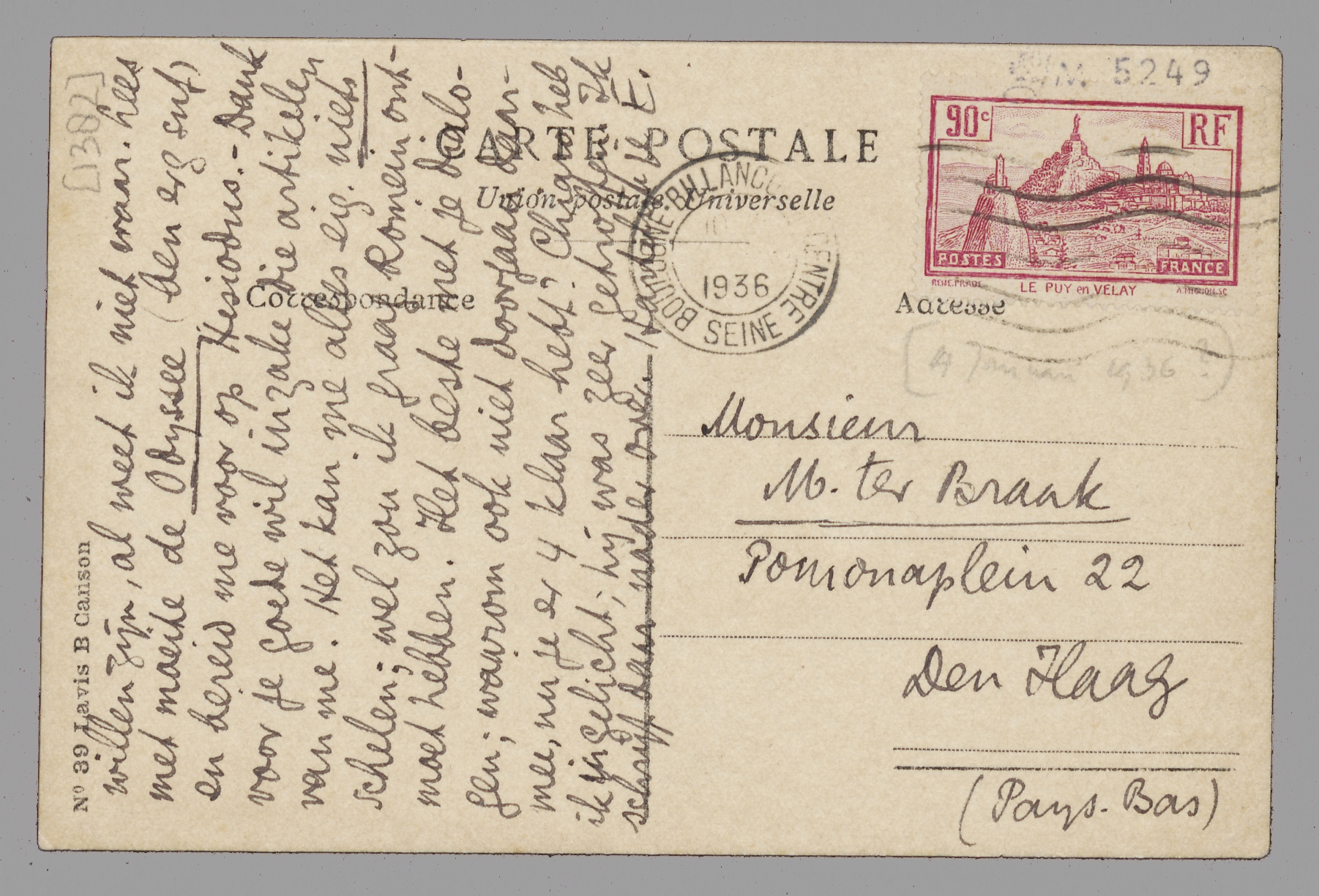 - Die historie met de Vigilance-heeren loopt mis. Romein schreef op het laatste oogenblik af en ik heb barstende hoofdpijn tengevolge van een slapelooze nacht tengevolge van een vergiftiging door heerlijkheden uit blik, zoodat ik ook niet gaan zal. In mijn plaats gaat nu Sandberg, erg goeiïg en zeer gelukkig in het vooruitzicht met prof. Langevin samen te zijn. - Is Romein socialist of communist? enfin, het doet er ook niet toe. Benieuwd morgen van S. te hooren wat het allemaal was, maar niet ál te benieuwd, gezien dat het toch politiek is. Ik stuur mijn stuk over Napoleon als emmerdeur naar De Groene; zal verder probeeren een stuk voor ditzelfde orgaan te maken over Guilloux, maar niets gaat me goed af. Ik zou ‘ver weg’ willen zijn, al weet ik niet waar. Lees met moeite de Odyssee (ben erg suf) en bereid me voor op Hesiodus. - Dank voor je goede wil inzake die artikelen van me. Het kan me alles eig. niets schelen; wel zou ik graag Romein ontmoet hebben. Het beste met je dialogen; waarom ook niet doorgaan daarmee, nu je er 4 klaar hebt? Chiaro heb ik ingelicht; hij was zeer getroffen. Ik schrijf daar nader over. Hartelijk je