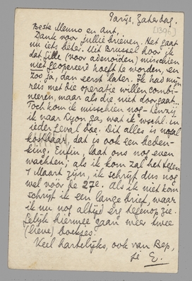 Toch kom ik misschien nog - tenzij ik naar Lyon ga, wat ik wschl. in ieder geval doe. Dit alles is nogal kostbaar, dat is ook een bedenking. Enfin, laat ons nog even wachten; als ik kom zal het tegen 1 Maart zijn, ik schrijf dus nog wel voor de 27e. Als ik niet kom schrijf ik een lange brief, waar ik nu nog altijd erg tegenop zie. Gelijk hiermee gaan weer twee (lieve) boekjes.