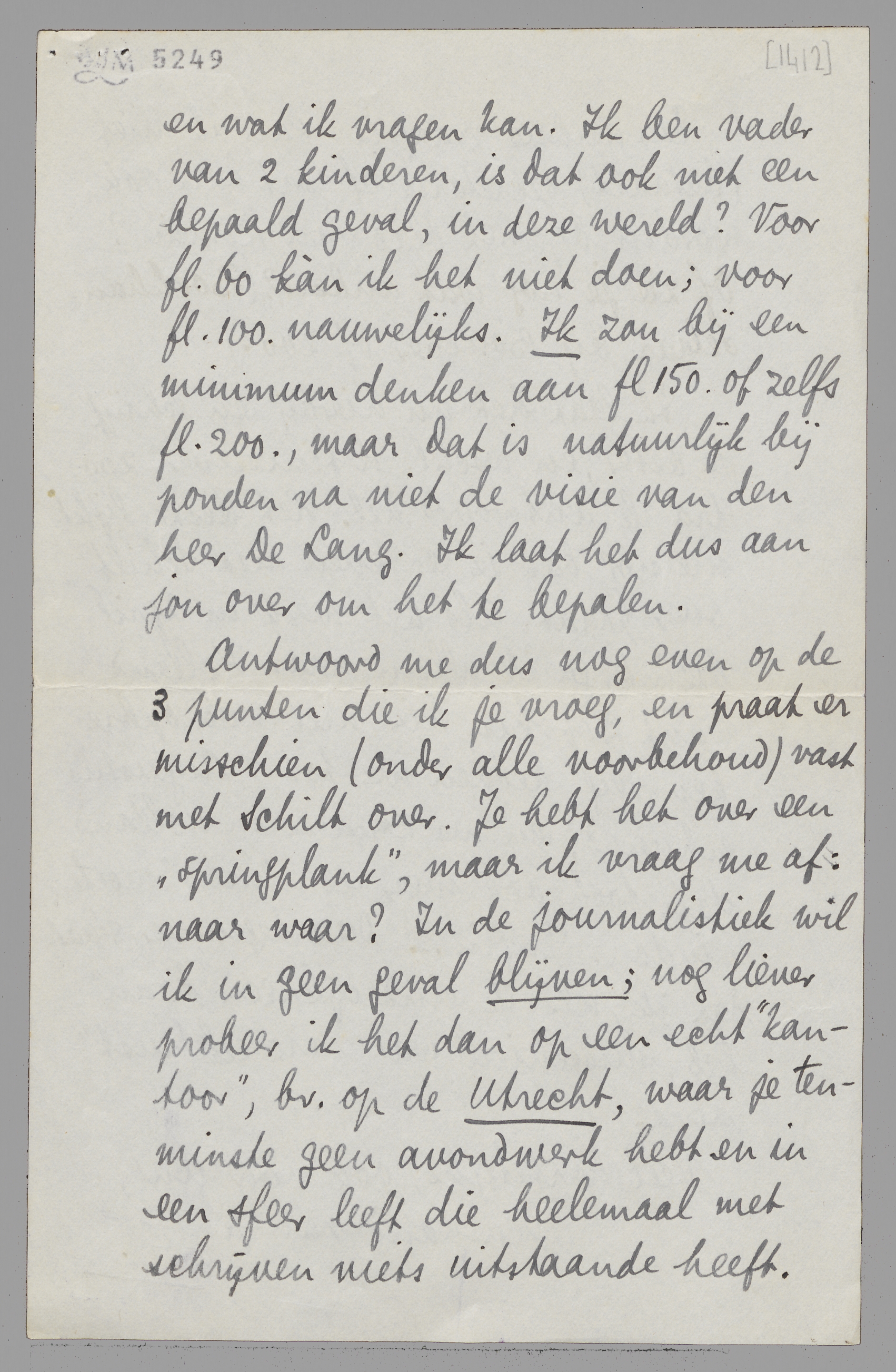 3. Dan is er nog het naar lezingen gaan, enz. Dat lijkt me het rotste van alles, en hierom alleen zou ik, geloof ik, een correctorsbaan geprefereerd hebben. Ik bedoel dit: àls ik nu toch, voor een gering salaris bovendien, den morgen en middag op bureau gezeten heb, dan zou ik het ‘moreele’ genot willen hebben van tenminste mijn avond voor mijzelf te hebben - al zou ik dan ook te beroerd zijn voor eigen werk en alleen... b.v. de Grieken kunnen lezen. Maar met elastisch-gehouden bijwerk voor den avond vervalt daar alle voordeel voor mij. Op dit punt zou ik dus nog wat voorlichting van je willen hebben. De brave De Lang lijkt mij iemand die zijn werknemers goed weet te exploiteeren, dat merk ik aan jou; maar waar jij, voor een zelfstandige positie van bovendien 500 pop in de maand, je eergevoel etc. in werking kunt laten brengen, lukt mij dat natuurlijk niet, in de sfeer waarin ik dan leef. Mijn standpunt kan alleen zijn: ik geef tijd voor geld. Hoeveel tijd voor hoe weinig geld? dat is dus de heele vraag.