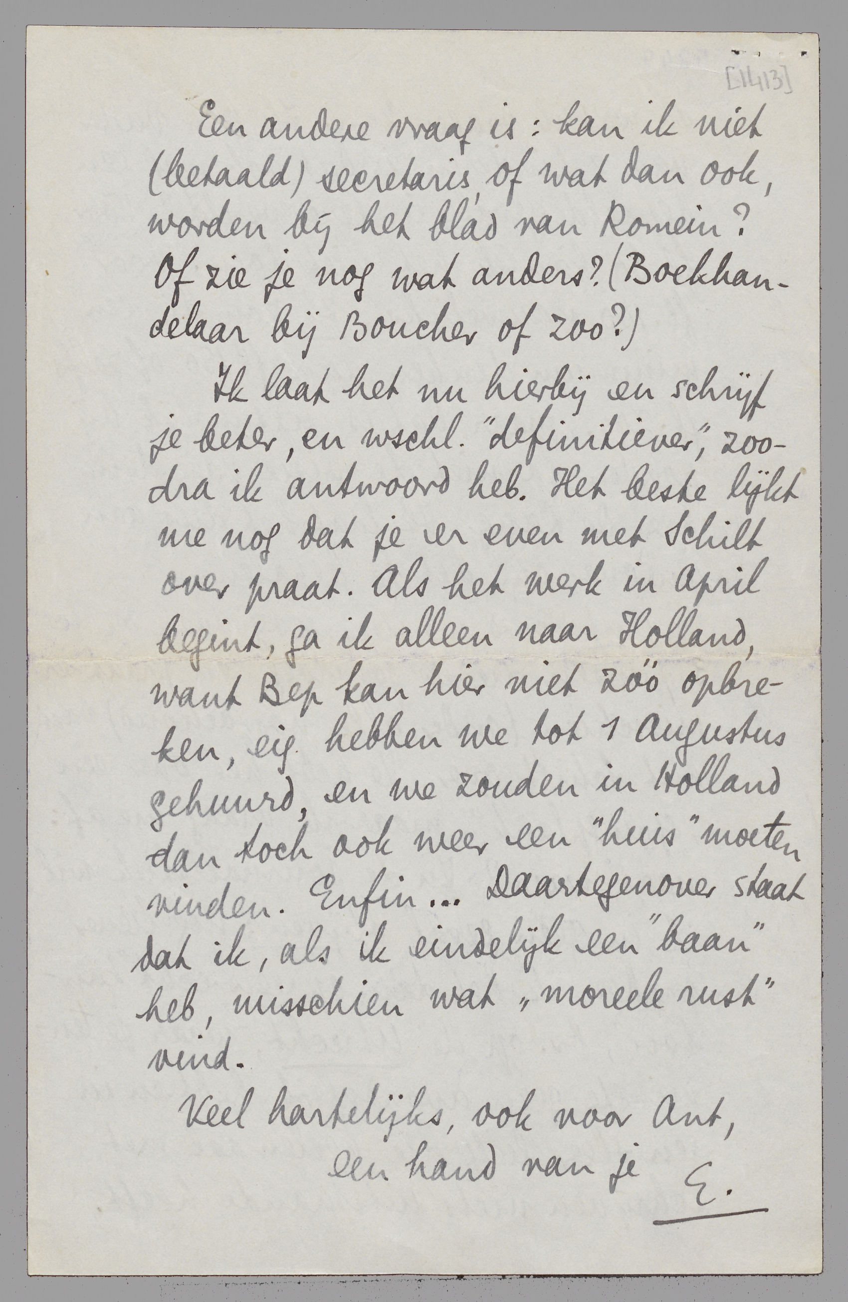 Ik laat het nu hierbij en schrijf je beter, en wschl. ‘definitiever’, zoodra ik antwoord heb. Het beste lijkt me nog dat je er even met Schilt over praat. Als het werk in April begint, ga ik alleen naar Holland, want Bep kan hier niet zóó opbreken, eig. hebben we tot 1 Augustus gehuurd, en we zouden in Holland dan toch ook weer een ‘huis’ moeten vinden. Enfin... Daartegenover staat dat ik, als ik eindelijk een ‘baan’ heb, misschien wat ‘moreele rust’ vind.