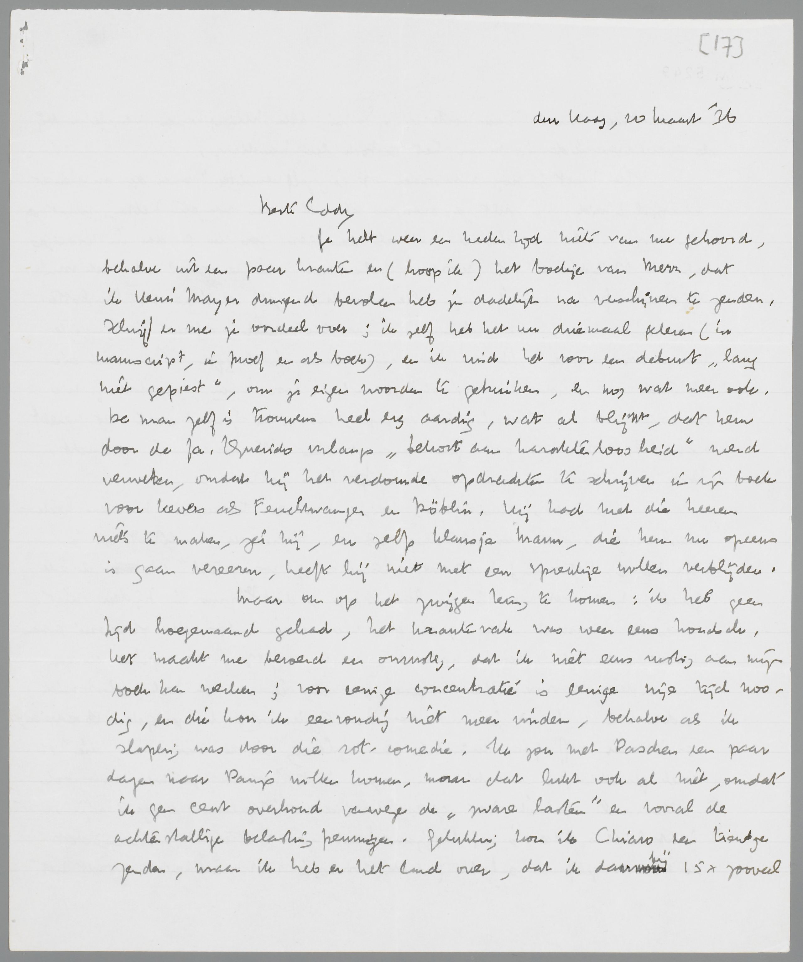 Je hebt weer een heele tijd niets van me gehoord, behalve uit een paar kranten en (hoop ik) het boekje van Merz, dat ik Henri Mayer dringend bevolen heb je dadelijk na verschijnen te zenden. Schrijf er me je oordeel over; ik zelf heb het nu drie maal gelezen (in manuscript, in proef en als boek), en ik vind het voor een debuut ‘lang niet gepiest’, om je eigen woorden te gebruiken, en nog wat meer ook. De man zelf is trouwens heel erg aardig, wat al blijkt, dat hem door de fa. Querido onlangs ‘tekort aan karakterloosheid’ werd verweten, omdat hij het verdomde opdrachten te schrijven in zijn boek voor kevers als Feuchtwanger en Döblin. Hij had met die heeren niets te maken, zei hij, en zelfs Klausje Mann, die hem nu opeens is gaan vereeren, heeft hij niet met een spreukje willen verblijden.