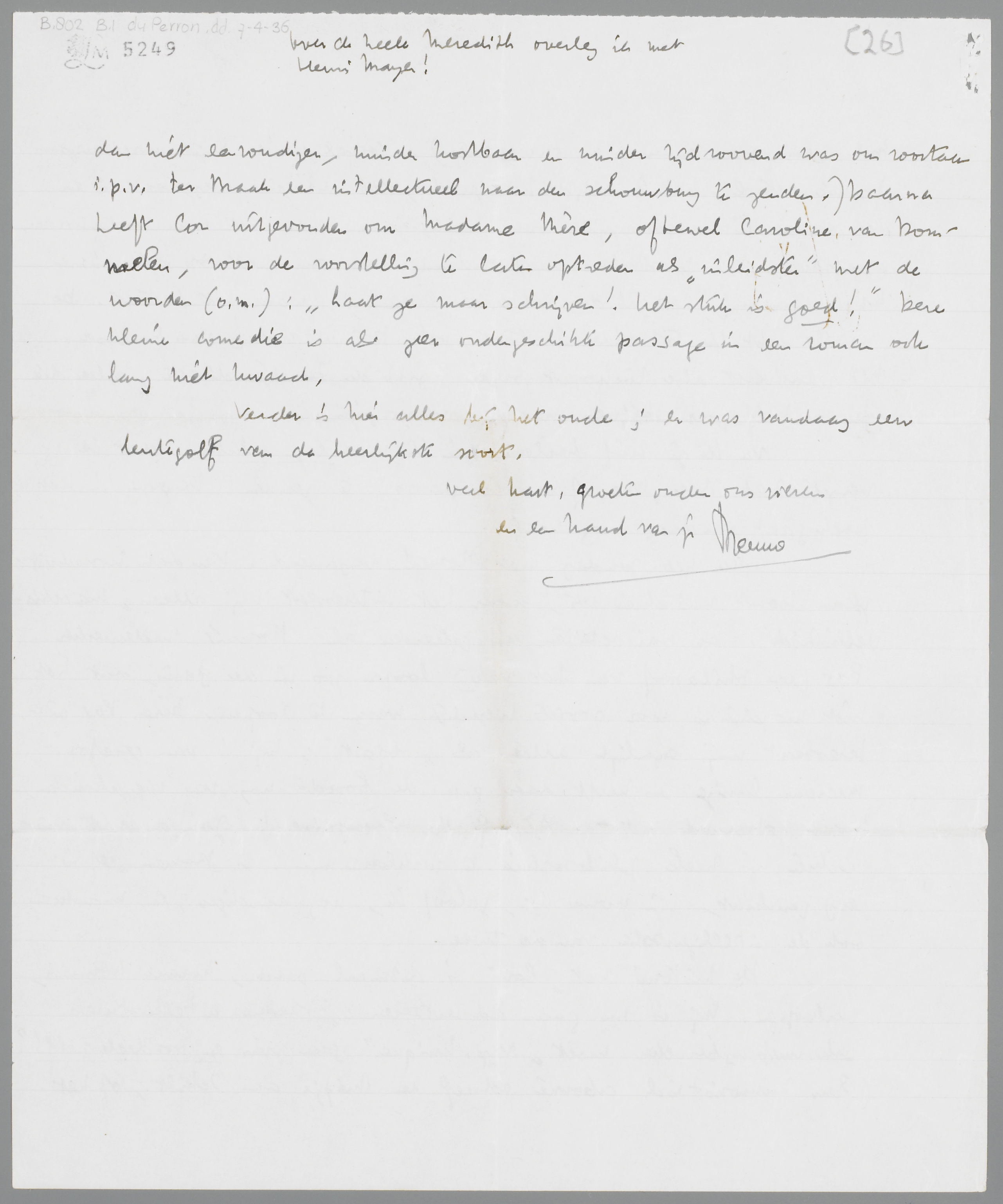 Ik moet je nog antwoorden op je ‘zelfverwijten’ over de onvriendschappelijkheid. Je zult ze overigens al wel weer vergeten hebben, want ze zijn onzin. Ik beschouw het als een eer zoo nu en dan in krantjes als De Standaard te worden belasterd, en een geval als dat van Wijdenes-Gerda heb ik bij volle bewustzijn zelf geriskeerd. Tenslotte kan misverstand, uit zulke dingen voortvloeiend, alleen ten nadeele komen van degenen, die er het misverstand in leggen. Ik vond die historie met Gerda een oogenblik vervelend voor haar, omdat zij nu eenmaal niet in staat is tot begrip, maar au fond raakt het mezelf nauwelijks. Ik heb ook geen moment aan iets onaardigs gedacht, dat zou trouwens de dingen op hun kop zetten.