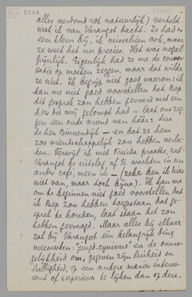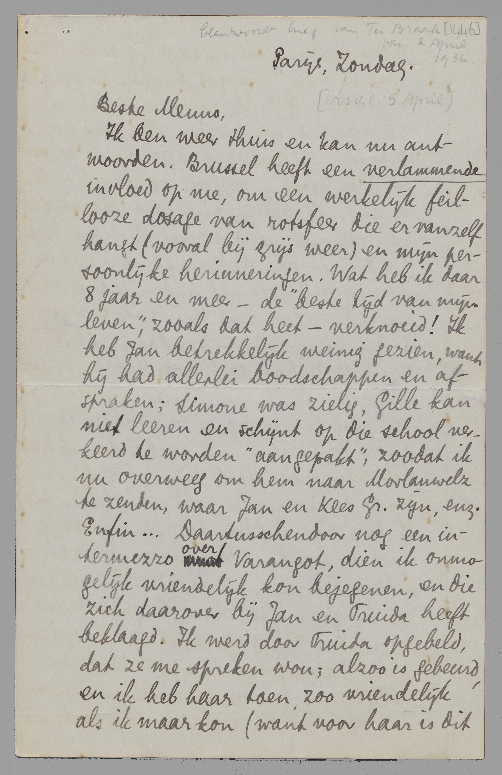 Ik ben weer thuis en kan nu antwoorden. Brussel heeft een verlammende invloed op me, om een werkelijk feillooze dosage van rotsfeer die er vanzelf hangt (vooral bij grijs weer) en mijn persoonlijke herinneringen. Wat heb ik daar 8 jaar en meer - de ‘beste tijd van mijn leven’, zooals dat heet - verknoeid! Ik heb Jan betrekkelijk weinig gezien, want hij had allerlei boodschappen en afspraken; Simone was zielig, Gille kan niet leeren en schijnt op die school verkeerd te worden ‘aangepakt’, zoodat ik nu overweeg om hem naar Morlanwelz te zenden, waar Jan en Kees Gr. zijn, enz. Enfin... Daartusschendoor nog een intermezzo over Varangot, dien ik onmogelijk vriendelijk kon bejegenen, en die zich daarover bij Jan en Truida heeft beklaagd. Ik werd door Truida opgebeld, dat ze me spreken wou; alzoo is gebeurd, en ik heb haar toen, zoo vriendelijk als ik maar kon (want voor haar is dit alles verdomd rot natuurlijk) verteld wat ik van Varangot dacht. Ze had er een kleur bij, ik misschien ook, maar ze weet het nu precies. Het was nogal pijnlijk. Eigenlijk had ze me de conversatie op moeten zeggen, maar dat wilde ze niet. Ik begrijp niet goed waarom: ik kan me niet goed voorstellen dat Bep dit gesprek zou hebben gevoerd met een heer die mij gelompt had – laat ons zeggen een oude vriend van hààr: dus de heer Binnendijk – en dat ze hem zoo vriendschappelijk zou hebben verlaten. Terwijl ik met Truida praatte, zat Varangot de uitslag af te wachten in een ander café, meen ik – (zeker ben ik hier niet van, maar toch bijna). Ik kan me om te beginnen niet goed voorstellen dat ik Bep zou hebben toegestaan dat gesprek te houden, laat staan het zou hebben gevraagd. Maar alles bij elkaar zal bij Varangot één belangrijk ding meewerken: ‘jeugd-cynisme’ en de onmogelijkheid om, gegeven zijn luiheid en lulligheid, op een andere manier interessant of superieur te lijken dan op deze. On fait ce qu’on peut. Hij maakt van de nood een deugd, als hij het doet voorkomen alsof hij een soort Uebermensch is en wij banale lichtgeraakte idioten. [Ik wil dit karakter nog eens behandelen in een verhaal, maar dan bij een man 2x zoo oud als Varangot.] Jan was, geloof ik, al weer een beetje ontsticht over mijn ‘hardheid’. Ik heb daar lak aan; er zijn werkelijk te veel fluimen en ploerten in de wereld om niet met koppigheid ‘naïef’ te blijven tegenover all that. Maar dat Jan hier aan ‘zelfverheffing’ denkt is voor mijn gevoel komisch; ik ondervind niet het minste plezier om te gaan zitten (of staan) op een paar omgevallen Varangots; ik vond het zéér pijnlijk, want hij kan me geen bal schelen, maar voor Truida heb ik echt sympathie, ondanks alle ‘hardheid’. Ik heb natuurlijk niet op die duitenverdienerij gemikt, maar 2 punten genoemd die voor mij de deur dicht deden: het bezoek bij Van Vriesland en de toon van dien brief aan jou. Ik heb gezegd dat het gewoon een kwestie van huid was, dat de mijne daar kippenvel van kreeg (heel naïef natuurlijk) en dat ik punt 1 van haarzelf allesbehalve sympathiek vond; - verder dat Varangot de paar keer dat ik hem ontmoette, niets had aangebracht wat ik tegenover deze rotdingen kon stellen. Over jou hebben we’t natuurlijk ook gehad: Truida zei dat ze je in sommige punten gelijk gaf, maar dat je toch wel een erg onaangename toon had aangeslagen; ik heb gezegd dat ik van Varangot een woedende brief best zou hebben gevonden, dat deze brief alleen maar zoo onthullend was, zoo erg de brief van een raté die alle redactiebureau’s was afgetrapt. En zoo meer, alles zeer onverkwikkelijk, vooral tusschen mijn andere rotzooi door. Maar ik ben blij dat ik de comedie vermeden heb. –