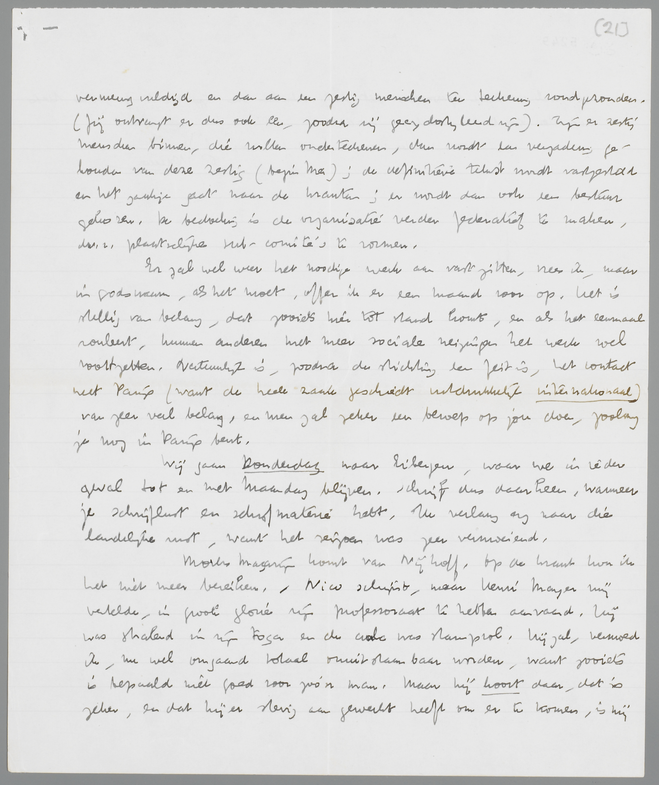Er zal wel weer het noodige werk aan vast zitten, vrees ik, maar in godsnaam, als het moet, offer ik er een maand voor op. Het is stellig van belang, dat zooiets hier tot stand komt, en als het eenmaal rouleert, kunnen anderen met meer sociale neigingen het werk wel voortzetten. Natuurlijk is, zoodra de stichting een feit is, het contact met Parijs (want de heele zaak geschiedt uitdrukkelijk internationaal) van zeer veel belang, en men zal zeer zeker een beroep op jou doen, zoolang je nog in Parijs bent.