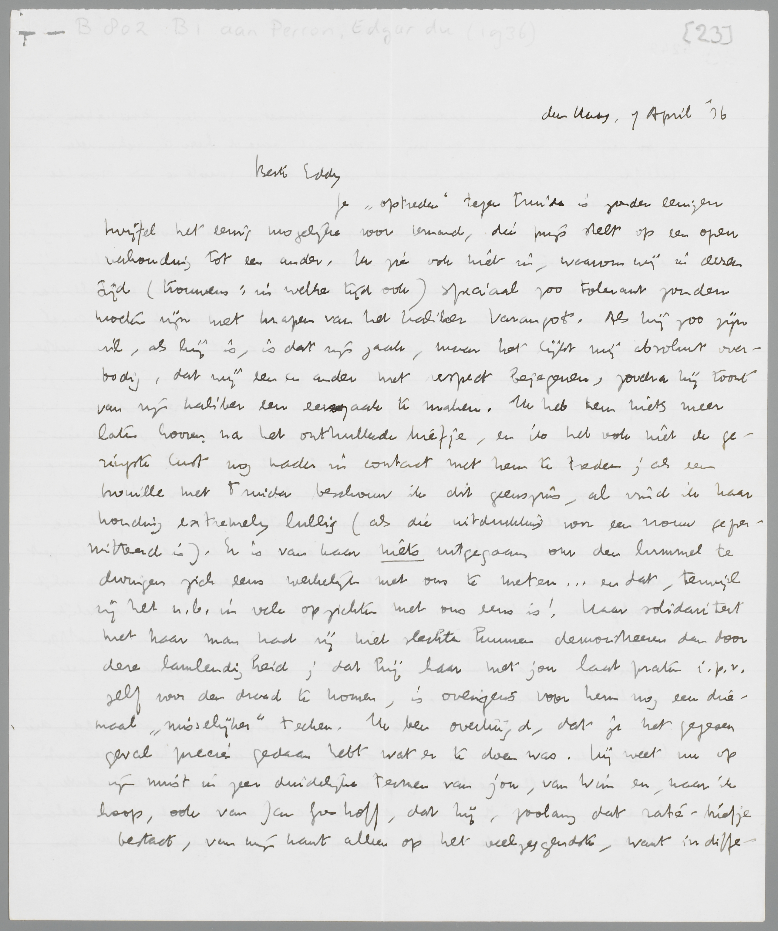 Er is nu een korte, maar scherpe oproep opgesteld, die behelst de stichting van een Comité van Waakzaamheid der anti-nat. soc. intellectueelen. (op voorstel van Kernkamp is de nadruk gelegd op de N.S.B., dus het nat. soc., omdat dat in Nederland het eenige dreigende reeële gevaar is.) De oproep wordt nu vermenigvuldigd en dan aan een zestig menschen ter teekening rondgezonden. (Jij ontvangt er dus ook een, zoodra zij gecyclostyleerd zijn). Zijn er zestig menschen binnen, die willen onderteekenen, dan wordt een vergadering gehouden van deze zestig (begin Mei); de definitieve tekst wordt vastgesteld en het zaakje gaat naar de kranten; er wordt dan ook een bestuur gekozen. De bedoeling is de organisatie verder federatief te maken, d.w.z. plaatselijke sub-comité's te vormen.