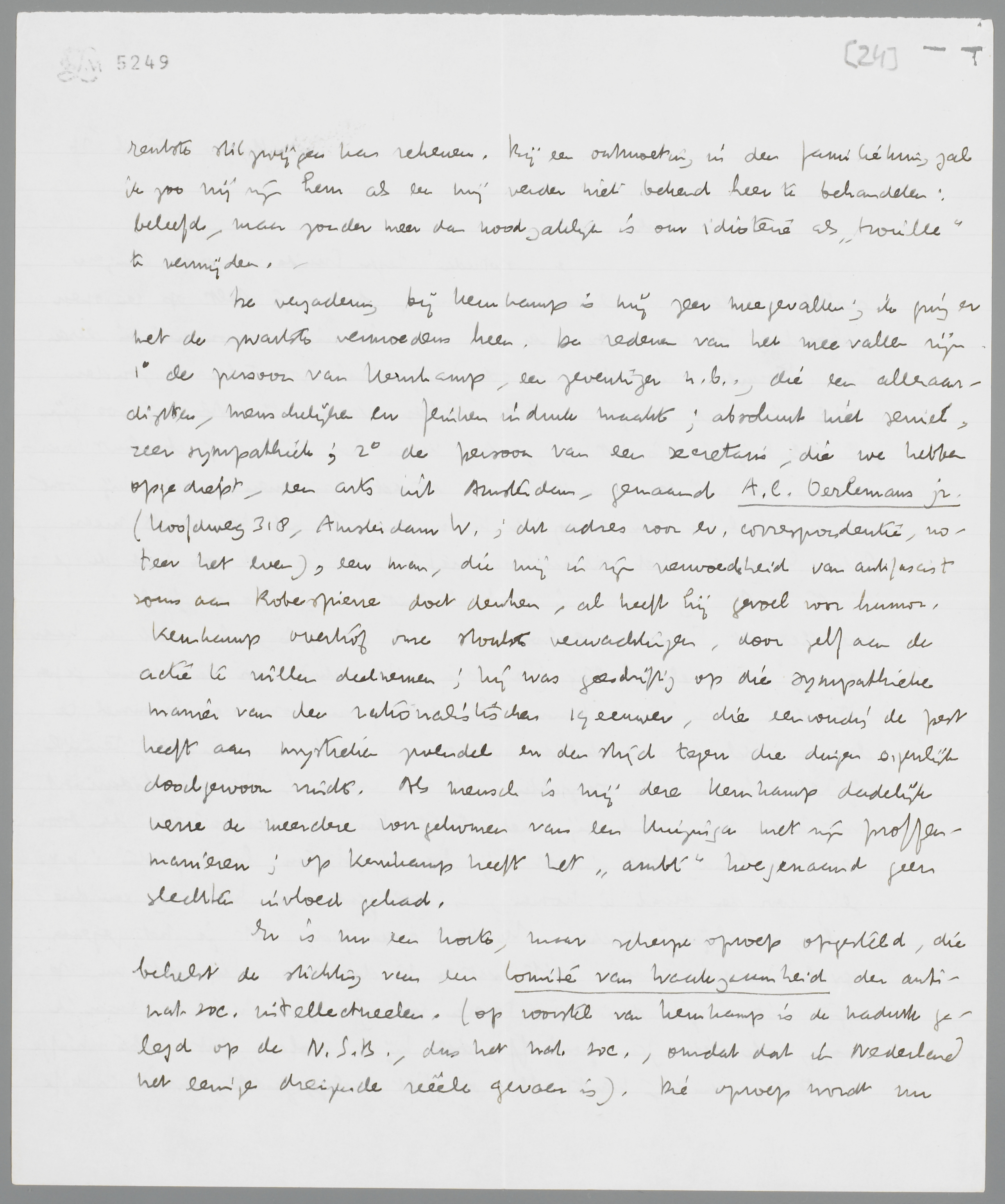 De vergadering bij Kernkamp is mij zeer meegevallen; ik ging er met de zwartste vermoedens heen. De redenen van het meevallen zijn 1o de persoon van Kernkamp, een zeventiger n.b., die een alleraardigsten, menschelijken en flinken indruk maakt; absoluut niet seniel, zeer sympathiek; 2o de persoon van een secretaris, die we hebben opgediept, een arts uit Amsterdam, genaamd A.C. Oerlemans jr. (Hoofdweg 318, Amsterdam W.; dit adres voor ev. correspondentie, noteer het even), een man, die mij in zijn verwoedheid van antifascist soms aan Robespierre doet denken, al heeft hij gevoel voor humor. Kernkamp overtrof onze stoutste verwachtingen, door zelf aan de actie te willen deelnemen; hij was geestdriftig op die sympathieke manier van den rationalistischen 19 eeuwer, die eenvoudig de pest heeft aan mystieken zwendel en den strijd tegen die dingen eigenlijk doodgewoon vindt. Als mensch is mij deze Kernkamp dadelijk verre de meerdere voorgekomen van een Huizinga met zijn proffen-manieren; op Kernkamp heeft het ‘ambt’ hoegenaamd geen slechten invloed gehad.