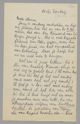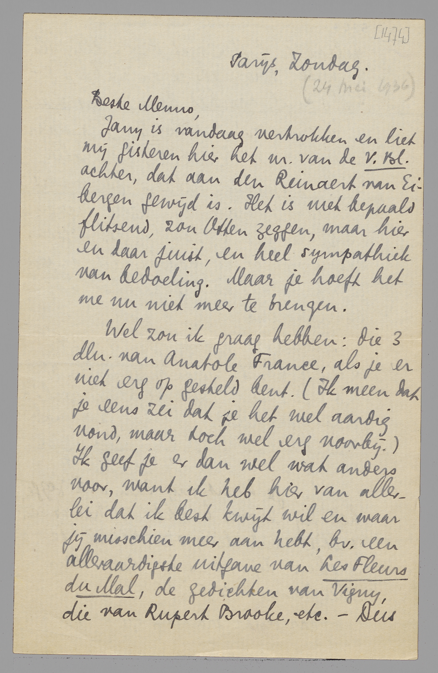 Wel zou ik graag hebben: die 3 dln. van Anatole France, als je er niet erg op gesteld bent. (Ik meen dat je eens zei dat je het wel aardig vond, maar toch wel erg voorbij). Ik geef je er dan wel wat anders voor, want ik heb hier van allerlei dat ik best kwijt wil en waar jij misschien meer aan hebt, bv. een alleraardigste uitgave van Les Fleurs du Mal, de gedichten van Vigny, die van Rupert Brooke, etc. - Dus belaad je koffer met die 3 dln., als je wilt. Maar als je er wèl op gesteld bent, doe het dan gerust niet.