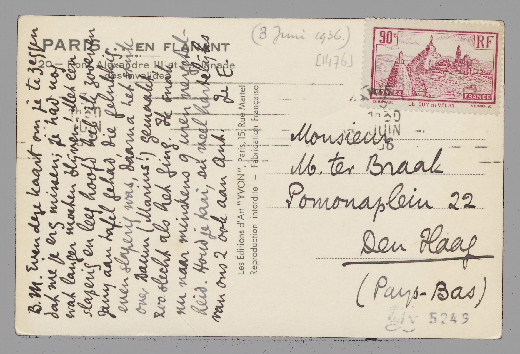 Even deze kaart om je te zeggen dat we je erg missen; je had nog wat langer moeten blijven! Met een slaperig en leeg hoofd heb ik zooeven Jany aan tafel gehad, die gelukkig even slaperig was, daarna het stuk over Daum (Marius!) gemaakt, zoo slecht als het ging. Ik snak nu naar minstens 9 uren vergetelheid. Houd je taai, en veel hartelijks van ons 2 ook aan Ant.