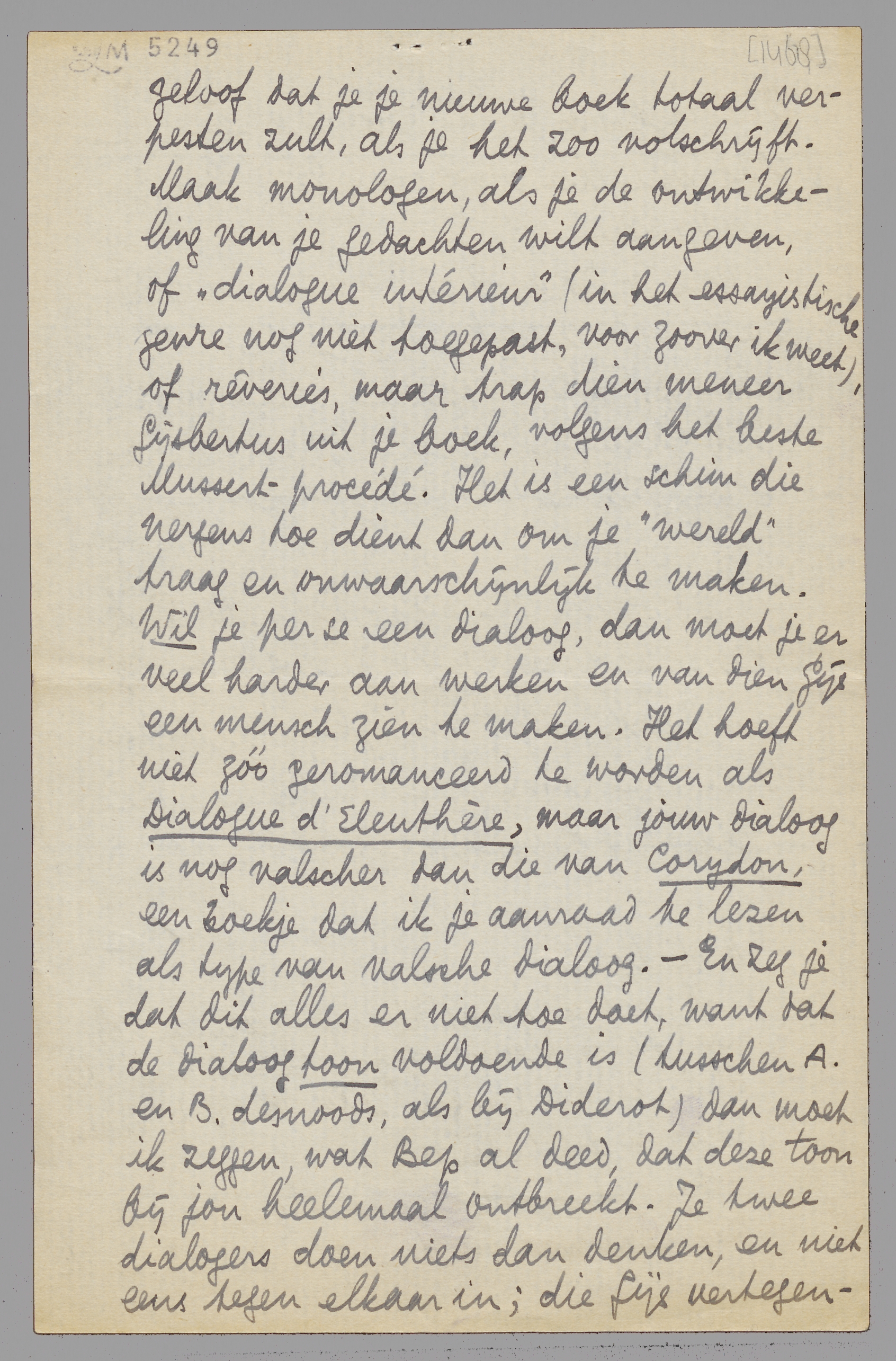 Hoe het zij: ik ben het geheel met Bep eens wat die dialogen betreft, en ik geloof dat je je nieuwe boek totaal verpesten zult, als je het zoo volschrijft. Maak monologen, als je de ontwikkeling van je gedachten wilt aangeven, of ‘dialogue intérieur’ (in het essayistische genre nog niet toegepast, voor zoover ik weet), of rêveries, maar trap dien meneer Gijsbertus uit je boek, volgens het beste Mussert-procédé. Het is een schim die nergens toe dient dan om je ‘wereld’ traag en onwaarschijnlijk te maken. Wil je per se een dialoog, dan moet je er veel harder aan werken en van dien Gijs een mensch zien te maken. Het hoeft niet zóó geromanceerd te worden als Dialogue d'Eleuthère, maar jouw dialoog is nog valscher dan die van Corydon, een boekje dat ik je aanraad te lezen als type van valsche dialoog. - En zeg je dat dit alles er niet toe doet, want dat de dialoogtoon voldoende is (tusschen A. en B. desnoods, als bij Diderot) dan moet ik zeggen, wat Bep al deed, dat deze toon bij jou heelemaal ontbreekt. Je twee dialogers doen niets dan denken, en niet eens tegen elkaar in; die Gijs vertegenwoordigt een paar schaduwtjes en tegenwindjes in het denken van ‘Ik’ en geeft hem dan ook constant gelijk - een dergelijke tegenhanger kan je veel beter oplossen in je monologen, rêverieën of wat het worden kan, door er telkens de nuance van je eigen tegenspraak van te maken, wat het ook is.