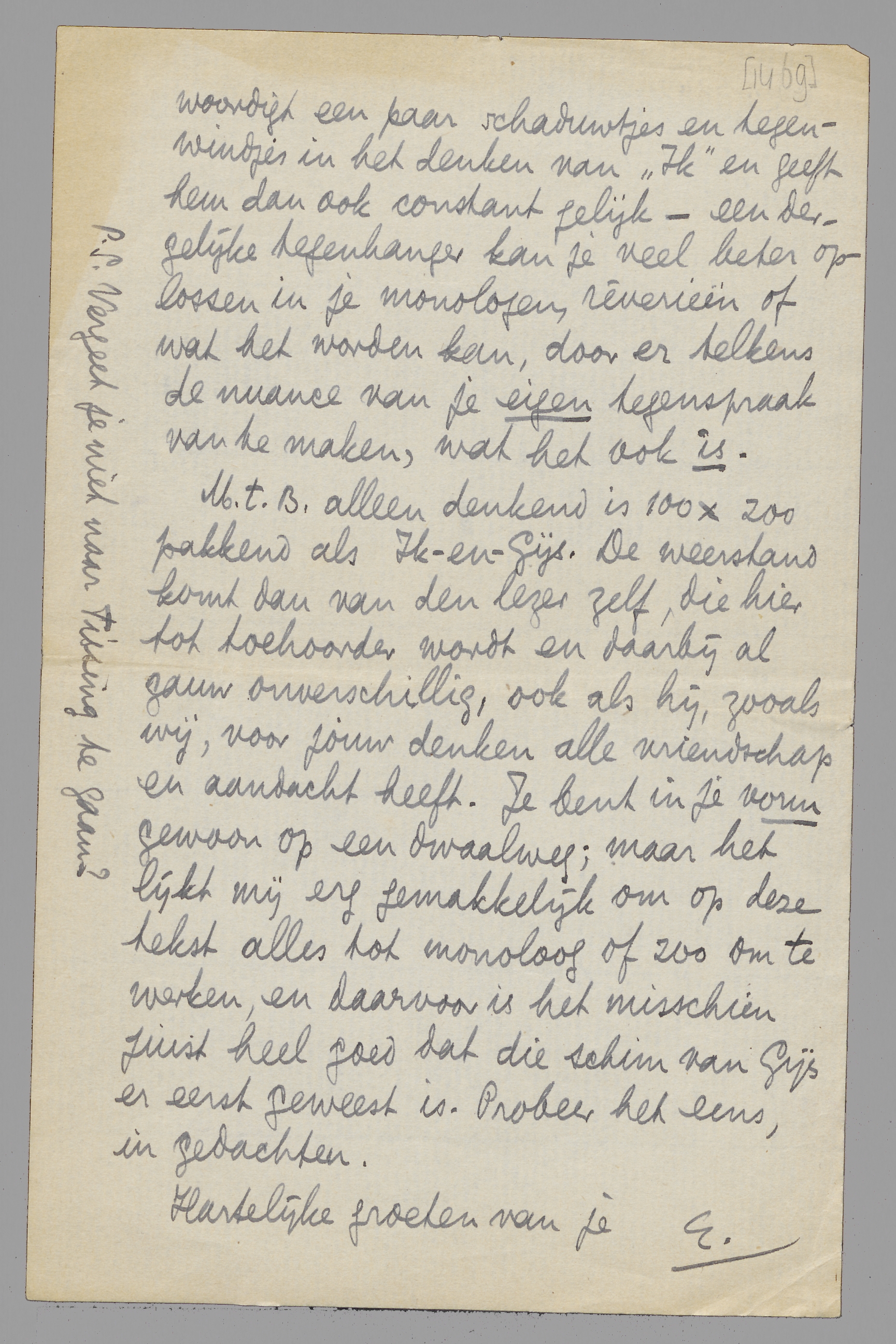 M.t.B. alleen denkend is 100 × zoo pakkend als Ik-en-Gijs. De weerstand komt dan van den lezer zelf, die hier tot toehoorder wordt en daarbij al gauw onverschillig, ook als hij, zooals wij, voor jouw denken alle vriendschap en aandacht heeft. Je bent in je vorm gewoon op een dwaalweg; maar het lijkt mij erg gemakkelijk om op deze tekst alles tot monoloog of zoo om te werken, en daarvoor is het misschien juist heel goed dat die schim van Gijs er eerst geweest is. Probeer het eens, in gedachten.
