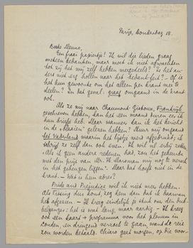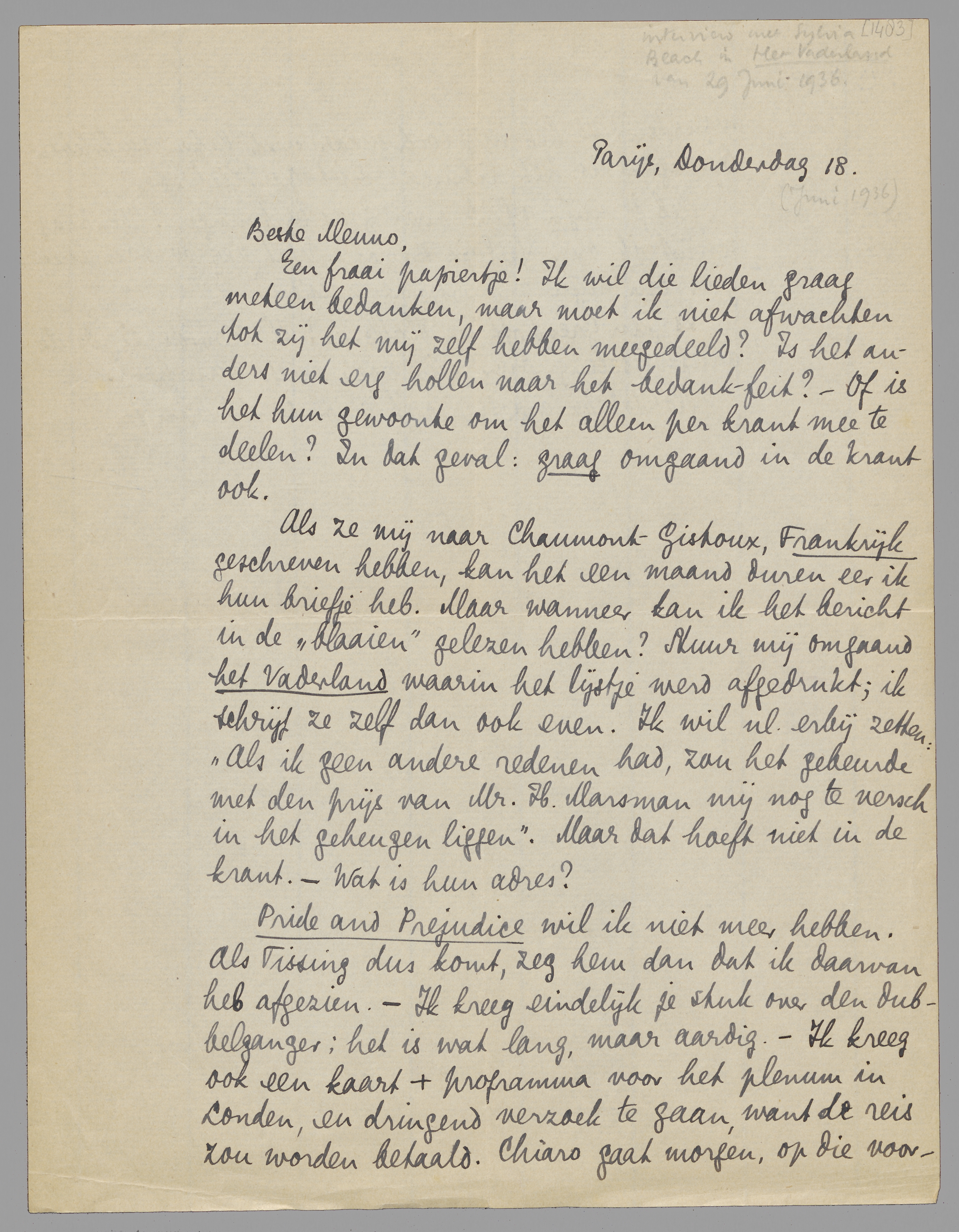 Als ze mij naar Chaumont-Gistoux, Frankrijk geschreven hebben, kan het een maand duren eer ik hun briefje heb. Maar wanneer kan ik het bericht in de ‘blaaien’ gelezen hebben? Stuur mij omgaand het Vaderland waarin het lijstje werd afgedrukt; ik schrijf ze zelf dan ook even. Ik wil nl. erbij zetten: ‘Als ik geen andere redenen had, zou het gebeurde met den prijs van Mr. H. Marsman mij nog versch in het geheugen liggen’. Maar dat hoeft niet in de krant. - Wat is hun adres?