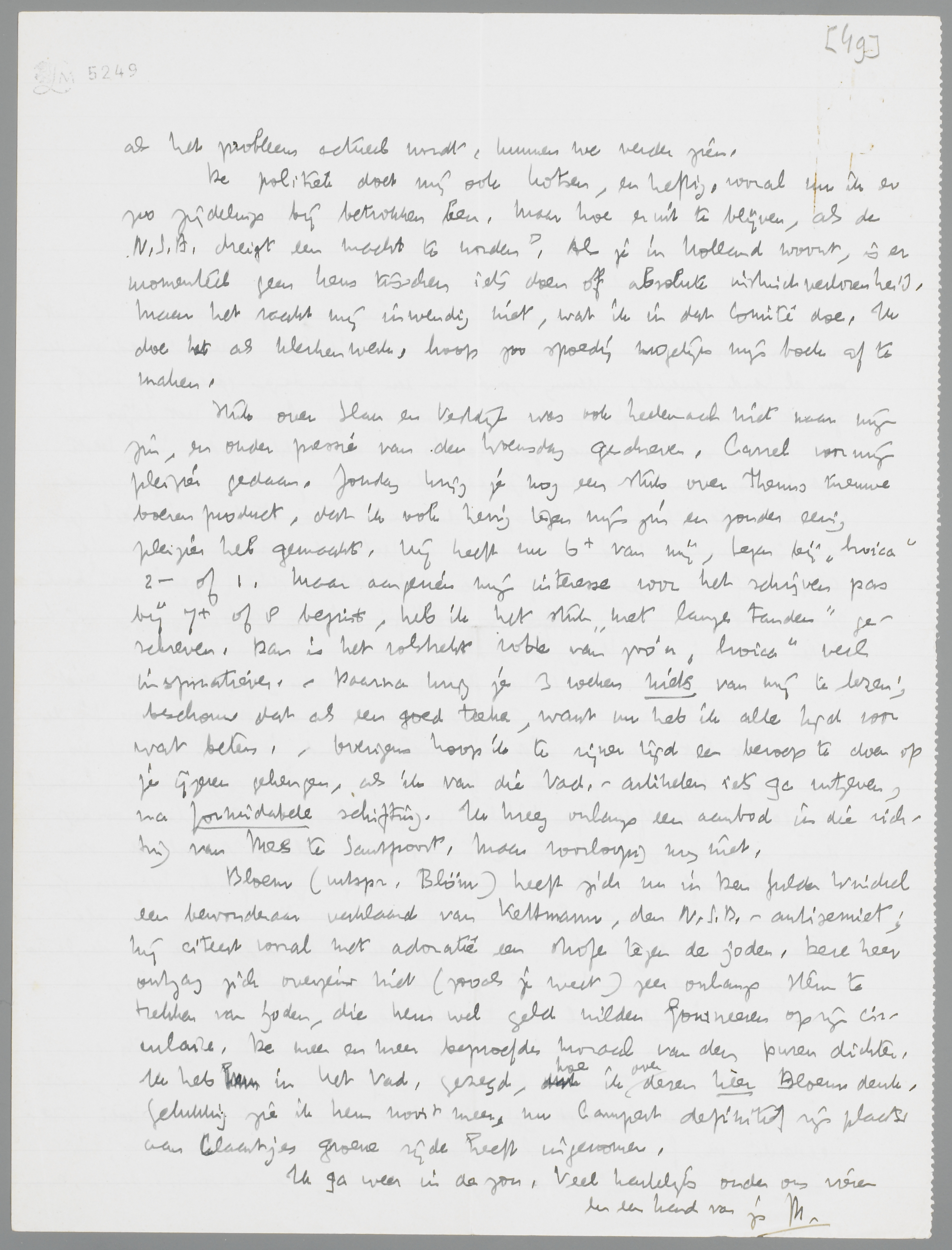 De politiek doet mij ook kotsen, en heftig, vooral nu ik er zoo zijdelings bij betrokken ben. Maar hoe er uit te blijven, als de N.S.B. dreigt een macht te worden? Als je in Holland woont, is er momenteel geen keus tusschen iets doen of absolute instinctverlorenheid. Maar het raakt mij inwendig niet, wat ik in dat comité doe. Ik doe het als klerkenwerk, hoop zoo spoedig mogelijk mijn boek af te maken.