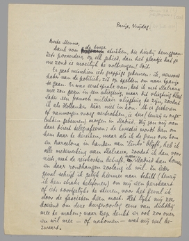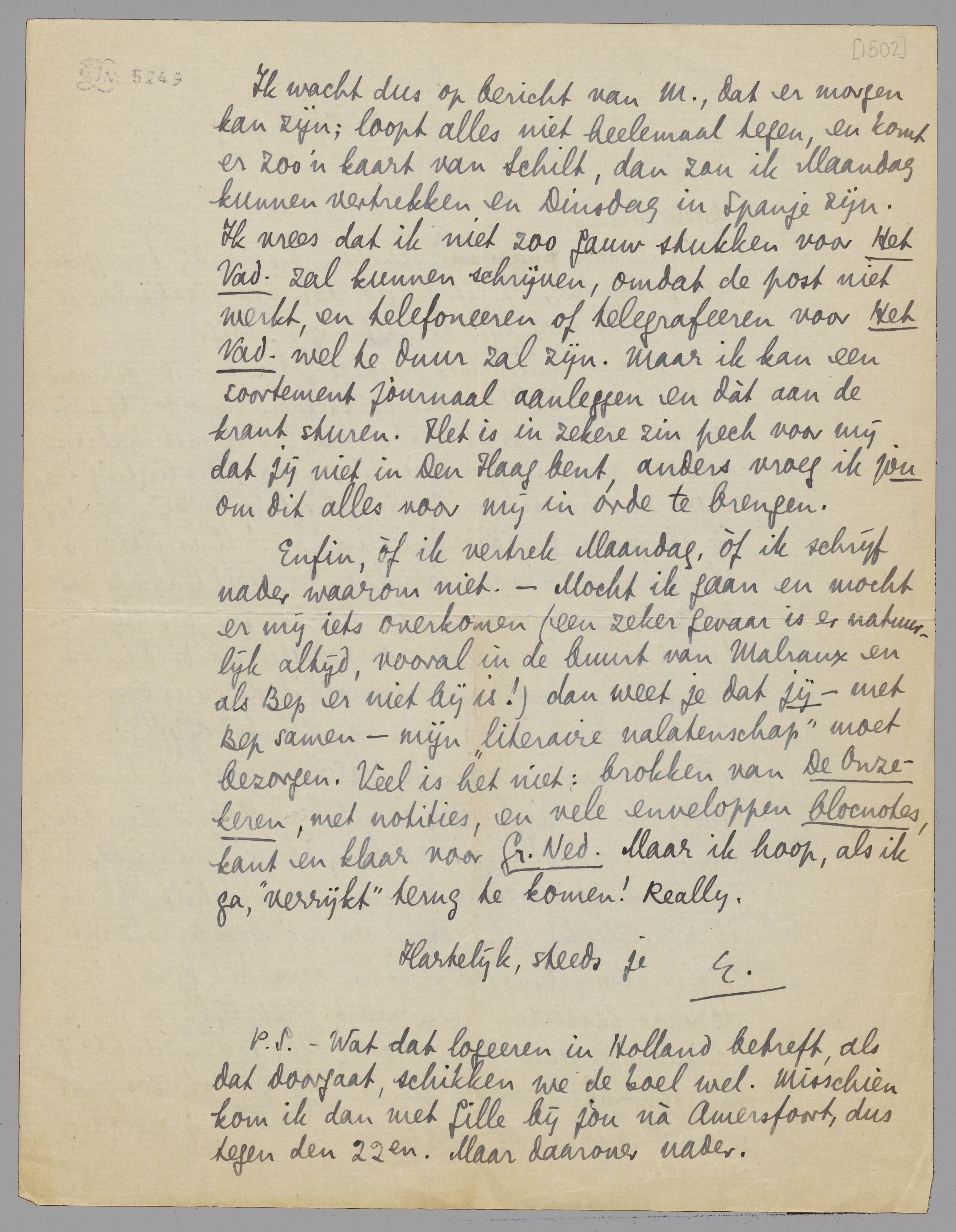 Enfin, òf ik vertrek Maandag, òf ik schrijf nader waarom niet. - Mocht ik gaan en mocht er mij iets overkomen (een zeker gevaar is er natuurlijk altijd, vooral in de buurt van Malraux en als Bep er niet bij is!) dan weet je dat jij - met Bep samen - mijn ‘literaire nalatenschap’ moet bezorgen. Veel is het niet: brokken van De Onzekeren, met notities, en vele enveloppen blocnotes, kant en klaar voor Gr. Ned. Maar ik hoop, als ik ga, ‘verrijkt’ terug te komen! Really.