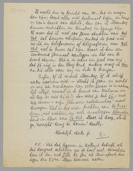 P.S. - Wat dat logeeren in Holland betreft, als dat doorgaat, schikken we de boel wel. Misschien kom ik dan met Gille bij jou nà Amersfoort, dus tegen den 22en. Maar daarover nader.