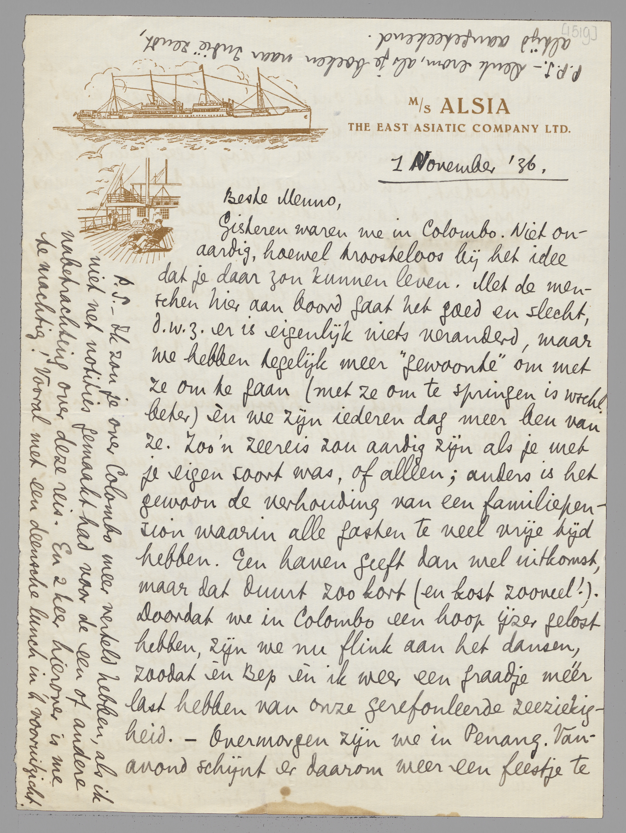 Gisteren waren we in Colombo. Niet onaardig, hoewel troosteloos bij het idee dat je daar zou kunnen leven. Met de menschen hier aan boord gaat het goed en slecht, d.w.z. er is eigenlijk niets veranderd, maar we hebben tegelijk meer ‘gewoonte’ om met ze om te gaan (met ze om te springen is wschl. beter) èn we zijn iederen dag meer beu van ze. Zoo'n zeereis zou aardig zijn als je met je eigen soort was, of alleen; anders is het gewoon de verhouding van een familiepension waarin alle gasten te veel vrije tijd hebben. Een haven geeft dan wel uitkomst, maar dat duurt zoo kort (en kost zooveel!). Doordat we in Colombo een hoop ijzer gelost hebben, zijn we nu flink aan het dansen, zoodat èn Bep èn ik weer een graadje méér last hebben van onze gerefouleerde zeeziekigheid. - Overmorgen zijn we in Penang. Vanavond schijnt er daarom weer een feestje te moeten zijn, en dat is wel het ergste van de heele bedoening. Als dàt ons tenminste bespaard werd!