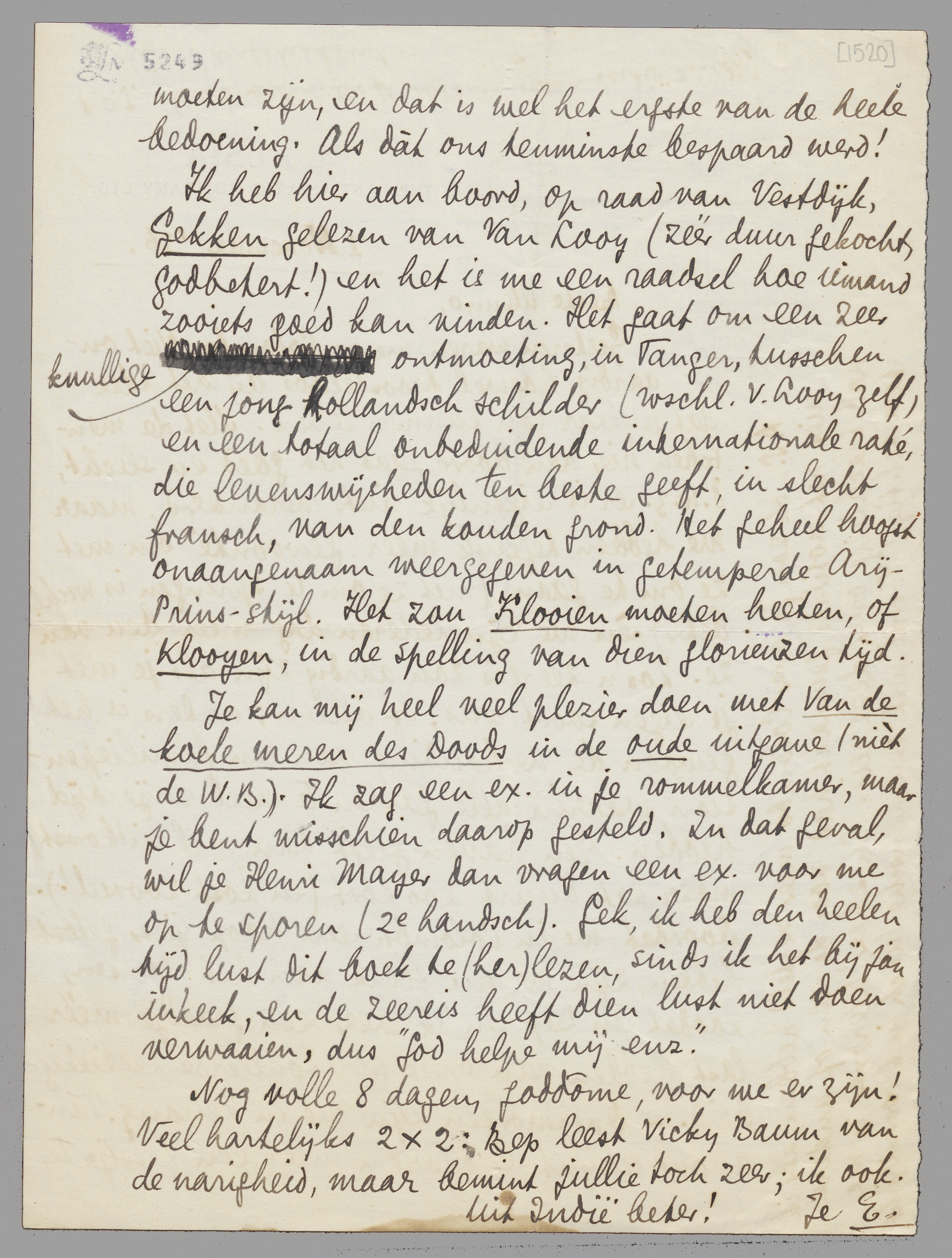 Ik heb hier aan boord, op raad van Vestdijk, Gekken gelezen van Van Looy (zéér duur gekocht, godbetert!) en het is me een raadsel hoe iemand zooiets goed kan vinden. Het gaat om een zeer knullige ontmoeting, in Tanger, tusschen een jong hollandsch schilder (wschl. V. Looy zelf) en een totaal onbeduidende internationale raté, die levenswijsheden ten beste geeft, in slecht fransch, van den kouden grond. Het geheel hoogst onaangenaam weergegeven in getemperde Arij-Prins-stijl. Het zou Klooien moeten heeten, Klooyen, in de spelling van dien glorieuzen tijd.