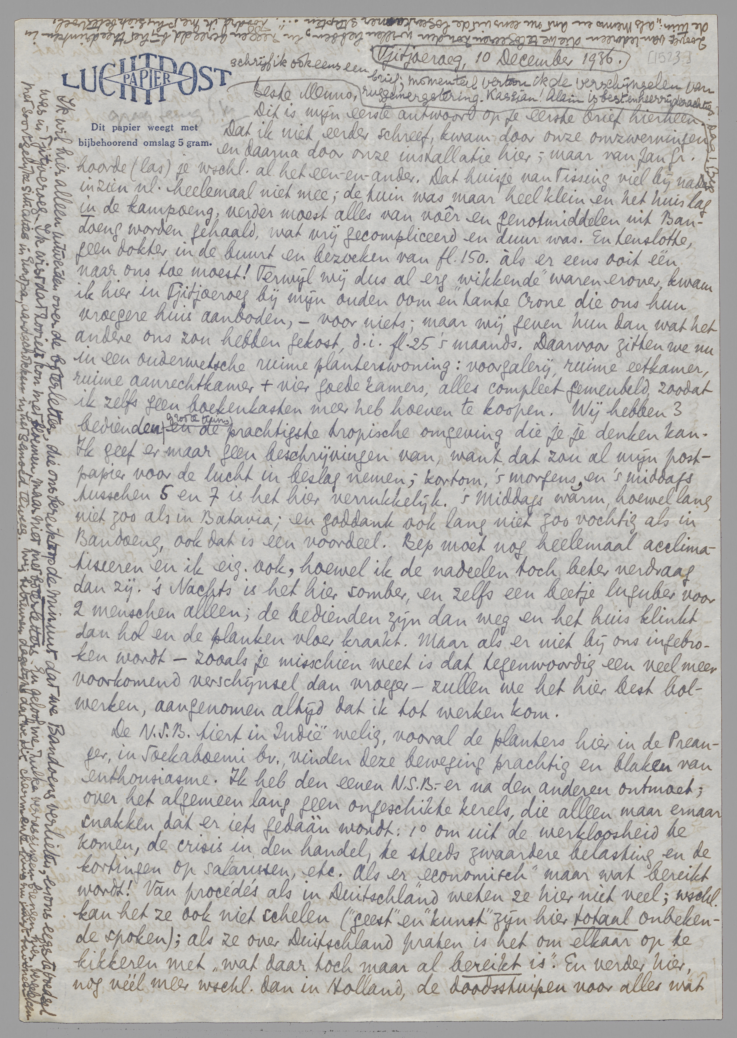 Dit is mijn eerste antwoord op je eerste brief hierheen. Dat ik niet eerder schreef, kwam door onze omzwervingen en daarna door onze installatie hier; maar van Jan Gr. hoorde (las) je wrschl. al het een-en-ander. Dat huisje van Tissing viel bij nader inzien nl. heelemaal niet mee; de tuin was maar heel klein en het huis lag in de kampoeng, verder moest alles van voêr en genotmiddelen uit Bandoeng worden gehaald, wat vrij gecompliceerd en duur was. En tenslotte, geen dokter in de buurt en bezoeken van fl. 150. àls er eens ooit één naar ons toe moest! Terwijl wij dus al erg ‘wikkende’ waren erover, kwam ik hier in Tjitjoeroeg bij mijn ouden oom en tante Crone die ons hun vroegere huis aanboden, - voor niets; maar wij geven hun dan wat het andere ons zou hebben gekost, d.i. fl. 25 's maands. Daarvoor zitten we nu in een ouderwetsche ruime planterswoning: voorgalerij, ruime eetkamer, ruime aanrechtkamer + vier goede kamers, alles compleet gemeubeld, zoodat ik zelfs geen boekenkast meer heb hoeven te koopen. Wij hebben 3 bedienden, groote tuin, en de prachtigste tropische omgeving die je je denken kan. Ik geef er maar geen beschrijvingen van, want dat zou al mijn postpapier voor de lucht in beslag nemen; kortom, 's morgens, en 's middags tusschen 5 en 7 is het hier verrukkelijk. 's Middags warm, hoewel lang niet zoo als in Batavia; en goddank ook lang niet zoo vochtig als in Bandoeng, ook dat is een voordeel. Bep moet nog heelemaal acclimatiseeren en ik eig. ook, hoewel ik de nadeelen toch beter verdraag dan zij. 's Nachts is het hier somber, en zelfs een beetje luguber voor 2 menschen alleen; de bedienden zijn dan weg en het huis klinkt dan hol en de planken vloer kraakt. Maar als er niet bij ons ingebroken wordt - zooals je misschien weet is dat tegenwoordig een veel meer voorkomend verschijnsel dan vroeger - zullen we het hier best bolwerken, aangenomen altijd dat ik tot werken kom.