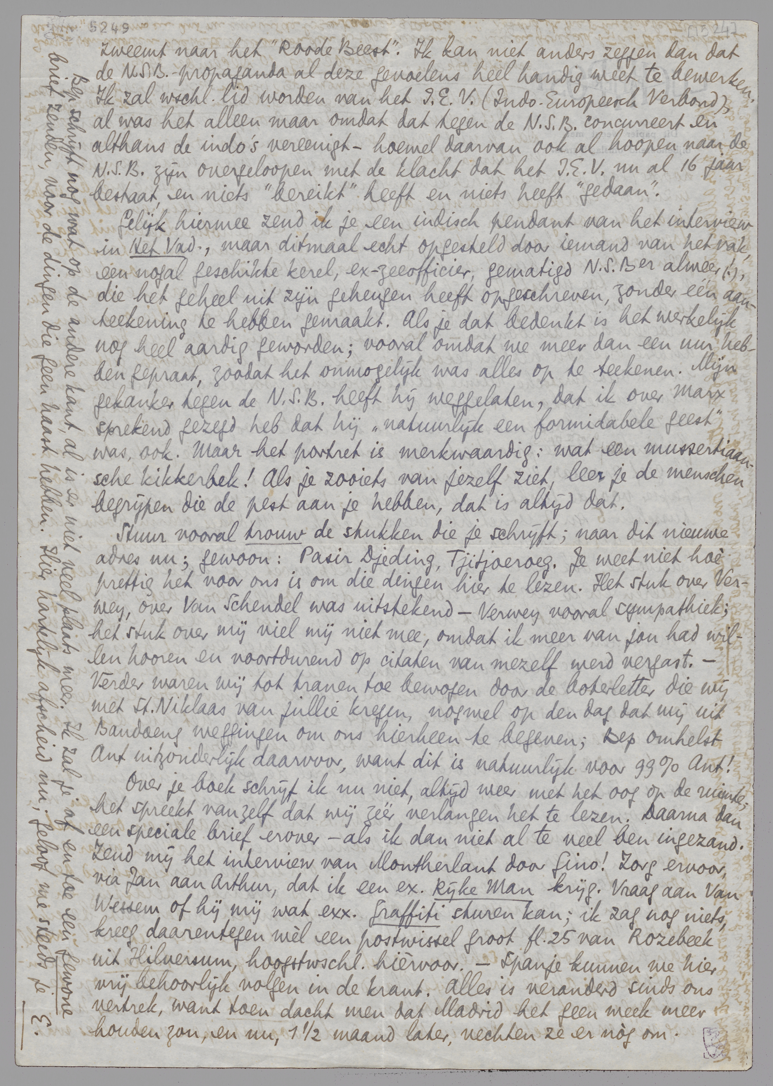 Gelijk hiermee zend ik je een indisch pendant van het interview in Het Vad., maar ditmaal echt opgesteld door iemand van het vak, een nogal geschikte kerel, ex-zeeofficier, gematigd N.S.B.-er alweer (!), die het geheel uit zijn geheugen heeft opgeschreven, zonder één aanteekening te hebben gemaakt. Als je dat bedenkt is het werkelijk nog heel aardig geworden; vooral omdat we meer dan een uur hebben gepraat, zoodat het onmogelijk was alles op te teekenen. Mijn gekanker tegen de N.S.B. heeft hij weggelaten, dat ik over Marx sprekend gezegd heb dat hij ‘natuurlijk een formidabele geest’ was, ook. Maar het portret is merkwaardig: wat een mussertiaansche kikkerbek! Als je zooiets van jezelf ziet, leer je de menschen begrijpen die de pest aan je hebben, dat is altijd dat.