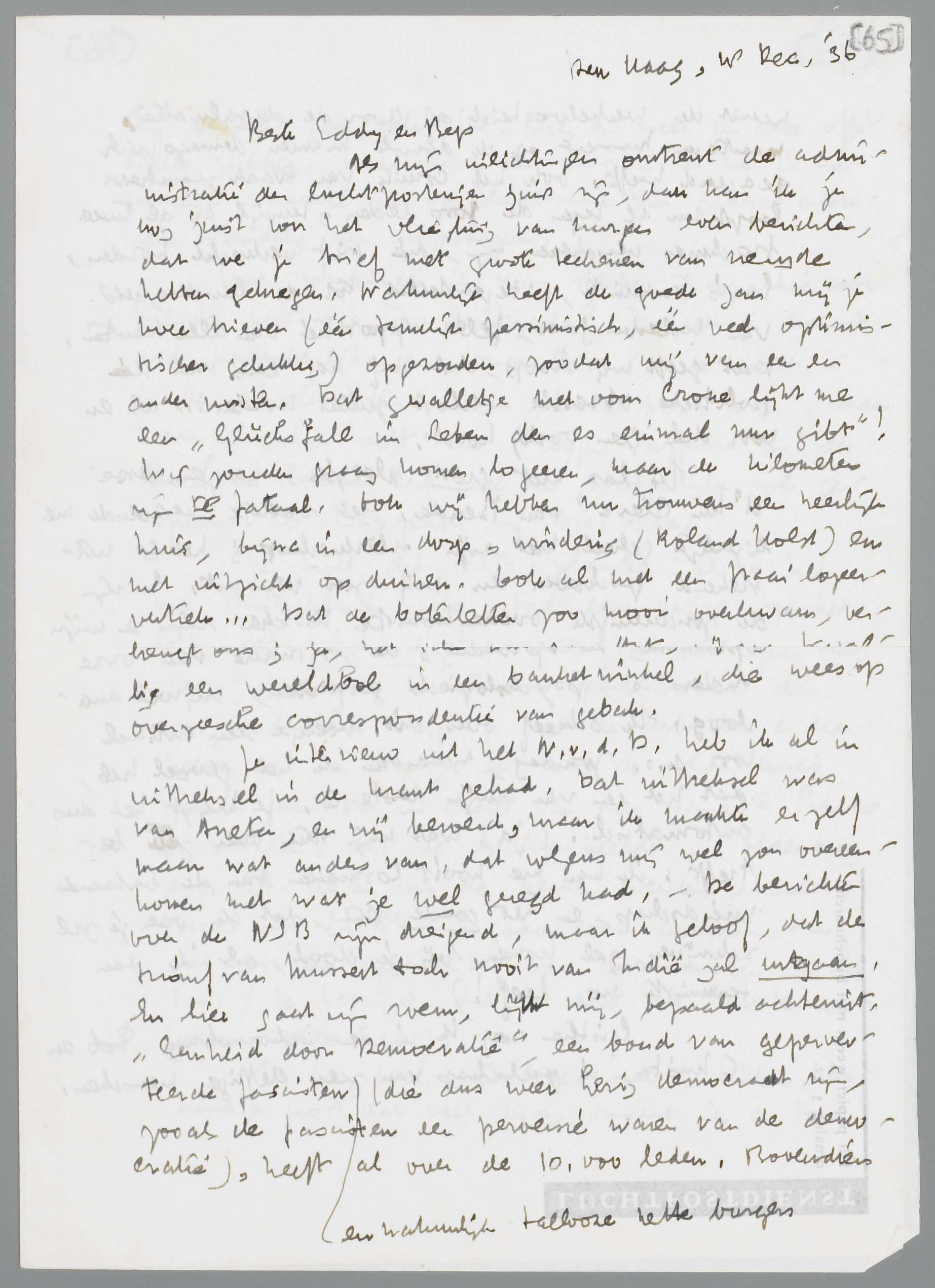 Je interview uit het N.v.d.D. heb ik al in uittreksel in de krant gehad. Dat uittreksel was van Aneta, en vrij beroerd, maar ik maakte er zelf maar wat anders van, dat volgens mij wel zou overeenkomen met wat je wel gezegd had. - De berichten over de N.S.B. zijn dreigend, maar ik geloof, dat de triomf van Mussert toch nooit van Indië zal uitgaan. En hier gaat zijn roem, lijkt mij, bepaald achteruit. Eenheid door Democratie, een bond van geperverteerde fascisten [en natuurlijk tallooze nette burgers] (die dus weer hevig democraat zijn, zooals de fascisten een perversie waren van de democratie), heeft al over de 10.000 leden. Bovendien neemt de werkeloosheid af door de devaluatie, waartegen Mussert op de domste manier demagogisch geageerd heeft. Ook het Comité van Waakzaamheid loopt nu al tegen de 1000 leden, terwijl er al twee brochures verschenen zijn, die grif verkocht worden. Er is tenminste, in tegenstelling tot de landerigheid van verleden jaar, felle oppositie van alle kanten. Dat geeft mij hoop, dat wij nog eens van die politieke obsessie verlost zullen worden... als er voor dien geen oorlog komt.