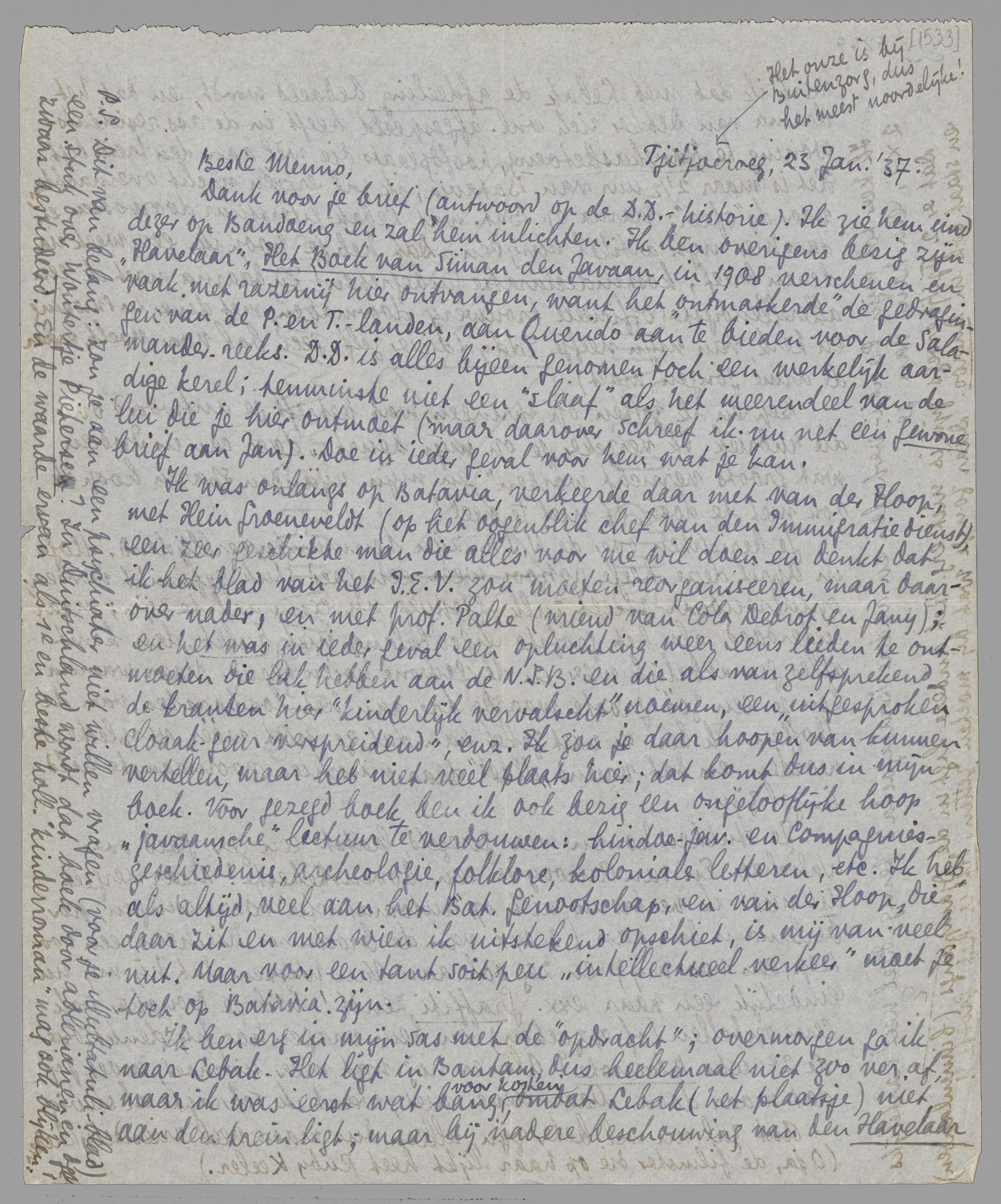 Ik ben erg in mijn sas met de ‘opdracht’; overmorgen ga ik naar Lebak. Het ligt in Bantam, dus heelemaal niet zoo ver af, maar ik was eerst wat bang voor kosten, omdat Lebak (het plaatsje) niet aan den trein ligt; maar bij nadere beschouwing van den Havelaar merk ik dat met Lebak de afdeeling bedoeld wordt, en dat het drama van Dekker zich vnl. afgespeeld heeft in de ass. residents-woning te Rangkasbetoeng, hoofdplaats die wèl aan den trein ligt. Het is maar 2 1/2 uur van Batavia; ik zal er één nacht overnachten, voor de ‘sfeer’; daarna op Bat. wat Lebak-literatuur doorvossen en dan hier mijn artikel schrijven. Dat heb je, hoop ik, een week na dezen brief; kostendeclaratie inbegrepen! En daarna moet ik een allerellendigste officieele trouwerij doormaken, met diner in smoking en kerk, van mijn neefje Eddy (die er zelf geen bal voor voelt, maar de arme jongen moèt).