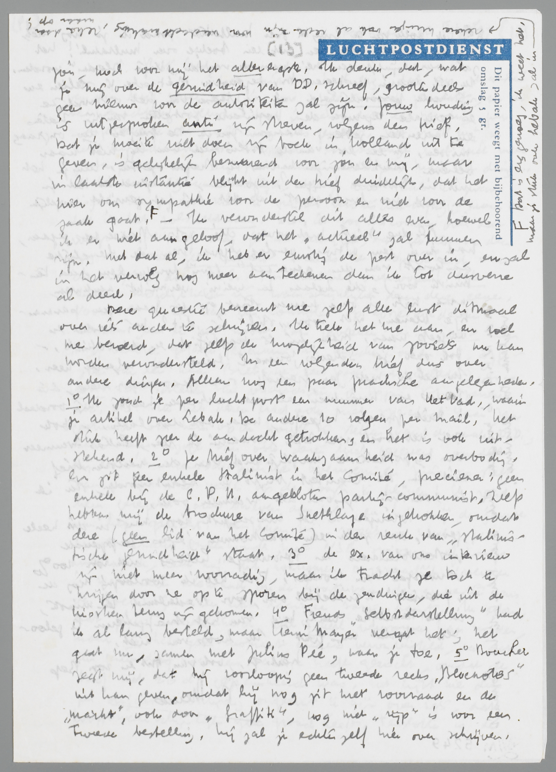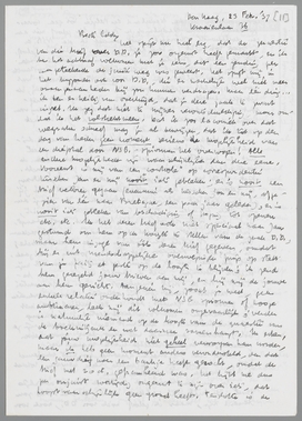 Deze quaestie beneemt me zelfs alle lust ditmaal over iets anders te schrijven. Ik trek het me aan, en voel me beroerd, dat zelfs de mogelijkheid van zooiets nu kan worden verondersteld. In een volgenden brief dus over andere dingen. Alleen nog een paar practische aangelegenheden. 1e Ik zond je per luchtpost een nummer van Het Vad., waarin je artikel over Lebak. De andere 10 volgen per mail. Het stuk heeft zeer de aandacht getrokken, en het is ook uitstekend. 2e Je brief over Waakzaamheid was overbodig. Er zit geen enkele Stalinist in het Comité, preciezer: geen enkele bij de C.P.H. aangesloten partij-communist. Zelfs hebben wij de brochure van Snethlage ingetrokken, omdat deze (geen lid van het comité) in den reuk van ‘Stalinistische gezindheid’ staat. 3e de ex. van ons interview zijn niet meer voorradig, maar ik tracht ze toch te krijgen door ze op te sporen bij de zendingen, die uit de kiosken terug zijn gekomen. 4e Freuds Selbstdarstellung had ik al lang besteld, maar Henri Mayer vergat het; het gaat nu, samen met Julius Pée, naar je toe. 5e Boucher zegt mij, dat hij voorloopig geen tweede reeks Blocnotes uit kan geven, omdat hij nog zit met voorraad en de ‘markt’, ook door Graffiti, nog niet ‘rijp’ is voor een tweede bestelling. Hij zal je echter zelf hier over schrijven. 6e Het boek van De Gruyter over Multatuli zond ik je nog niet, omdat... ik zelf bezig ben met een boekje over Multatuli! Het zal waarschijnlijk een Meinummer van de Vrije Bladen worden. Ik wil daarin probeeren M. tegenover Nietzsche te stellen en zijn heele persoonlijkheid als synthese van het onmogelijke en geniale tegenover de populaire portretten van zijn haters en vereerders zetten. Daarom zou ik De Gruyter nu ongraag missen. In een ex. van de bibliotheek kan ik niet naar believen kantteekeningen maken en strepen zetten. Kun je het niet in Batavia krijgen? Zoo neen, dan zend ik het je omgaand per luchtpost, als dat bij het gewicht mogelijk is.