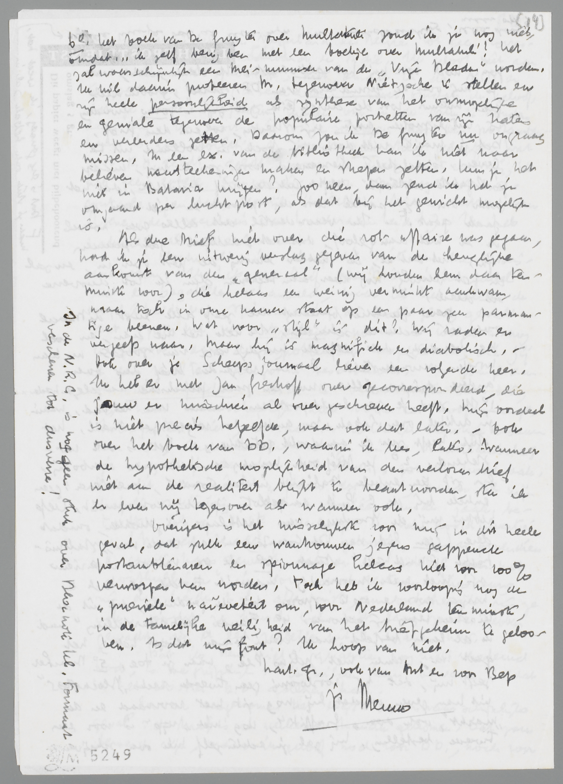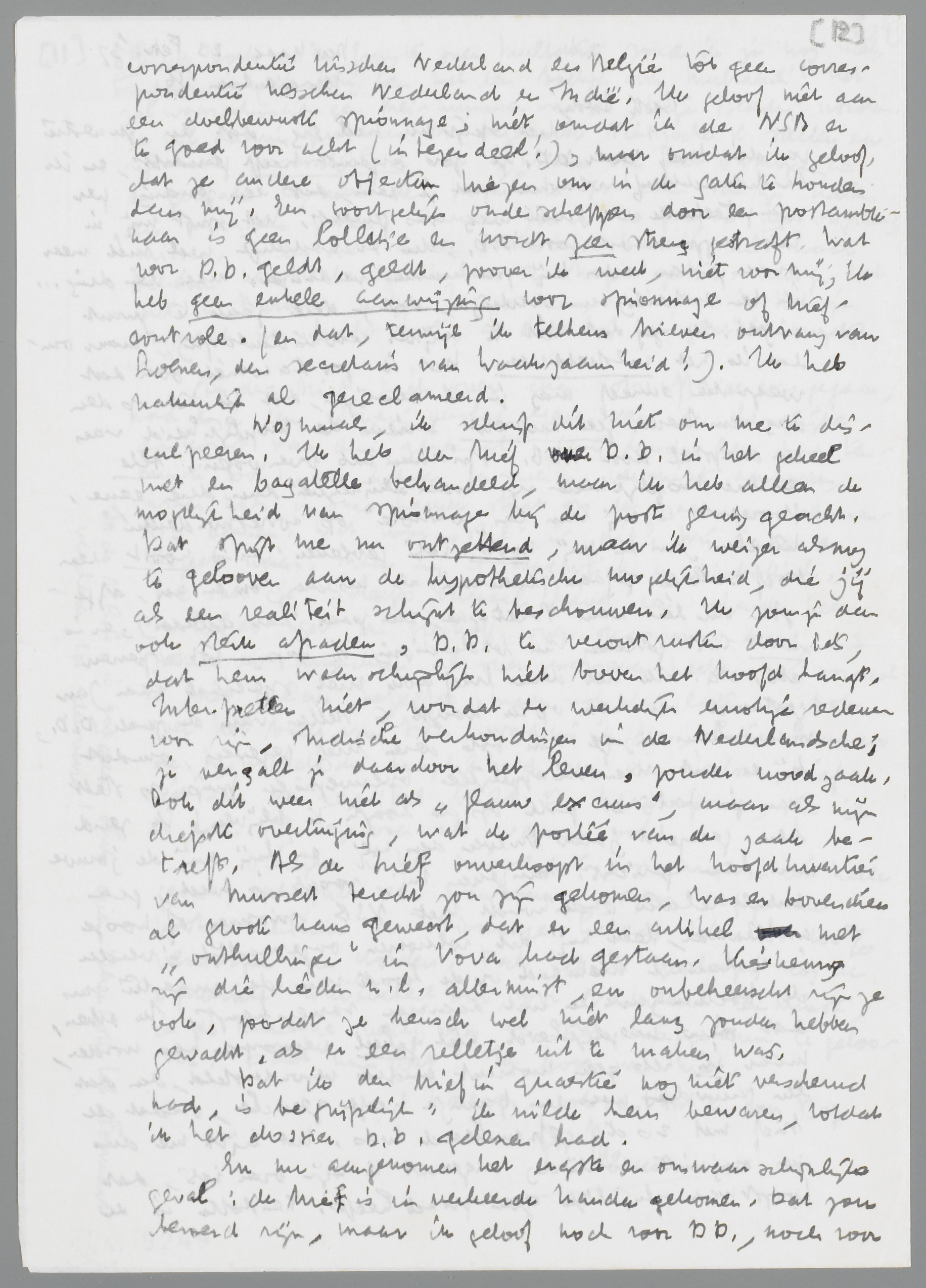Nogmaals, ik schrijf dit niet om me te disculpeeren. Ik heb den brief over D.D. in het geheel niet en bagatelle behandeld, maar ik heb alleen de mogelijkheid van spionnage bij de post gering geacht. Dat spijt me nu ontzettend, maar ik weiger alsnog te gelooven aan de hypothetische mogelijkheid, die jij als een realiteit schijnt te beschouwen. Ik zou je dan ook sterk afraden, D.D. te verontrusten door iets, dat hem waarschijnlijk niet boven het hoofd hangt. Interpreteer niet, voordat er werkelijk ernstige redenen voor zijn, Indische verhoudingen in de Nederlandsche: je vergalt je daardoor het leven, zonder noodzaak. Ook dit weer niet als ‘flauw excuus’, maar als mijn diepste overtuiging, wat de portée van de zaak betreft. Als de brief onverhoopt in het hoofdkwartier van Mussert terecht zou zijn gekomen, was er bovendien al groote kans geweest, dat er een artikel met ‘onthullingen’ in Vova had gestaan. Kieskeurig zijn die lieden n.l. allerminst, en onbeheerscht zijn ze ook, zoodat ze heusch wel niet lang zouden hebben gewacht, als er een relletje uit te maken was.
