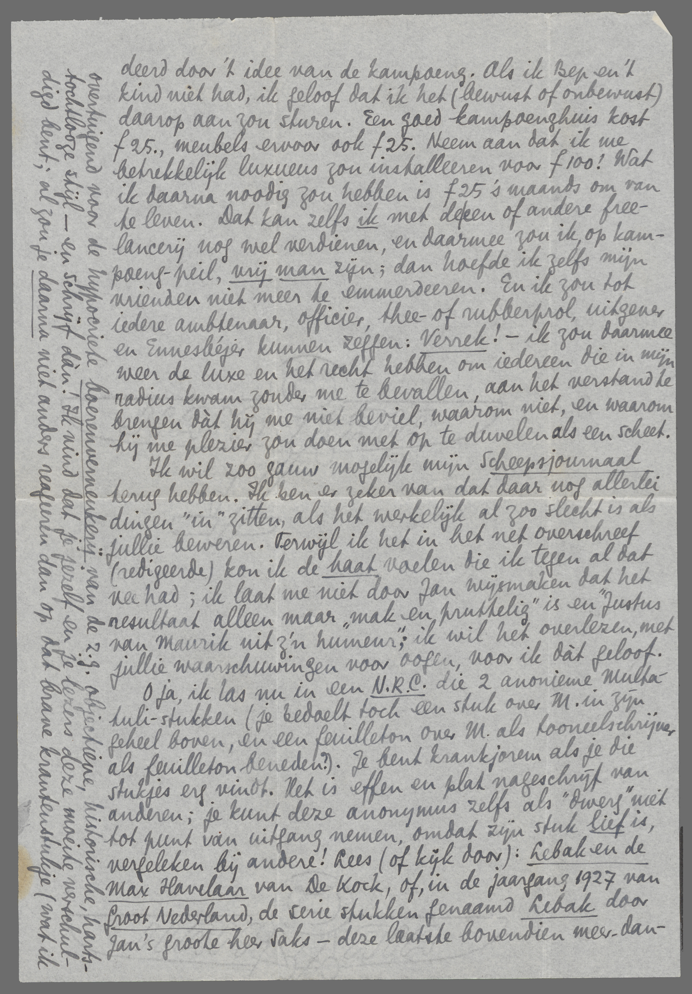 Ik doe mijn best, maar ben al het optimisme kwijt waarmee ik je een paar dagen geleden nog schreef over mijn ‘mogelijkheden’ in dit land (brief aan Rudie gezonden). Ik geloof nu dat het voortdurend zal neerkomen op veel gelul, veel gefrunnik, een theater van bedrijvigheid van alle kanten, voor tenslotte een scheeve positie, waar ik ieder oogenblik weer uit kan liggen, door eigen drang of door een kleine intrige van de menschen die ik tòch altijd als mijn vijanden zal blijven zien. – Ik ben al deze dagen geobsedeerd door 't idee van de kampoeng. Als ik Bep en 't kind niet had, ik geloof dat ik het (bewust of onbewust) daarop aan zou sturen. Een goed kampoenghuis kost f25., meubels ervoor ook f25. Neem aan dat ik me betrekkelijk luxueus zou installeeren voor f100! Wat ik daarna noodig zou hebben is f25 ’s maands om van te leven. Dat kan zelfs ik met de een of andere freelancerij nog wel verdienen, en daarmee zou ik, op kampoeng-peil, vrij man zijn; dan hoefde ik zelfs mijn vrienden niet meer te emmerdeeren. En ik zou tot iedere ambtenaar, officier, thee- of rubberprol, uitgever en Ennesbéjer kunnen zeggen: Verrek! – ik zou daarmee weer de luxe en het recht hebben om iedereen die in mijn radius kwam zonder me te bevallen, aan het verstand te brengen dàt hij me niet beviel, waarom niet, en waarom hij me plezier zou doen met op te duvelen als een scheet.