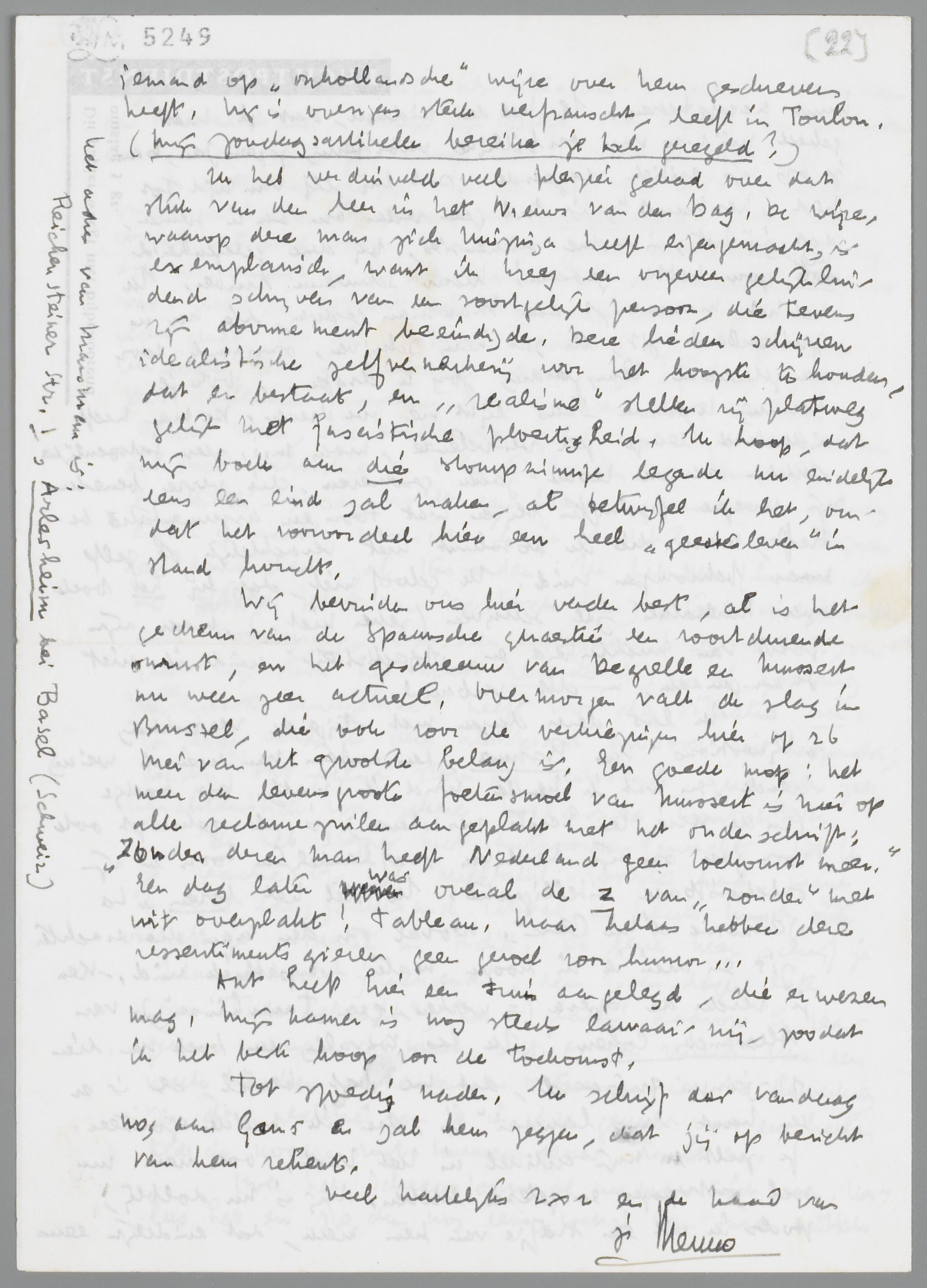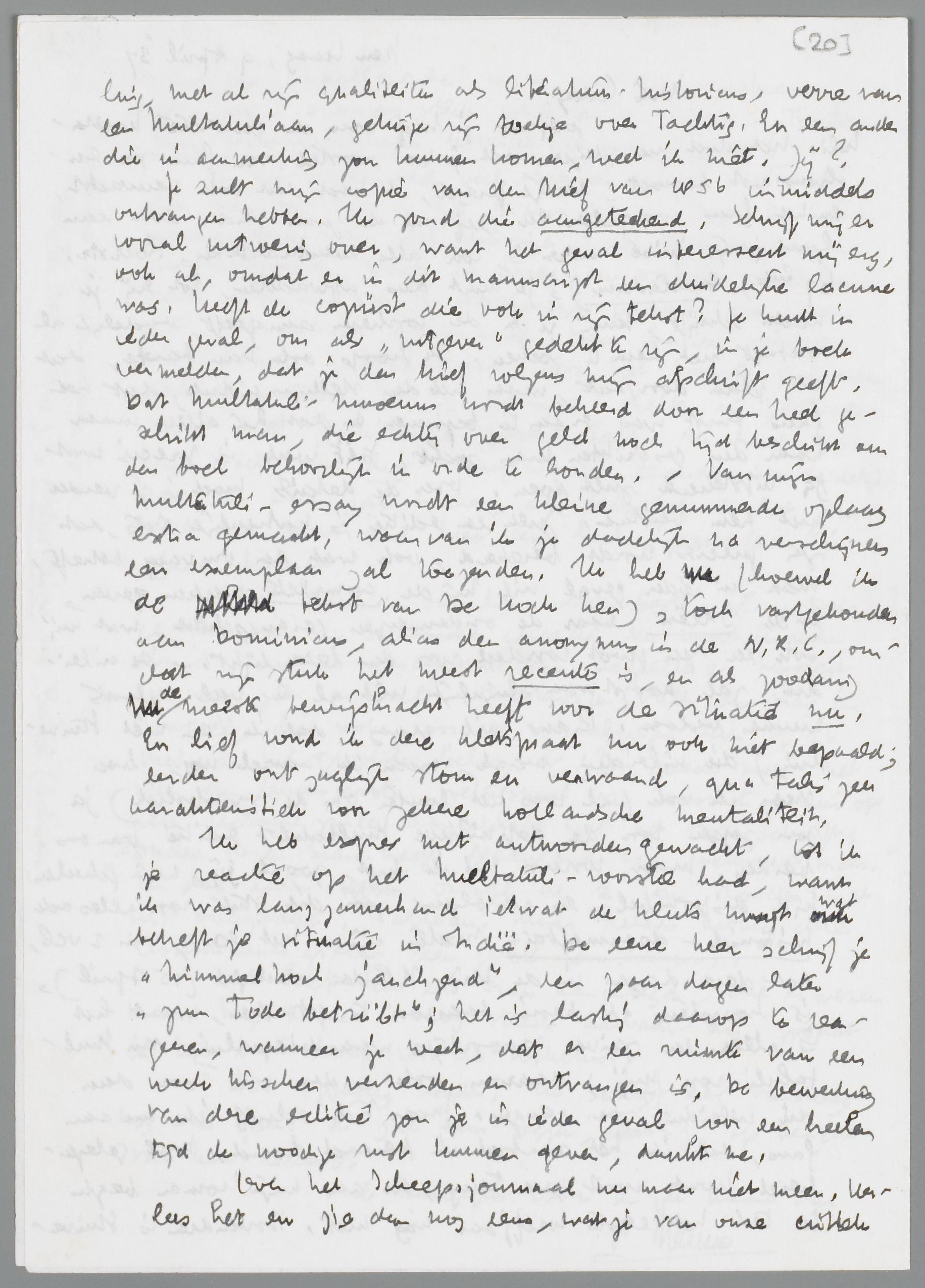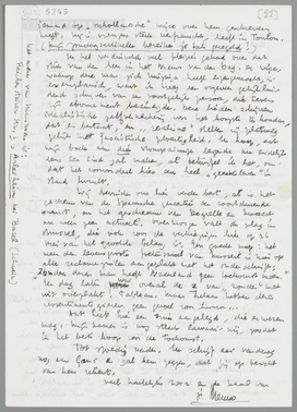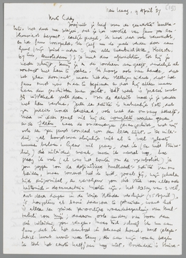 Je zult mijn copie van den brief van 1856 inmiddels ontvangen hebben. Ik zond die aangeteekend. Schrijf mij er vooral uitvoerig over, want het geval interesseert mij erg, ook al, omdat er in dit manuscript een duidelijke lacune was. Heeft de copiïst die ook in zijn tekst? Je kunt in ieder geval, om als ‘uitgever’ gedekt te zijn, in je boek vermelden, dat je den brief volgens mijn afschrift geeft. Dat Multatuli-museum wordt beheerd door een heel geschikt man, die echter over geld noch tijd beschikt om den boel behoorlijk in orde te houden. - Van mijn Multatuli-essay wordt een kleine genummerde oplaag extra gemaakt, waarvan ik je dadelijk na verschijnen een exemplaar zal toezenden. Ik heb nu (hoewel ik de tekst van De Kock ken), toch vastgehouden aan Dominicus, alias den anonymus in de N.R.C., omdat zijn stuk het meest recente is, en als zoodanig de meeste bewijskracht heeft voor de situatie nu. En lief vond ik deze kletspraat nu ook niet bepaald; eerder ontzaglijk stom en verwaand, qua talis zeer karakteristiek voor zekere hollandsche mentaliteit.