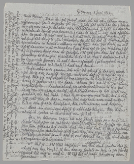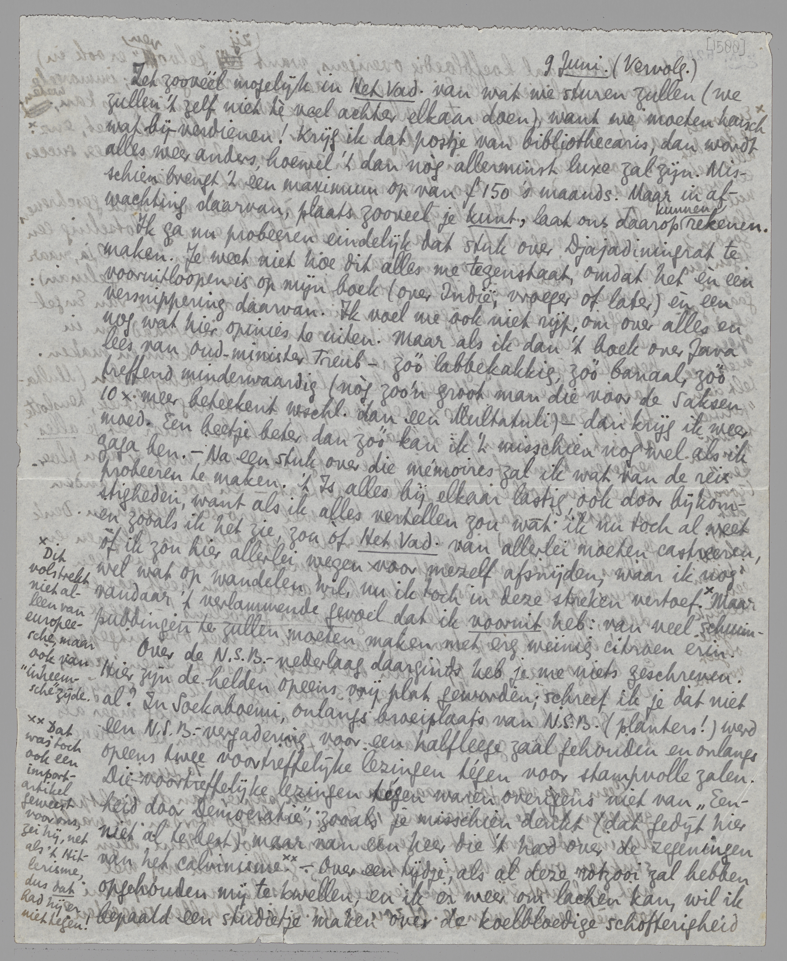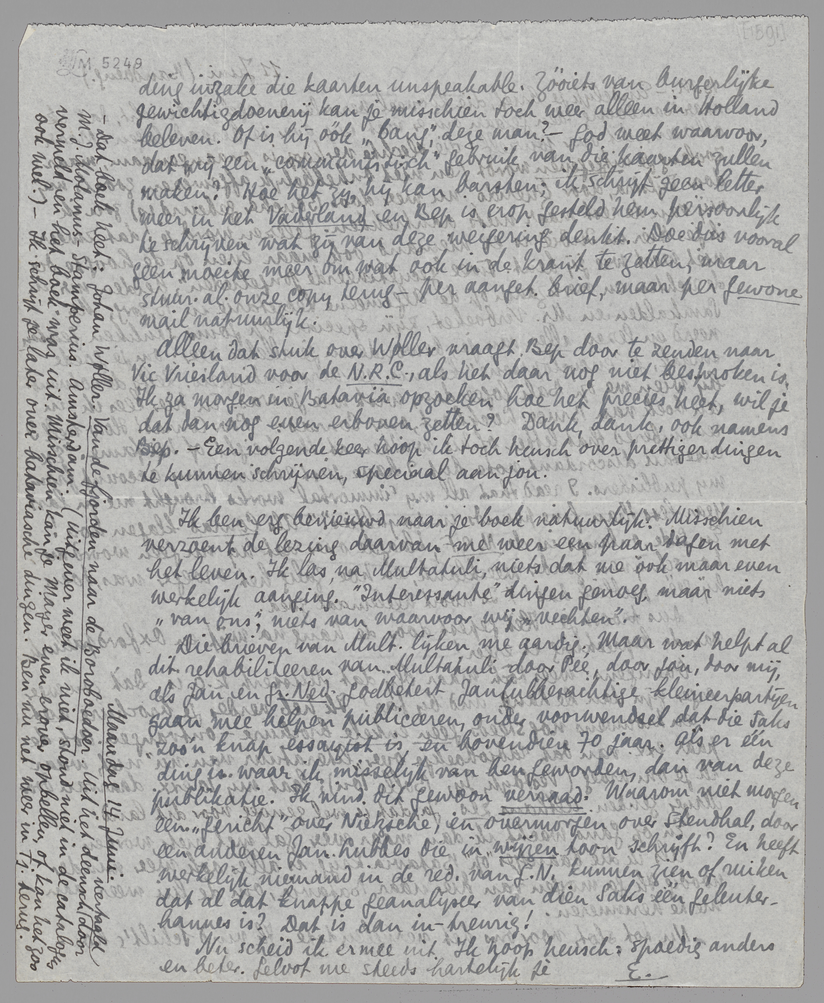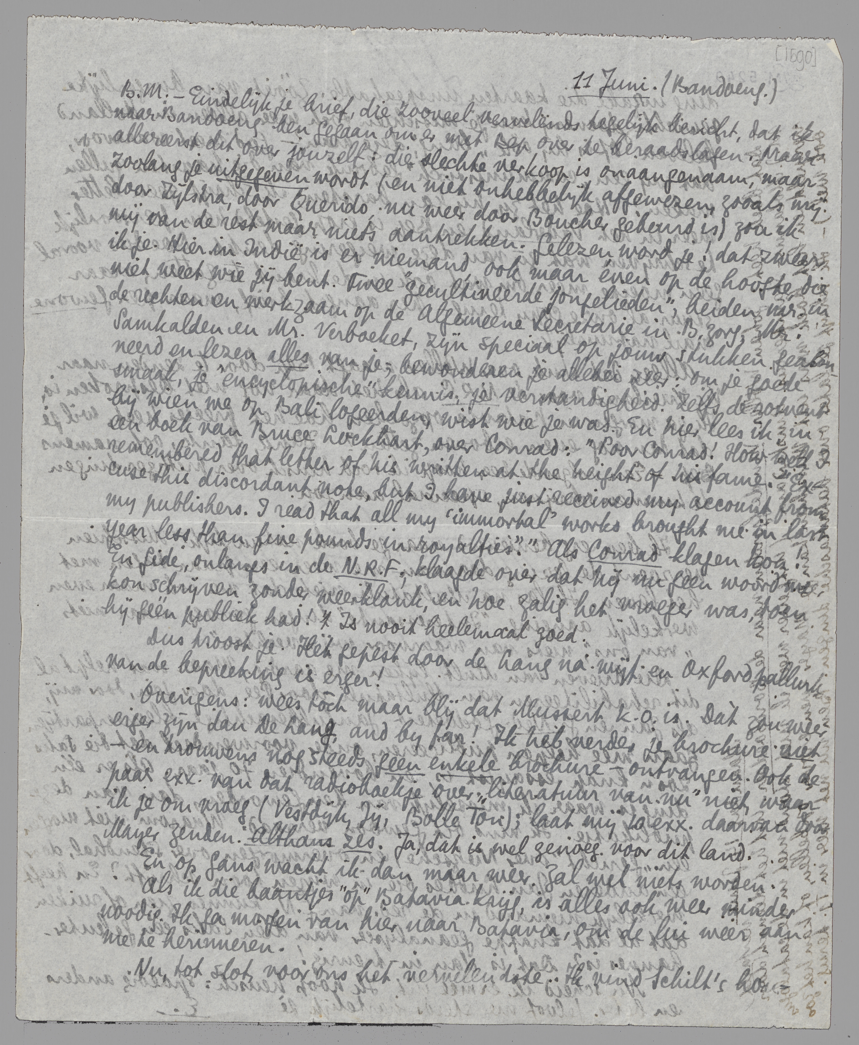 2o. Wil je - dit niet vergeten! - mij nogmaals het stuk zenden dat je schreef over Bep Vuyk? Ik ben daarop gesteld en Bep is zoo slordig geweest het weg te maken. Ik heb het nl. naar Bandoeng doorgezonden.