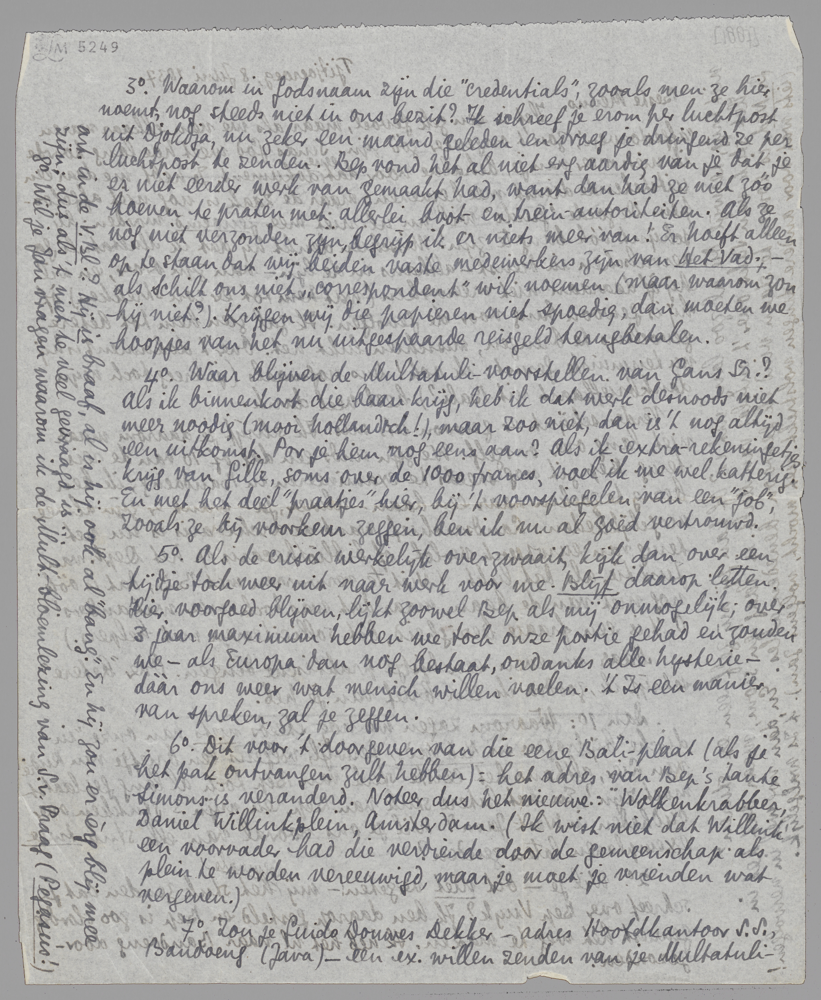 5o. Als de crisis werkelijk overzwaait, kijk dan over een tijdje toch weer uit naar werk voor me. Blijf daarop letten. Hier voorgoed blijven, lijkt zoowel Bep als mij onmogelijk; over 3 jaar maximum hebben we toch onze portie gehad en zouden we - als Europa dan nog bestaat, ondanks alle hysterie - dààr ons weer wat mensch willen voelen. 't Is een manier van spreken, zal je zeggen.