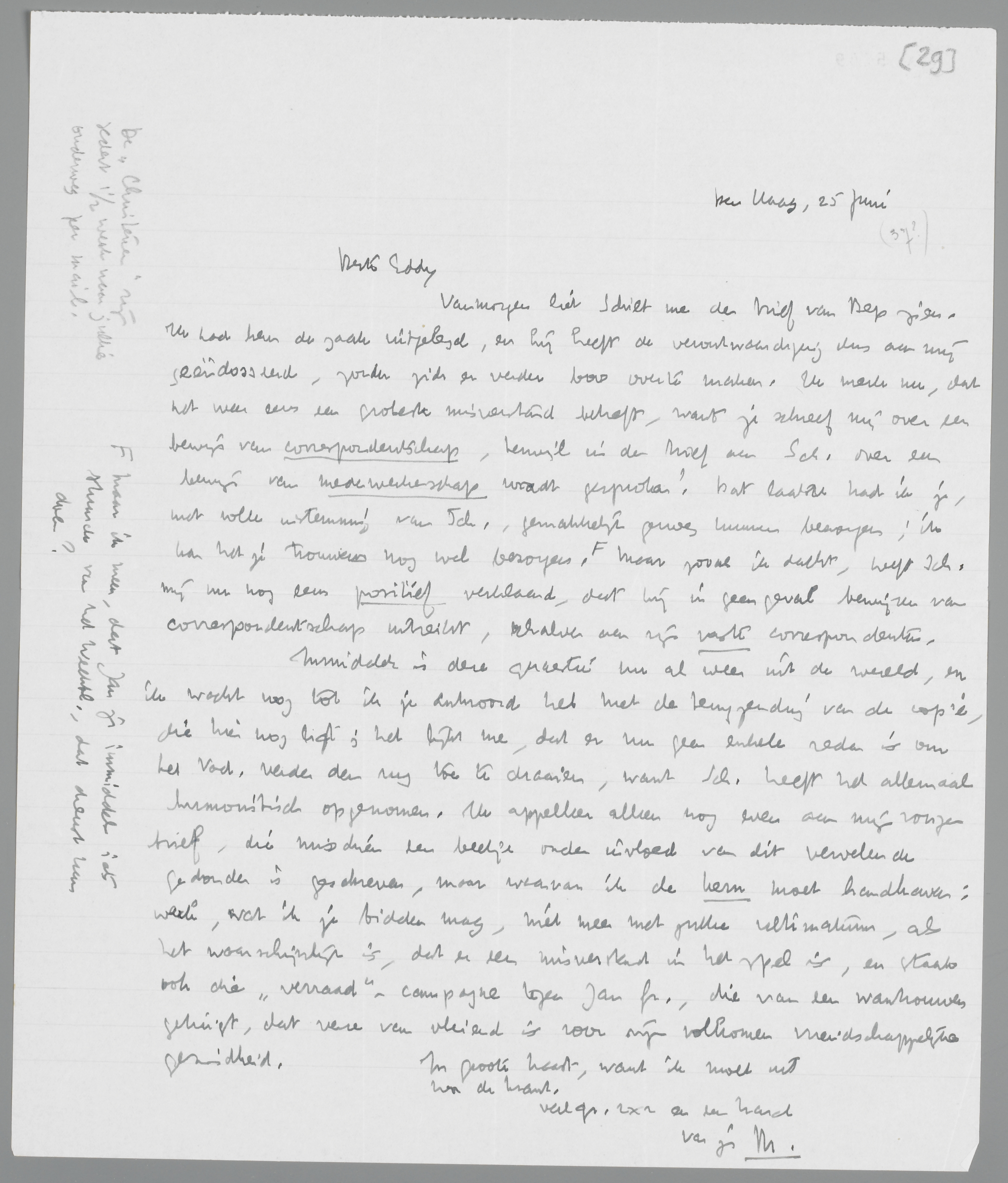 Inmiddels is deze quaestie nu al weer uit de wereld, en ik wacht nog tot ik je antwoord heb met de terugzending van de copie, die hier nog ligt; het lijkt me, dat er nu geen enkele reden is om Het Vad. verder den rug toe te draaien, want Sch. heeft het allemaal humoristisch opgenomen. Ik appelleer alleen nog even aan mijn vorigen brief, die misschien een beetje onder invloed van dit vervelende gedonder is geschreven, maar waarvan ik de kern moet handhaven: werk, wat ik je bidden mag, niet meer met zulke ultimatums, als het waarschijnlijk is, dat er een misverstand in het spel is, en staak ook die ‘verraad’-campagne tegen Jan Gr., die van een wantrouwen getuigt, dat verre van vleiend is voor zijn volkomen vriendschappelijke gezindheid.