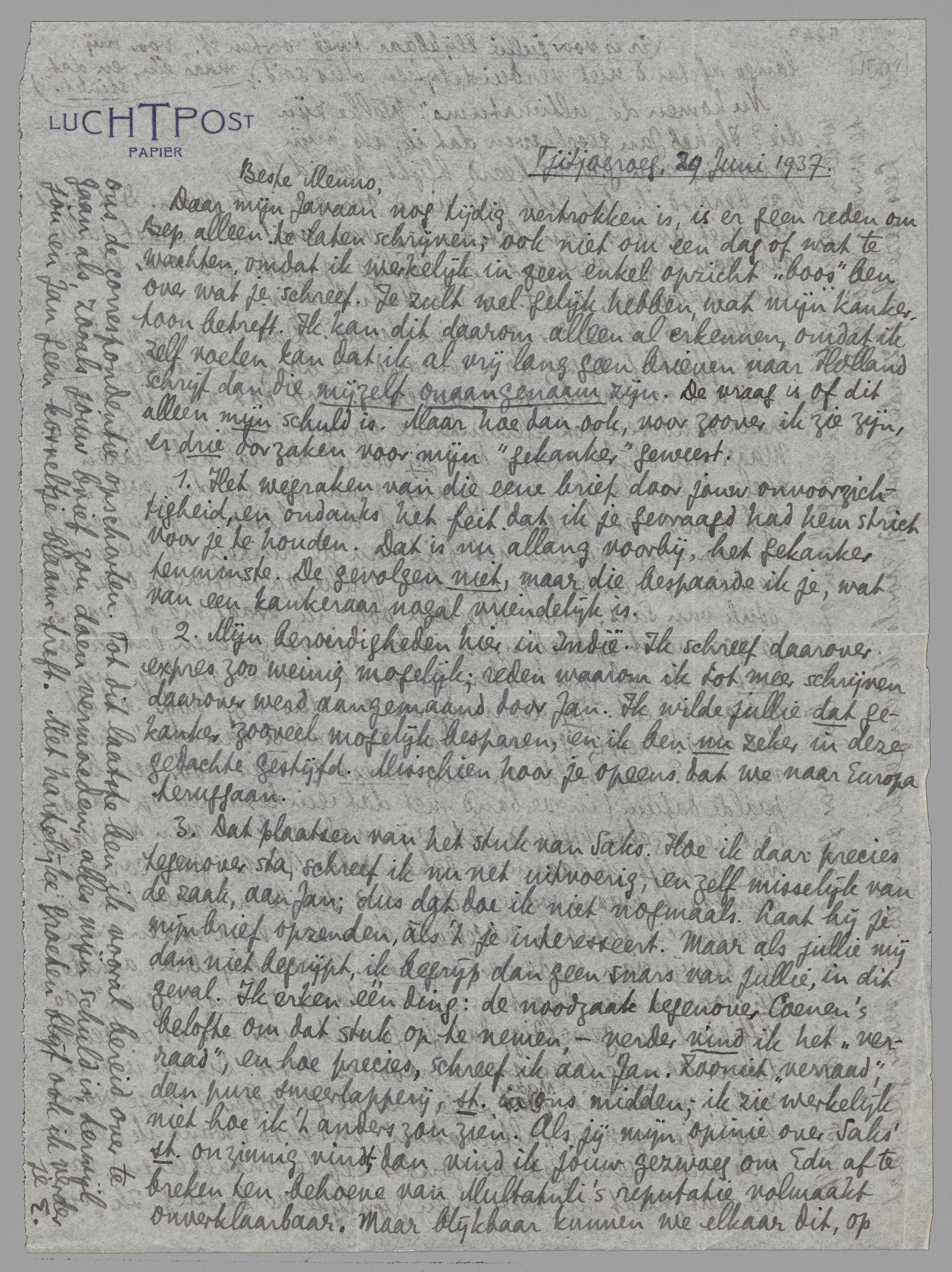 Daar mijn Javaan nog tijdig vertrokken is, is er geen reden om Bep alleen te laten schrijven; ook niet om een dag of wat te wachten, omdat ik werkelijk in geen enkel opzicht ‘boos’ ben over wat je schreef. Je zult wel gelijk hebben, wat mijn kankertoon betreft. Ik kan dit daarom alleen al erkennen, omdat ik zelf voelen kan dat ik al vrij lang geen brieven naar Holland schrijf dan die mijzelf onaangenaam zijn. De vraag is of dit alleen mijn schuld is. Maar hoe dan ook, voor zoover ik zie, zijn er drie oorzaken voor mijn ‘gekanker’ geweest.