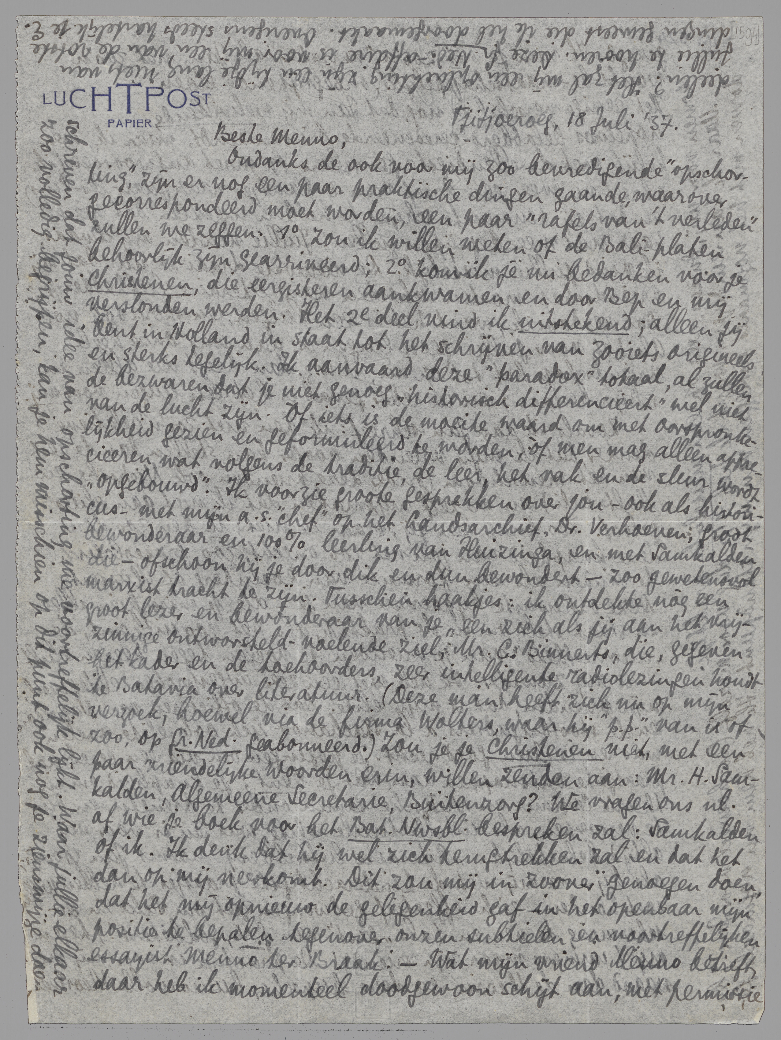 Ondanks de ook voor mij zoo bevredigende ‘opschorting’, zijn er nog een paar practische dingen gaande, waarover gecorrespondeerd moet worden, een paar ‘rafels van 't verleden’ zullen we zeggen. 1o zou ik willen weten of de Bali-platen behoorlijk zijn gearriveerd; 2o kom ik je nu bedanken voor de Christenen, die eergisteren aankwamen en door Bep en mij verslonden werden. Het 2e deel vind ik uitstekend; alleen jij bent in Holland in staat tot het schrijven van zooiets origineels en sterks tegelijk. Ik aanvaard deze ‘paradox’ totaal, al zullen de bezwaren dat je niet genoeg ‘historisch differencieert’ wel niet van de lucht zijn. Of iets is de moeite waard om met oorspronkelijkheid gezien en geformuleerd te worden, òf men mag alleen apprecieeren wat volgens de traditie, de leer, het vak en de sleur wordt ‘opgebouwd’. Ik voorzie groote gesprekken over jou - ook als historicus - met mijn a.s. ‘chef’ op het Landsarchief, Dr. Verhoeven, groot bewonderaar en 100% leerling van Huizinga, en met Samkalden die - ofschoon hij je door dik en dun bewondert - zoo gewetensvol marxist tracht te zijn. Tusschen haakjes: ik ontdekte nòg een groot lezer en bewonderaar van je, een zich als jij aan het vrijzinnige ontworsteld-voelende ziel; Mr. C. Binnerts, die, gegeven het kader en de toehoorders, zeer intelligente radiolezingen houdt te Batavia over literatuur (Deze man heeft zich nu op mijn verzoek, hoewel via de firma Wolters, waar hij ‘p.p.’ van is of zoo, op Gr.Ned. geabonneerd.) Zou je je Christenen niet, met een paar vriendelijke woorden erin, willen zenden aan: Mr. H. Samkalden, Algemeene Secretarie, Buitenzorg? We vragen ons nl. af wie je boek voor het Bat. Nwsbl. bespreken zal: Samkalden of ik. Ik denk dat hij wel zich terugtrekken zal en dat het dan op mij neerkomt. Dit zou mij in zoover genoegen doen, dat het mij opnieuw de gelegenheid gaf in het openbaar mijn positie te bepalen tegenover onzen subtielen en voortreffelijken essayst Menno ter Braak. - Wat mijn vriend Menno betreft, daar heb ik momenteel doodgewoon schijt aan, met permissie gezegd. Ik vind je net zoo'n ‘verrader’ als Jan, net zoo'n would-be-maatschappelijke, onbegrijpende kloen.