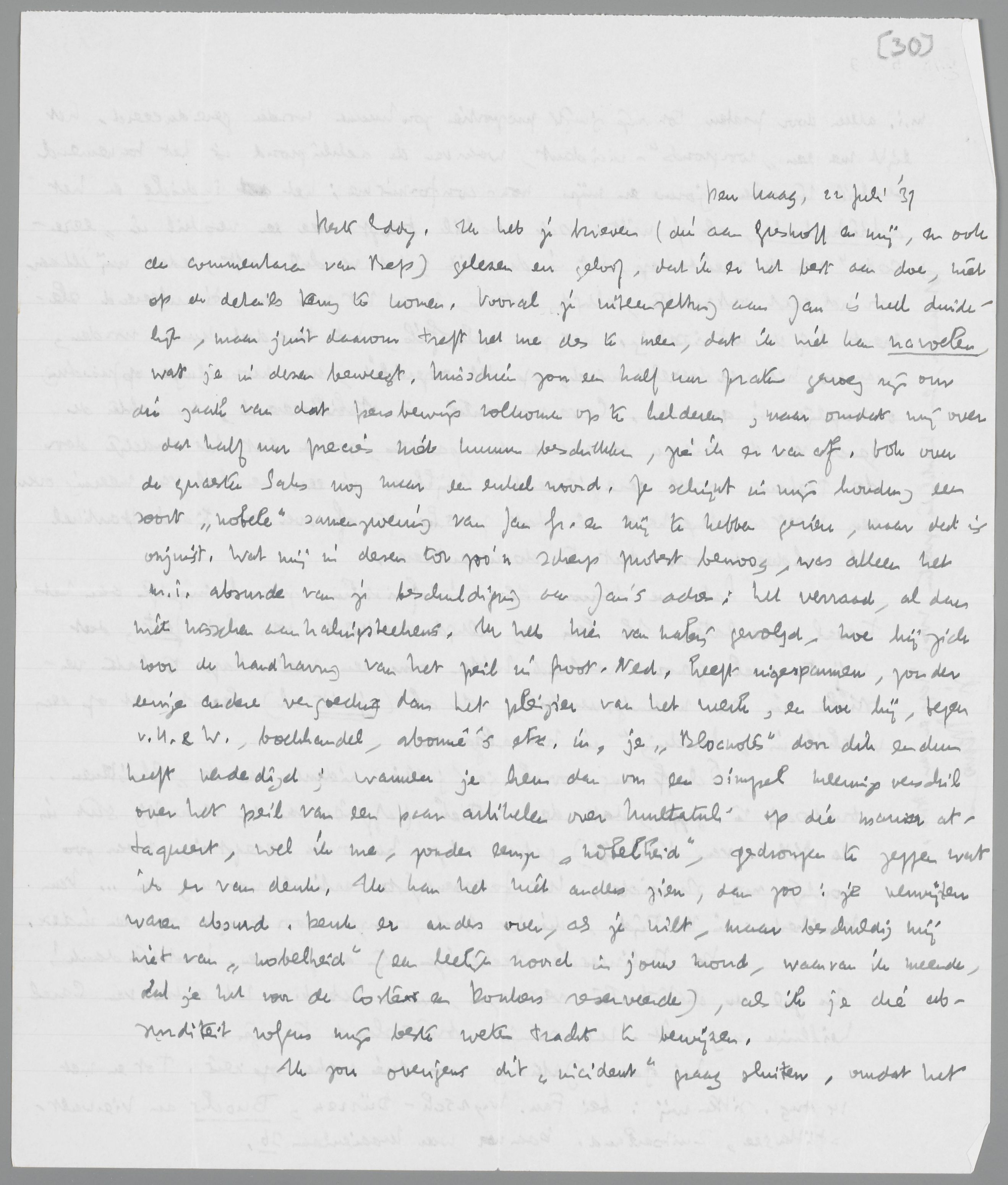 Ik heb je brieven (die aan Greshoff en mij, en ook de commentaren van Bep) gelezen en geloof, dat ik er het best aan doe, niet op de details terug te komen. Vooral je uiteenzetting aan Jan is heel duidelijk, maar juist daarom treft het me des te meer, dat ik niet kan navoelen, wat je in dezen beweegt. Misschien zou een half uur praten genoeg zijn om die zaak van dat persbewijs volkomen op te helderen, maar omdat wij over dat half uur precies niet kunnen beschikken, zie ik er van af. Ook over de quaestie Saks nog maar een enkel woord. Je schijnt in mijn houding een soort ‘nobele’ samenzwering van Jan Gr. en mij te hebben gezien, maar dat is onjuist. Wat mij in dezen tot zoo'n scherp protest bewoog, was alleen het m.i. absurde van je beschuldiging aan Jan's adres: het verraad, al dan niet tusschen aanhalingsteekens. Ik heb hier van nabij gevolgd, hoe hij zich voor de handhaving van het peil in Groot Ned. heeft ingespannen, zonder eenige andere vergoeding dan het pleizier van het werk, en hoe hij, tegen v.H. & W., boekhandel, abonné's etc. in, je Blocnotes door dik en dun heeft verdedigd; wanneer je hem dan om een simpel meeningsverschil over het peil van een paar artikelen over Multatuli op die manier attaqueert, voel ik me, zonder eenige ‘nobelheid’, gedrongen te zeggen wat ik er van denk. Ik kan het niet anders zien, dan zoo: je verwijten waren absurd. Denk er anders over, als je wilt, maar beschuldig mij niet van ‘nobelheid’ (een leelijk woord in jouw mond, waarvan ik meende, dat je het voor de Costers en Donkers reserveerde), als ik je die absurditeit volgens mijn beste weten tracht te bewijzen.