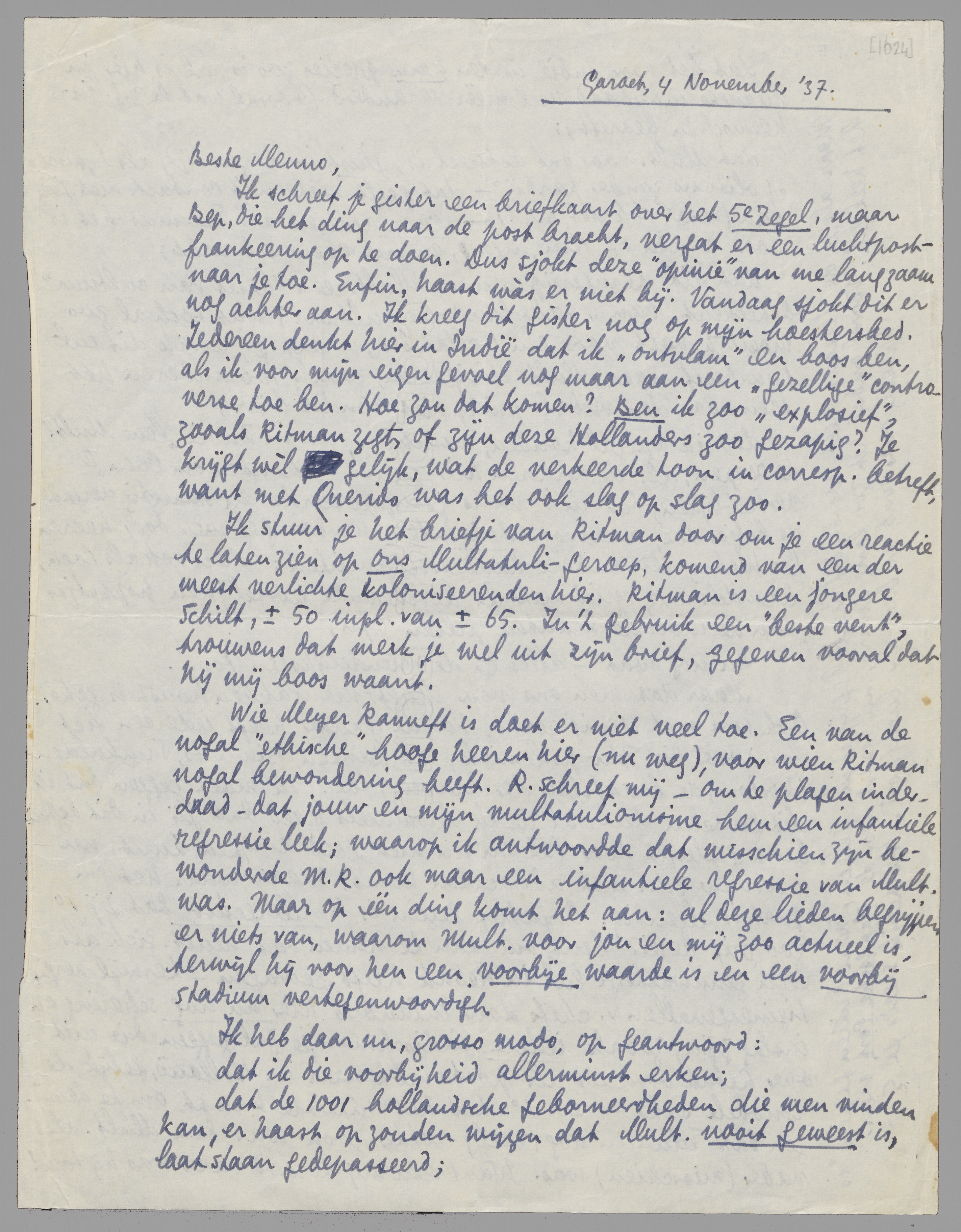 Ik schreef je gister een briefkaart over het 5e Zegel, maar Bep, die het ding naar de post bracht, vergat er een luchtpostfrankeering op te doen. Dus sjokt deze ‘opinie’ van me langzaam naar je toe. Enfin, haast wàs er niet bij. Vandaag sjokt dit er nog achteraan. Ik kreeg dit gister nog op mijn hoestersbed. Iedereen denkt hier in Indië dat ik ‘ontvlam’ en boos ben, als ik voor mijn eigen gevoel nog maar aan een ‘gezellige’ contraverse toe ben. Hoe zou dat komen? Ben ik zoo ‘explosief’, zooals Ritman zegt, of zijn deze Hollanders zoo gezapig? Je krijgt wèl gelijk, wat de verkeerde toon in corresp. betreft, want met Querido was het ook slag op slag zoo.
