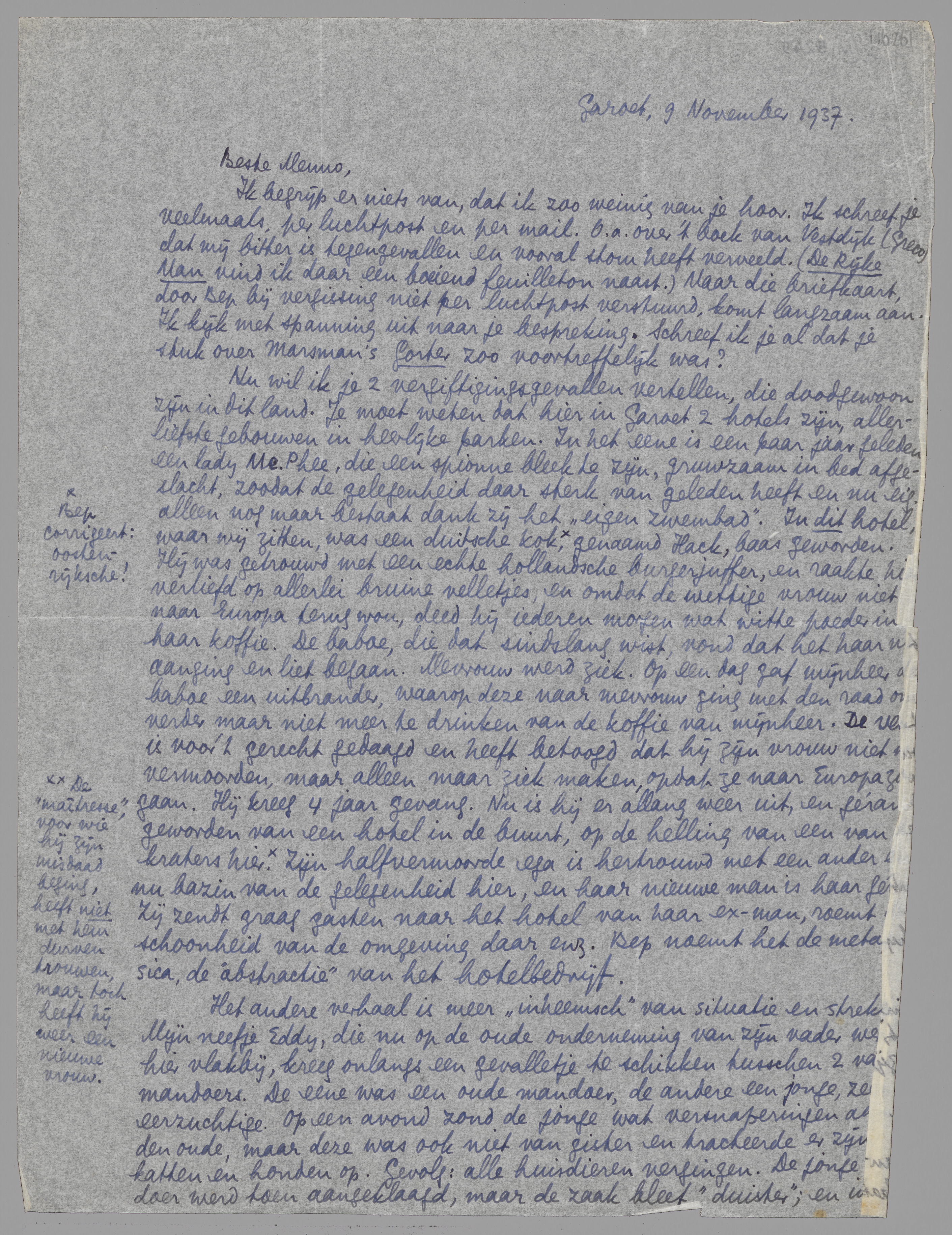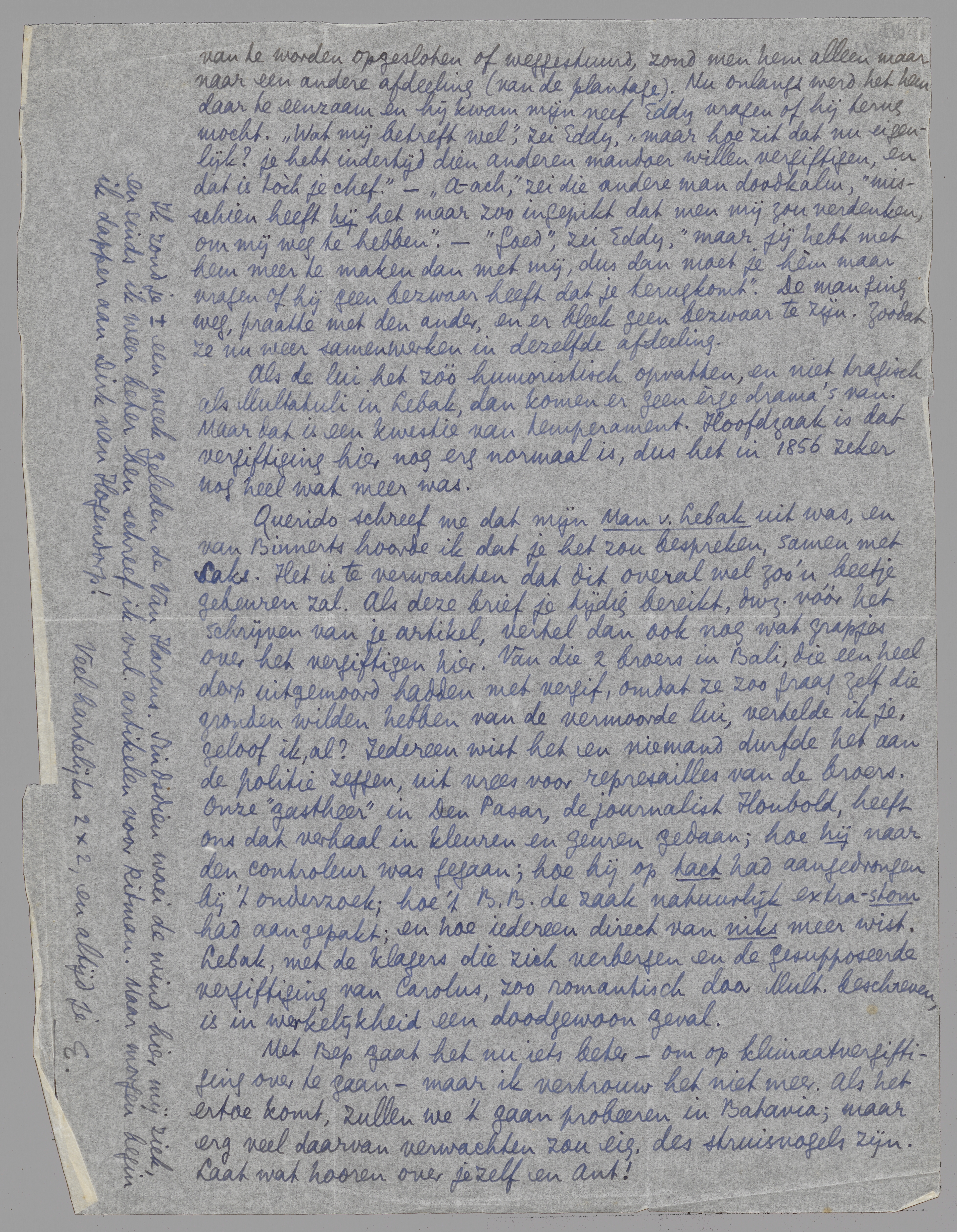 Querido schreef me dat mijn Man v. Lebak uit was, en van Binnerts hoorde ik dat je het zou bespreken, samen met Saks. Het is te verwachten dat dit overal wel zoo'n beetje gebeuren zal. Als deze brief je tijdig bereikt, dwz. vóór het schrijven van je artikel, vertel dan ook nog wat grapjes over het vergiftigen hier. Van die 2 broers in Bali, die een heel dorp uitgemoord hadden met vergif, omdat ze zoo graag zelf die gronden wilden hebben van de vermoorde lui, vertelde ik je, geloof ik, al? Iedereen wist het en niemand durfde het aan de politie zeggen, uit vrees voor represailles van de broers. Onze ‘gastheer’ in Den Pasar, de journalist Houbold, heeft ons dat verhaal in kleuren en geuren gedaan; hoe hij naar den controleur was gegaan; hoe hij op tact had aangedrongen bij 't onderzoek; hoe 't B.B. de zaak natuurlijk extra-stom had aangepakt; en hoe iedereen direct van niks meer wist. Lebak, met de klagers die zich verbergen en de gesupposeerde vergiftiging van Carolus, zoo romantisch door Mult. beschreven, is in werkelijkheid een doodgewoon geval.