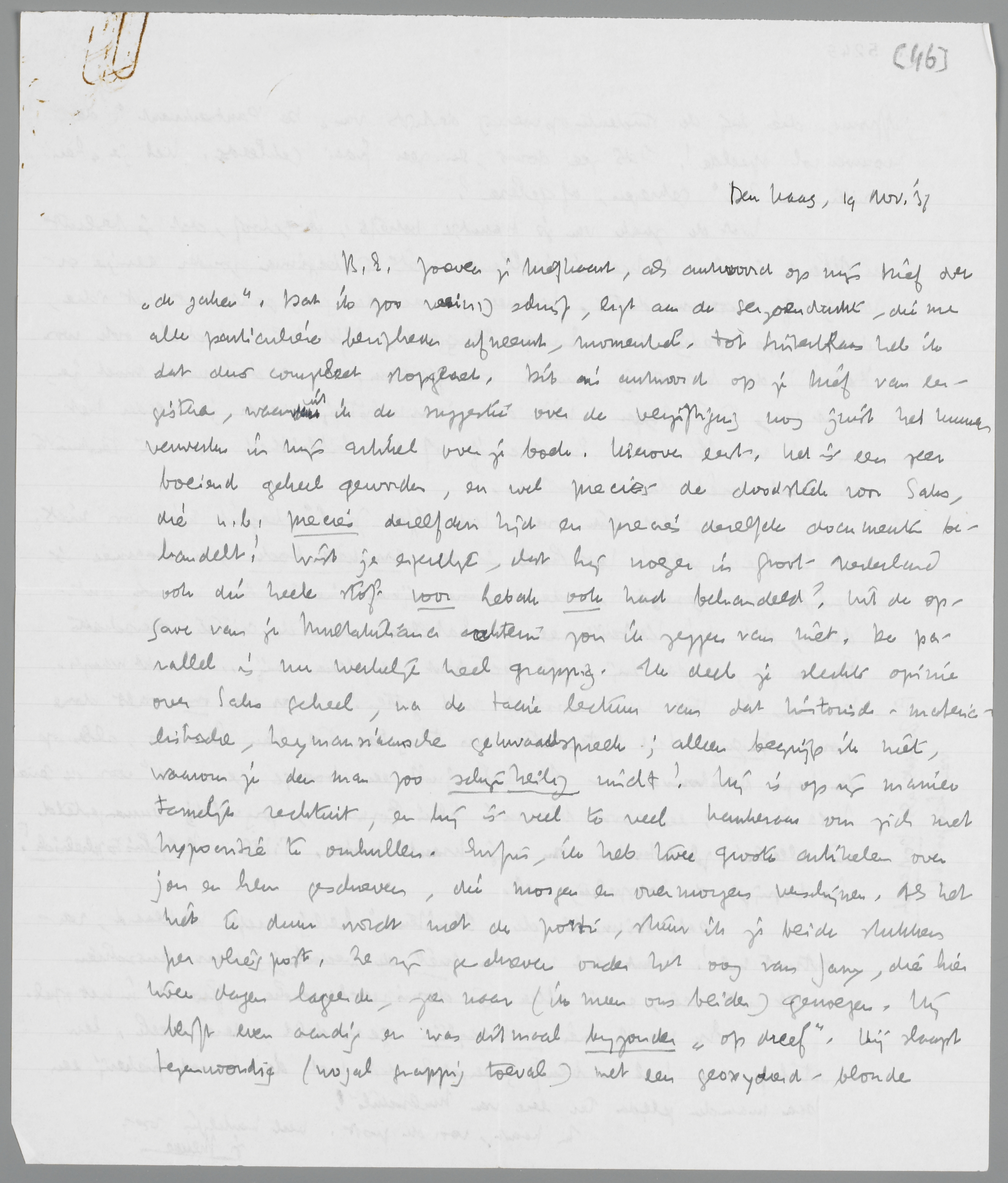Zooeven je briefkaart, als antwoord op mijn brief over ‘de zaken’. Dat ik zoo weinig schrijf, ligt aan de seizoendrukte, die me alle particuliere bezigheden afneemt, momenteel. Tot Sinterklaas heb ik dat dus compleet stopgezet. Dit in antwoord op je brief van eergisteren, waaruit ik de suggestie over de vergiftiging nog juist heb kunnen verwerken in mijn artikel over je boek. Hierover eerst. Het is een zeer boeiend geheel geworden, en wel precies de doodsteek voor Saks, die n.b. precies dezelfden tijd en precies dezelfde documenten behandelt! Wist je eigenlijk, dat hij vroeger in Groot-Nederland ook die heele stof voor Lebak ook had behandeld? Uit de opgave van je Multatuliana achterin zou ik zeggen van niet. De parallel is nu werkelijk heel grappig. Ik deel je slechte opinie over Saks geheel, na de taaie lectuur van dat historisch-materialistische, heymansiaansche gekwaadspreek; alleen begrijp ik niet, waarom je den man zoo schijnheilig vindt? Hij is op zijn manier tamelijk rechtuit, en hij is veel te veel kankeraar om zich met hypocrisie te omhullen. Enfin, ik heb twee groote artikelen over jou en hem geschreven, die morgen en overmorgen verschijnen. Als het niet te duur wordt met de porti, stuur ik je beide stukken per vliegpost. Ze zijn geschreven onder het oog van Jany, die hier twee dagen logeerde, zeer naar (ik meen ons beider) genoegen. Hij blijft even aardig en was ditmaal bijzonder ‘op dreef’. Heb je Een Winter aan Zee gekregen, of gelezen?