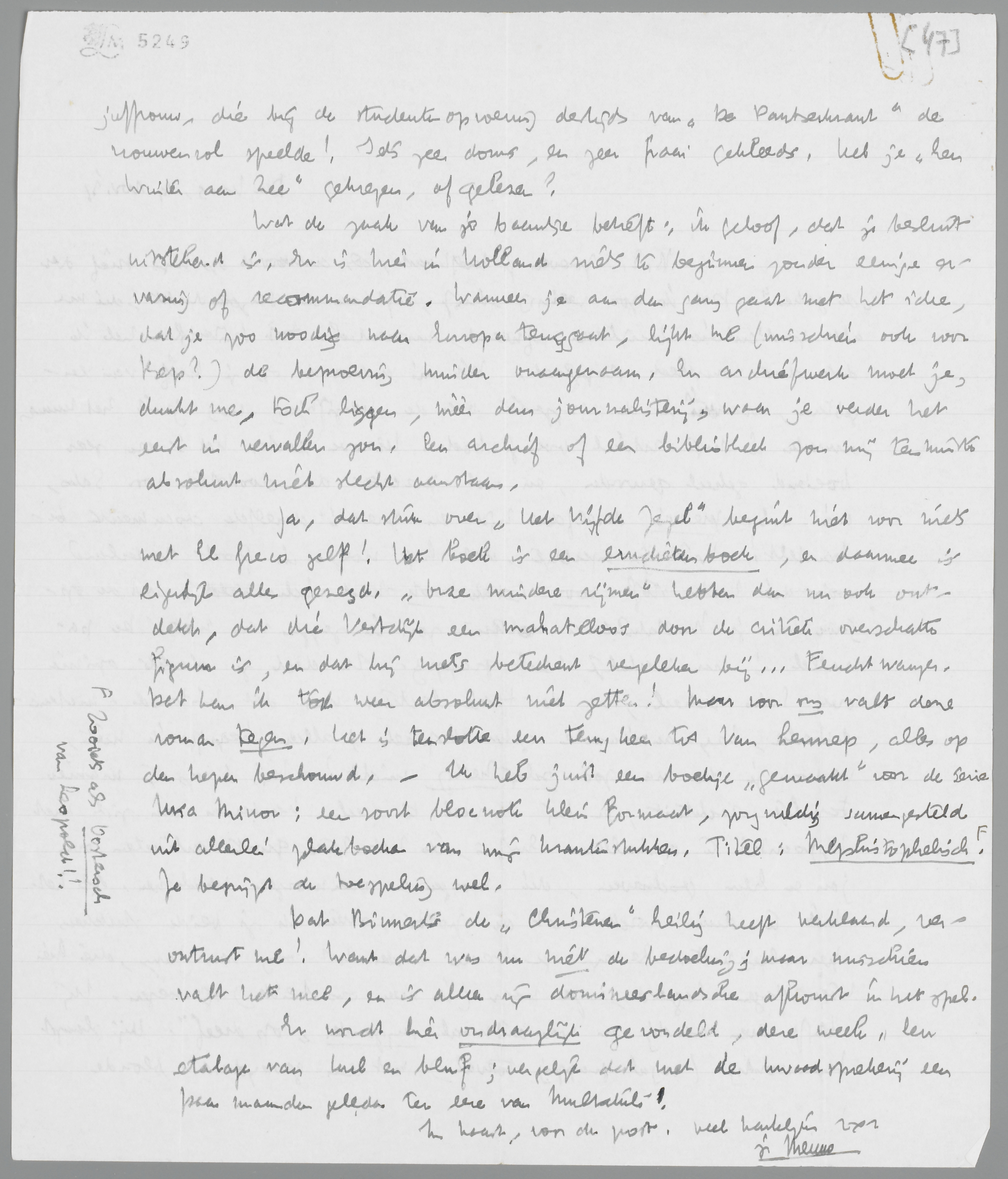 Wat de zaak van je baantje betreft: ik geloof, dat je besluit uitstekend is. Er is hier in Holland niets te beginnen zonder eenige ervaring of recommandatie. Wanneer je aan den gang gaat met het idee, dat je zoo noodig naar Europa teruggaat, lijkt me (misschien ook voor Bep?) de beproeving minder onaangenaam. En archiefwerk moet je, dunkt me, toch liggen, mèèr dan journalisterij, waar je verder het eerst in vervallen zou. Een archief of een bibliotheek zou mij tenminste absoluut niet slecht aanstaan.
