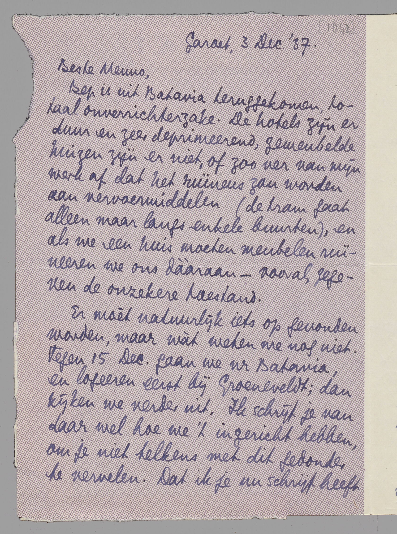 Bep is uit Batavia teruggekomen, totaal onverrichterzake. De hotels zijn er duur en zeer deprimeerend, gemeubelde huizen zijn er niet, of zoo ver van mijn werk af dat het ruïneus zou worden aan vervoermiddelen (de tram gaat alleen maar langs enkele buurten), en als we een huis moeten meubelen ruïneeren we ons dààraan - vooral, gegeven de onzekere toestand.