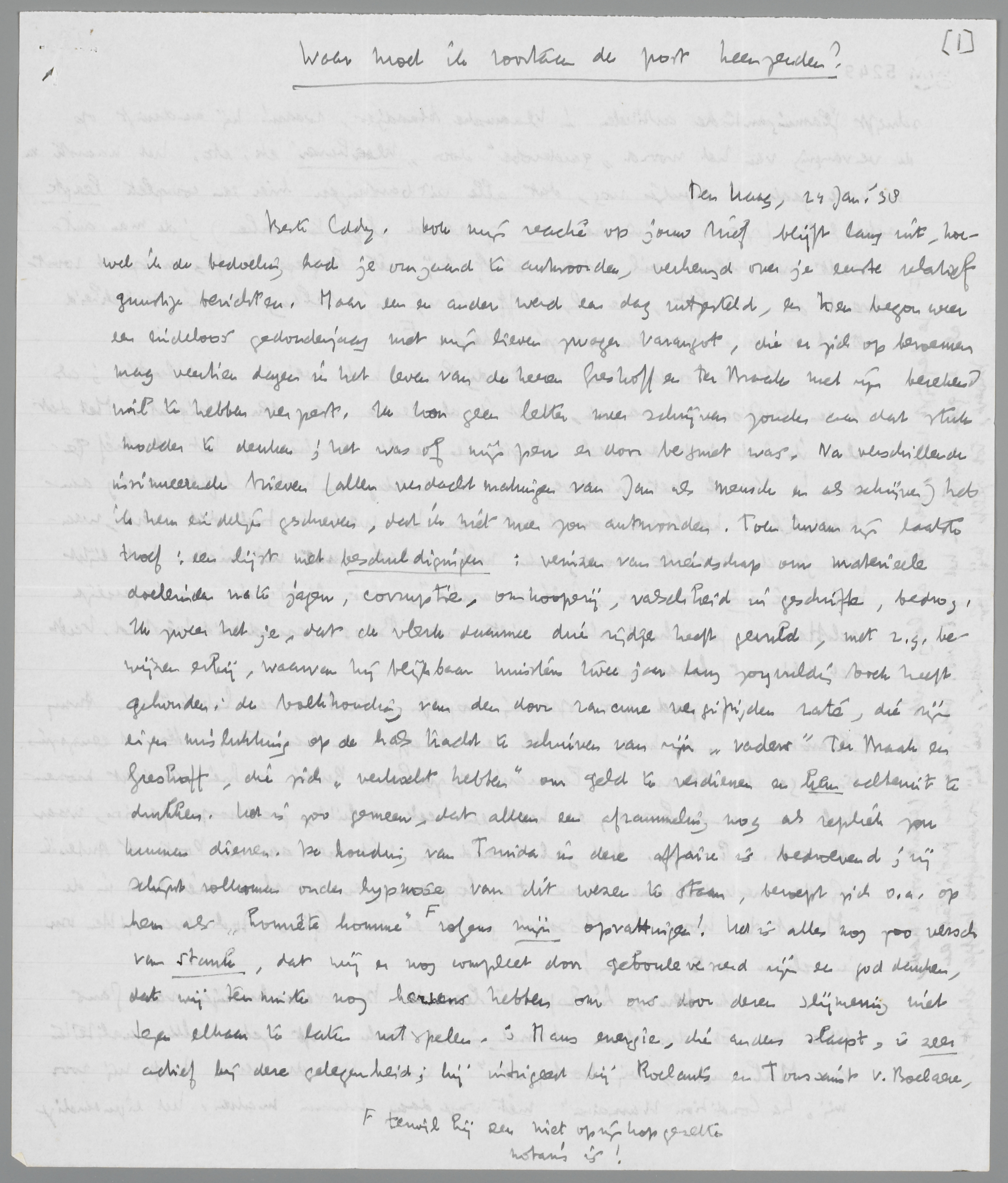 Ik ben onder deze omstandigheden heel weinig schrijflustig; als ik een briefpapier aanpak, moet ik al denken aan den intrigant. Met dat al: ik heb met erg veel plezier je eerste reactie op het Archief gelezen! Vooral het fictieve van de werkzaamheden lijkt me erg aantrekkelijk; het l'art pour l'art van het werk is toch dat werk, waarvan je de sociale noodzaak niet precies kunt uitvinden. Het lijkt toch wel iets op het ‘kleine ambt’, dat Nietzsche zoo begeerlijk achtte. - Je schrijft alleen niets over Bep's gezondheidstoestand. Valt het klimaat haar mee?