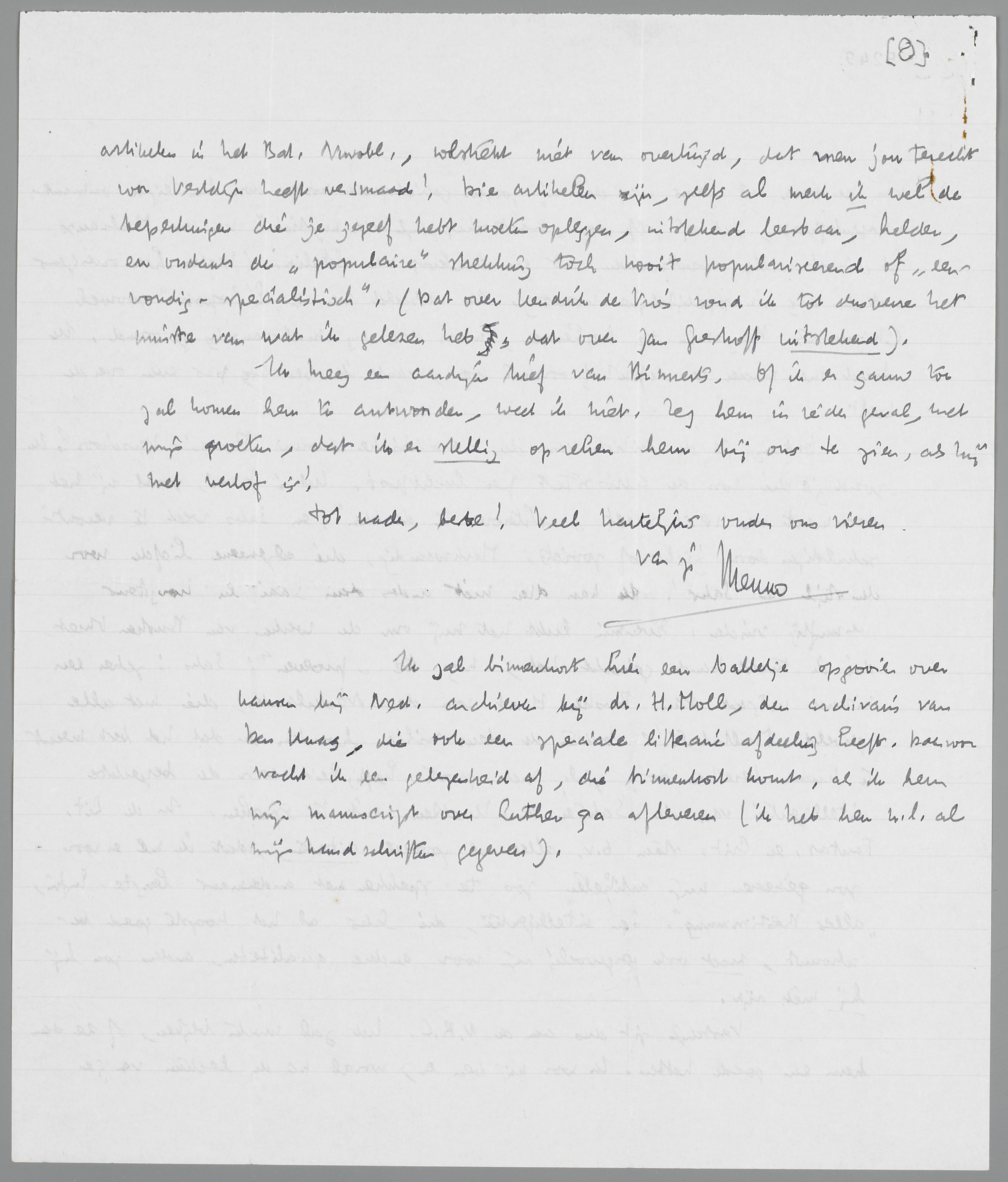 Ik zal binnenkort hier een balletje opgooien over kansen bij Ned. archieven bij dr. H. Moll, den archivaris van Den Haag, die ook een speciale litteraire afdeeling heeft. Daarvoor wacht ik een gelegenheid af, die binnenkort komt, als ik hem mijn manuscript over Luther ga afleveren (ik heb hem n.l. al mijn handschriften gegeven).