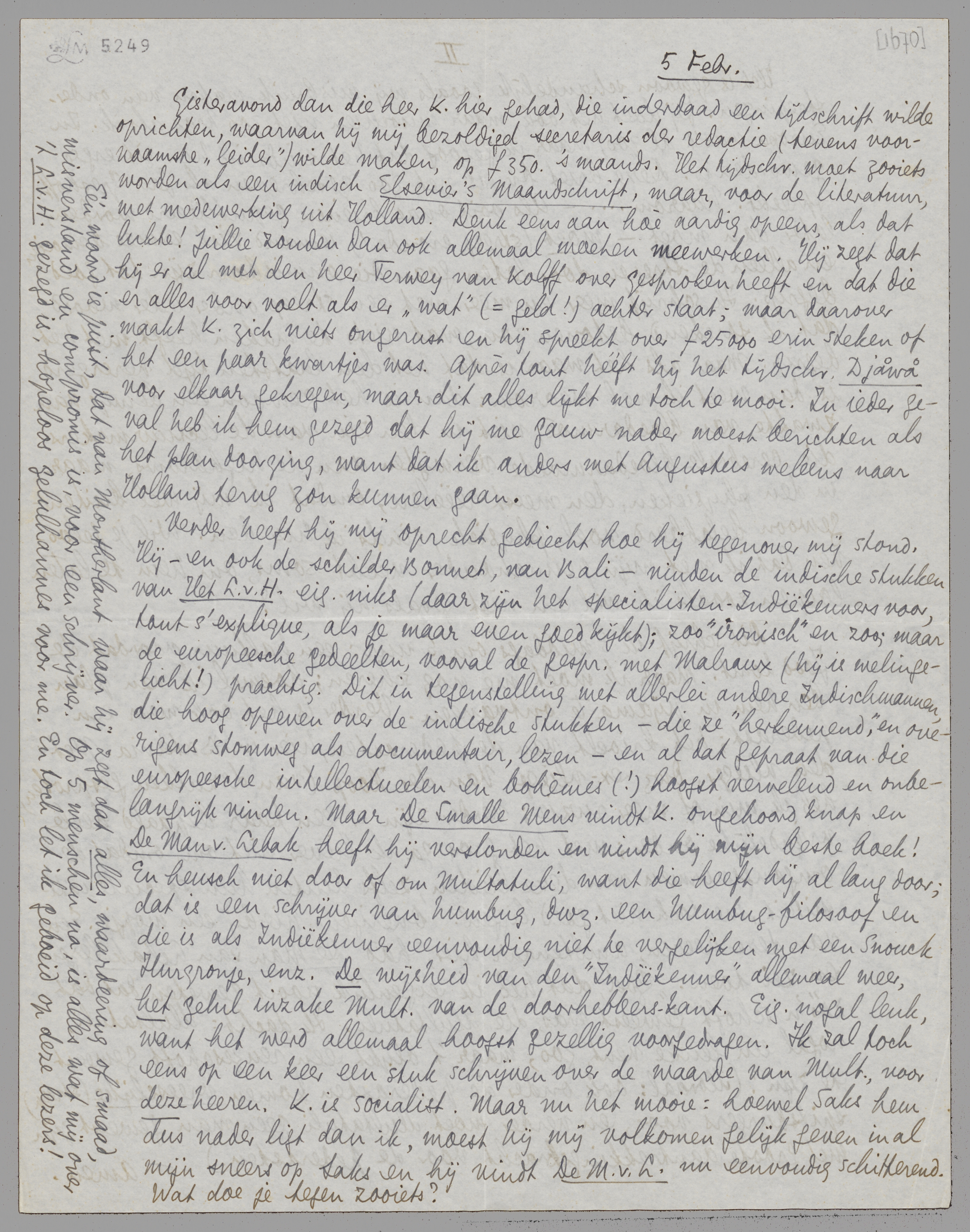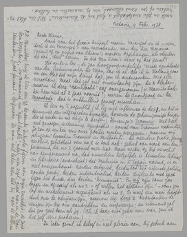 Gisteravond dan die heer K. hier gehad, die inderdaad een tijdschrift wilde oprichten, waarvan hij mij bezoldigd secretaris der redactie (tevens voornaamste ‘leider’) wilde maken, op ƒ 350. 's maands. Het tijdschr. moet zooiets worden als een indisch Elsevier's Maandschrift, maar, voor de literatuur, met medewerking uit Holland. Denk eens aan hoè aardig opeens, als dat lukte! Jullie zouden dan ook allemaal moeten meewerken. Hij zegt dat hij er al met den heer Terwey van Kolff over gesproken heeft en dat die er alles voor voelt als er ‘wat’ (= geld!) achter staat; maar daarover maakt K. zich niets ongerust en hij spreekt over ƒ25000 erin steken of het een paar kwartjes was. Après tout hééft hij het tijdschr. Djåwå voor elkaar gekregen, maar dit alles lijkt me toch te mooi. In ieder geval heb ik hem gezegd dat hij me gauw nader moest berichten als het plan doorging, want dat ik anders met Augustus weleens naar Holland terug zou kunnen gaan.