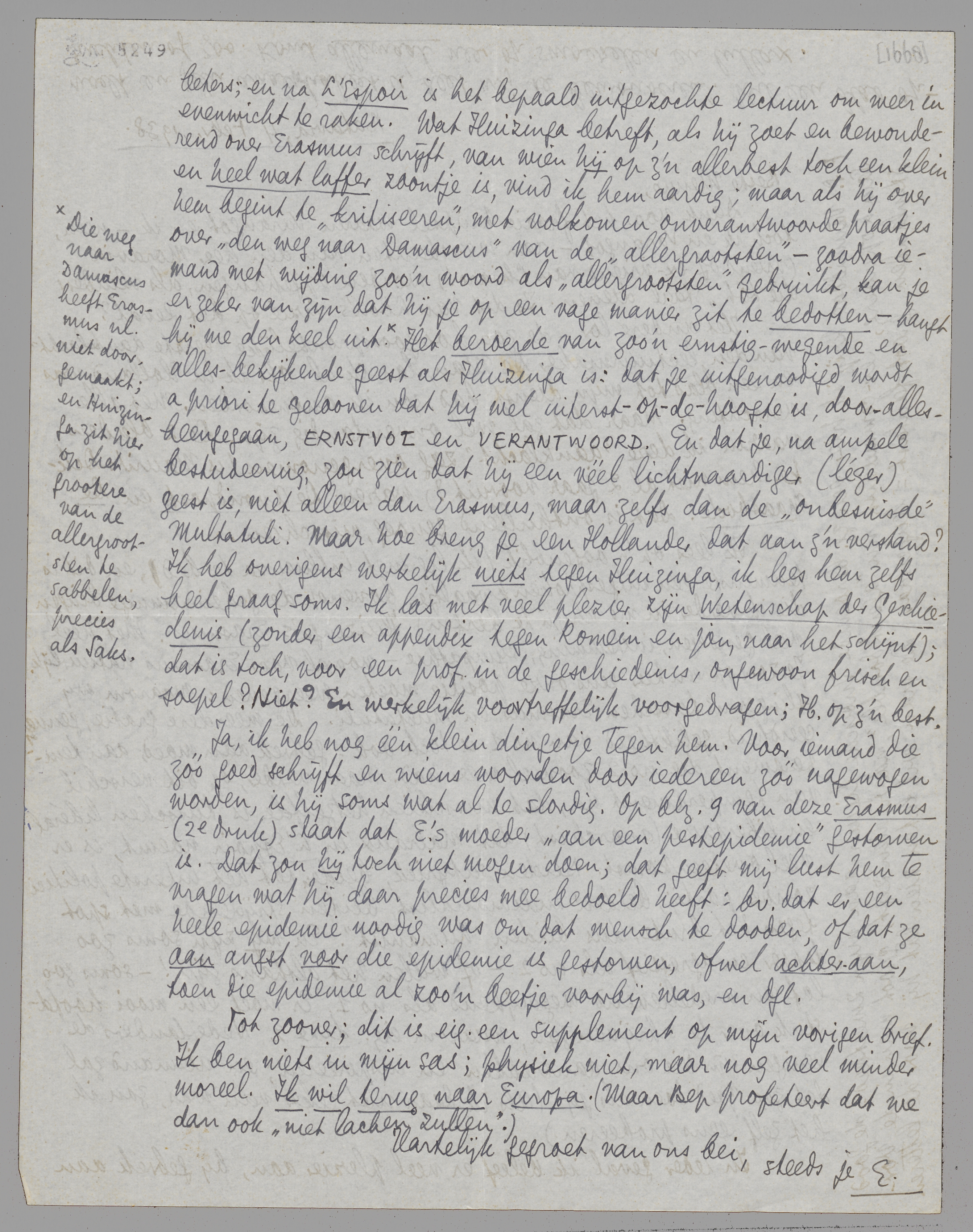 In ieder geval, ik beleef er veel plezier aan, bij gebrek aan beters; en na L'Espoir is het bepaald uitgezochte lectuur om weer in evenwicht te raken. Wat Huizinga betreft, als hij zoet en bewonderend over Erasmus schrijft, van wien hij op z'n allerbest toch een klein en heel wat laffer zoontje is, vind ik hem aardig; maar als hij over hem begint te ‘kritiseeren’, met volkomen onverantwoorde praatjes over ‘den weg naar Damascus’ van de ‘allergrootsten’ - zoodra iemand met wijding zoo'n woord als ‘allergrootsten’ gebruikt, kan je er zeker van zijn dat hij je op een vage manier zit te bedotten - hangt hij me den keel uit. [Die weg naar Damascus heeft Erasmus nl. niet doorgemaakt; en Huizinga zit hier op het grootere van de allergrootsten te sabbelen, precies als Saks.] Het beroerde van zoo'n ernstig-wegende en alles-bekijkende geest als Huizinga is: dat je uitgenoodigd wordt a priori te gelooven dat hij wel uiterst-op-de-hoogte is, door-alles-heengegaan, ERNSTVOL en VERANTWOORD. En dat je, na ampele bestudeering, zou zien dat hij een véél lichtvaardiger (léger) geest is, niet alleen dan Erasmus, maar zelfs dan de ‘onbesuisde’ Multatuli. Maar hoe breng je een Hollander dat aan z'n verstand? Ik heb overigens werkelijk niets tegen Huizinga, ik lees hem zelfs heel graag soms. Ik las met veel plezier zijn Wetenschap der Geschiedenis (zonder een appendix tegen Romein en jou, naar het schijnt); dat is toch, voor een prof in de geschiedenis, ongewoon frisch en soepel? Niet? En werkelijk voortreffelijk voorgedragen; H. op z'n best.