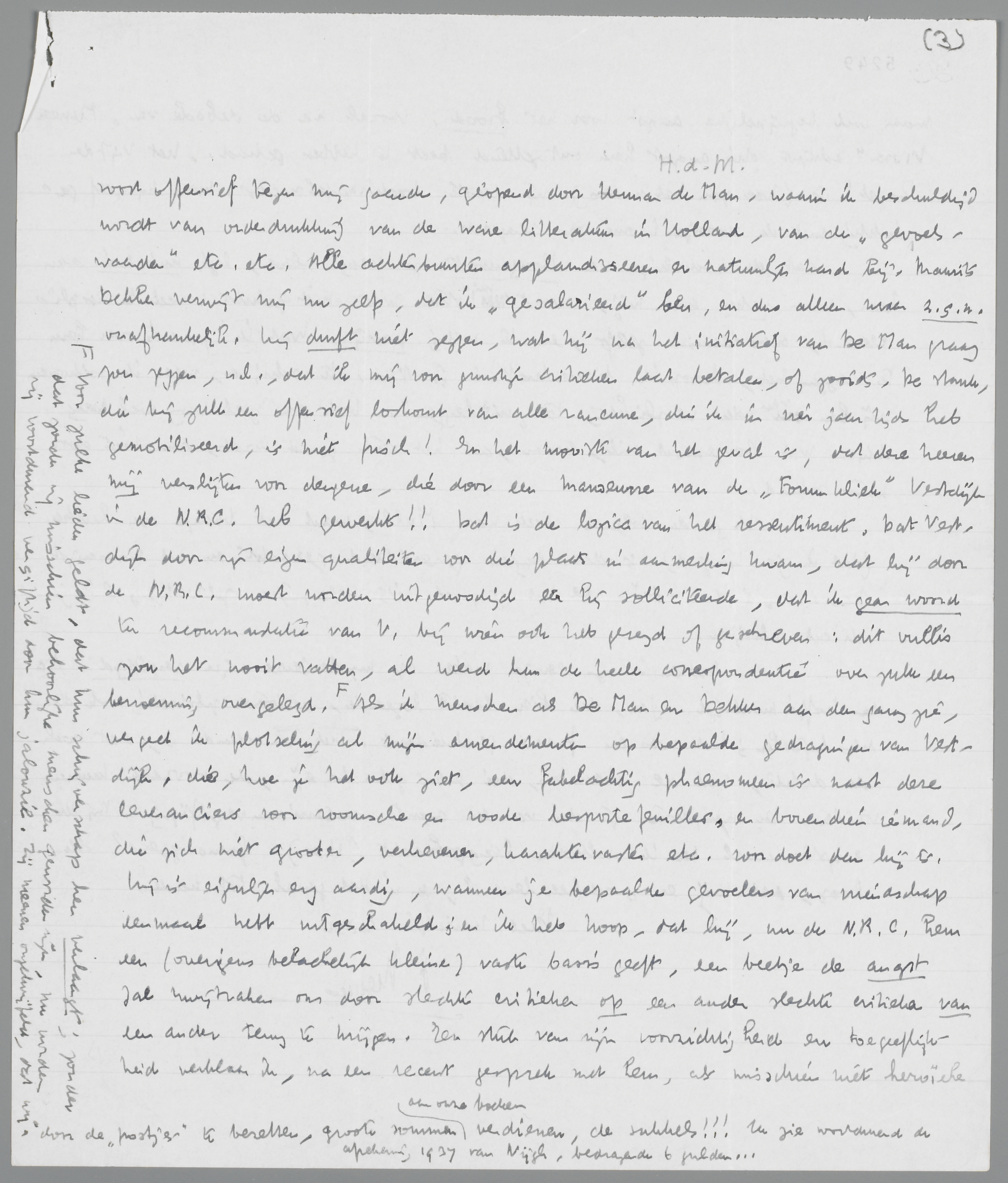 Je uitvoerige brief van 2 dezer heeft mij zeer verkwikt! Alleen wordt het m.i. steeds meer tijd om deze correspondentie weer eens mondeling te verifieeren; maar vermoedelijk zal dat nog even moeten wachten. Je gezondheid is eigenlijk het eenige bericht, dat directe aanleiding tot een beetje pessimisme geeft, al is het een tegenpunt, dat Bep het in Batavia zoo goed hardt. Het beste met al deze tribulaties. Mijn reacties op L'Espoir zijn vrijwel dezelfde als die van jou; ook mij ontbreekt, vreemd genoeg eigenlijk, de lust om erover te schrijven (ik laat het dan ook aan Jan over). Ik kan me toch niet volkomen aan den indruk onttrekken, dat er een teveel in dit boek is, vooral aan niet geheel opgeloste personages, die elkaar letterlijk verdringen om mee te doen aan het panorama. En dan: een van de hoogtepunten, het gesprek tusschen Alvear en Scali, is toch eigenlijk een herhaling van La Cond. Humaine, wat het essentieele betreft; die Alvear is compleet Gisors, voor mijn gevoel, en zeker niet rijker of anders of beter of hoe je het noemen wilt. Bovendien hindert mij hier veel meer dan in La C.H. de jachterige stijl, die door de omstandigheden verklaarbaar is en ook niet op journalistiek gaat lijken, maar mij toch niet ‘ligt’. Ik houd niet van dezen stijl (ook niet in La Cond. H., tenslotte), en als ik niet bewondering had voor de intelligentie en den werkelijken moed, waarvan de persoonlijkheid Malraux vol is, zou ik me nog veel verder van hem verwijderd voelen dan ik toch al doe. - Die mijnheer Guernico moet, als ik het wel heb, Bergamin voorstellen (mengsel uit Spaansch en Venetiaansch bloed, een soort H. Franciscus, een langzame en katholieke Malraux, in veel opzichten, zoo kwam hij mij ongeveer voor, toen ik hem ontmoette); maar ‘herkennen’ doe ik hem toch maar half. - Mijn laatste gedachte na de lectuur was: tot deze toewijding aan den oorlog en deze verdieptheid in de broederschap van den dood zou ik alleen in staat zijn, als de situatie zich naar mijn eigen land verplaatste. De neiging van Malraux om zich in dit opzicht te internationaliseeren, heb ik niet, zelfs al legt men mij uit, ‘dat de toekomst van Europa in Spanje wordt beslist’. Als de generaals Roëll, Snijders en zoo zich met Mussert verbonden, zou ik pas broederschap kunnen voelen met Albarda, Koos Vorrink, Wijnkoop en, god weet het, Maurits Dekker. Maar met dat al heeft de lectuur mij als wrijfpaal gediend voor mijn eigen roman, die zich gestadig ontwikkelt, en die ook de ‘verantwoording voor den dood’ als onderwerp zal hebben.