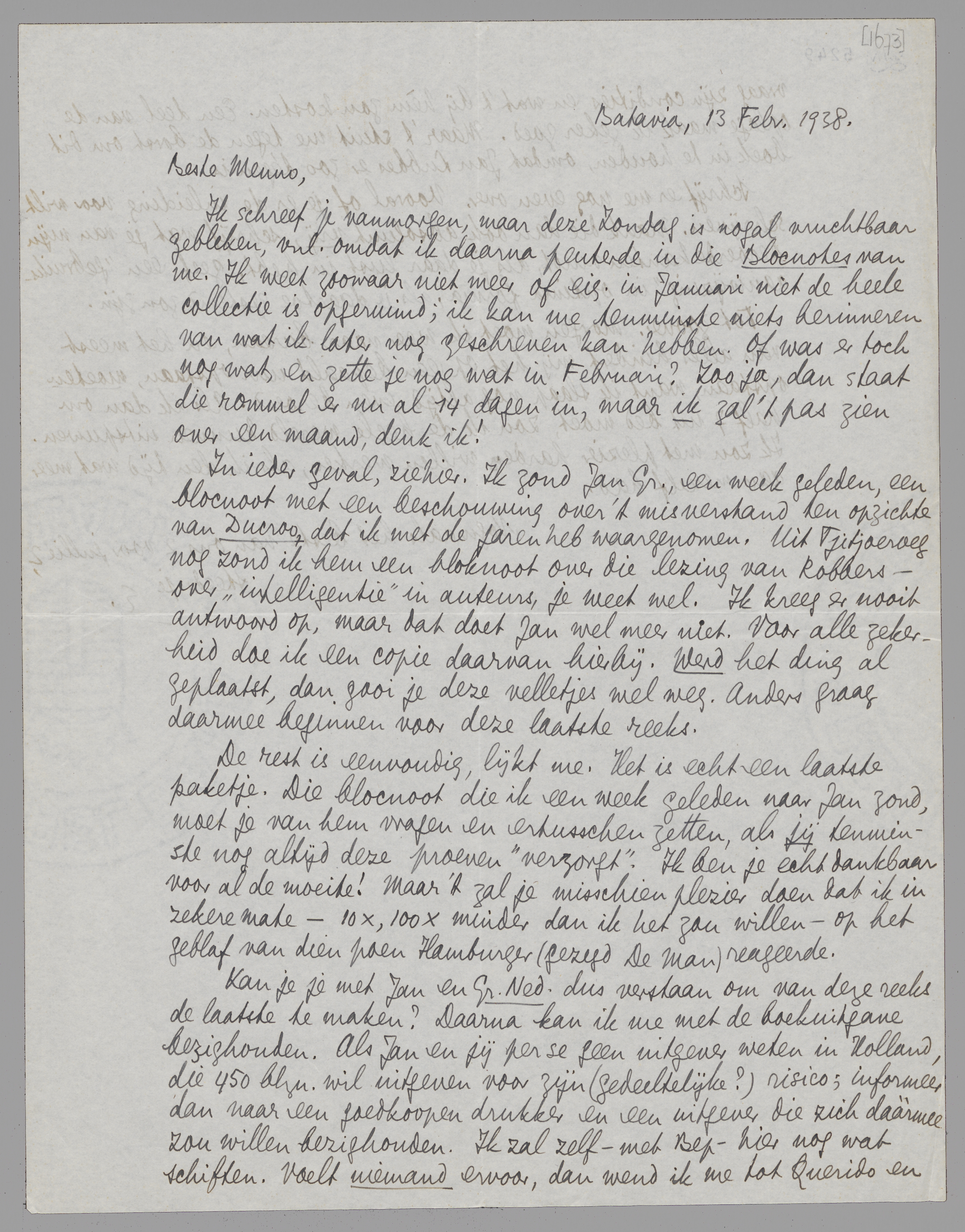 In ieder geval, ziehier. Ik zond Jan Gr., een week geleden, een blocnoot met een beschouwing over 't misverstand ten opzichte van Ducroo, dat ik met de jaren heb waargenomen. Uit Tjitjoeroeg nog zond ik hem een bloknoot over die lezing van Robbers - over ‘intelligentie’ in auteurs, je weet wel. Ik kreeg er nooit antwoord op, maar dat doet Jan wel meer niet. Voor alle zekerheid doe ik een copie daarvan hierbij. Werd het ding al geplaatst, dan gooi je deze velletjes wel weg. Anders graag daarmee beginnen voor deze laatste reeks.