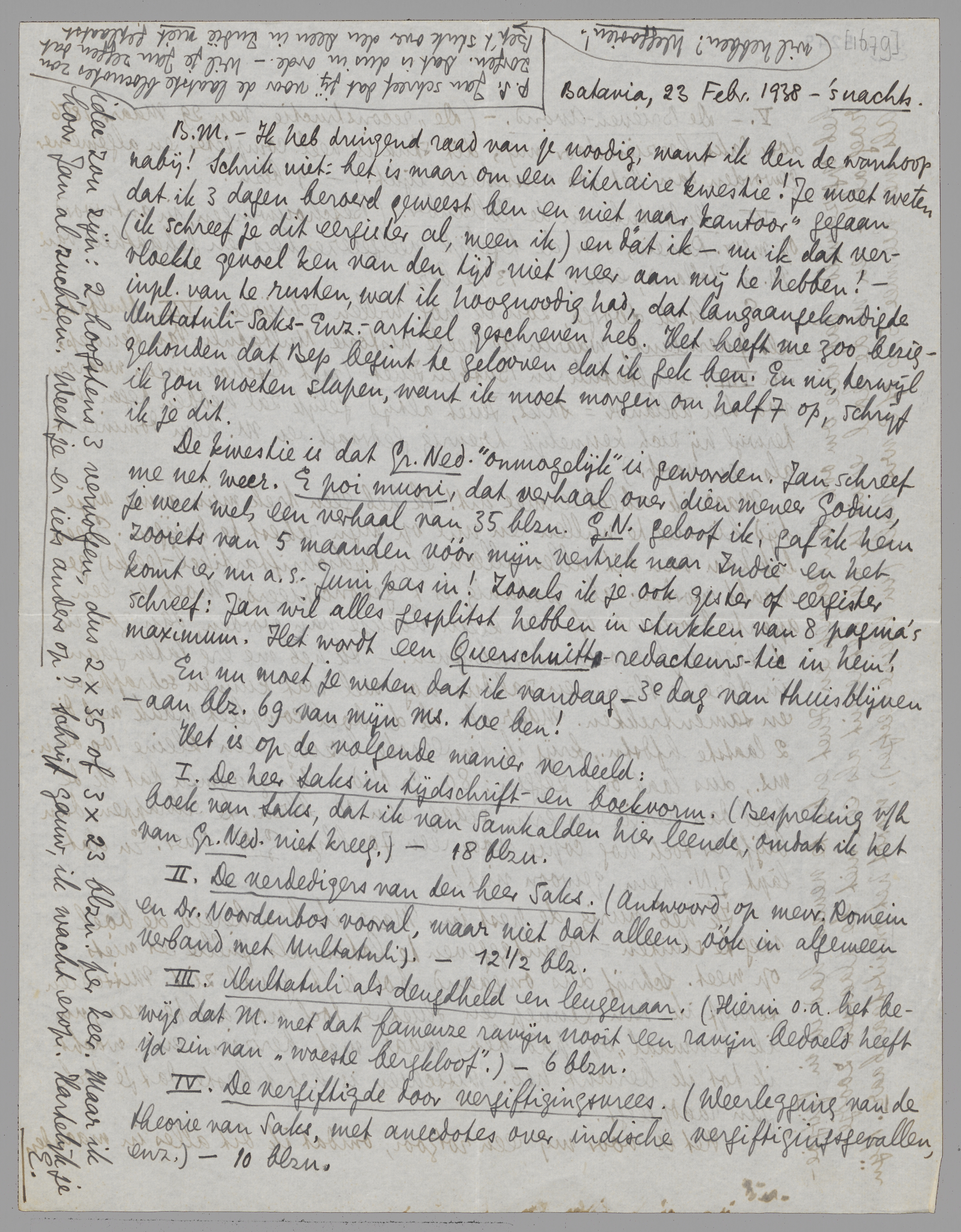 Ik heb dringend raad van je noodig, want ik ben de wanhoop nabij! Schrik niet: het is maar om een literaire kwestie! Je moet weten dat ik 3 dagen beroerd geweest ben en niet ‘naar kantoor’ gegaan (ik schreef je dit eergister al, meen ik) en dat ik - nu ik dat vervloekte gevoel ken van den tijd niet meer aan mij te hebben! - inpl. van te rusten, wat ik hoognoodig had, dat langaangekondigde Multatuli-Saks-Enz.-artikel geschreven heb. Het heeft me zoo beziggehouden dat Bep begint te gelooven dat ik gek ben. En nu, terwijl ik zou moeten slapen, want ik moet morgen om half 7 op, schrijf ik je dit.