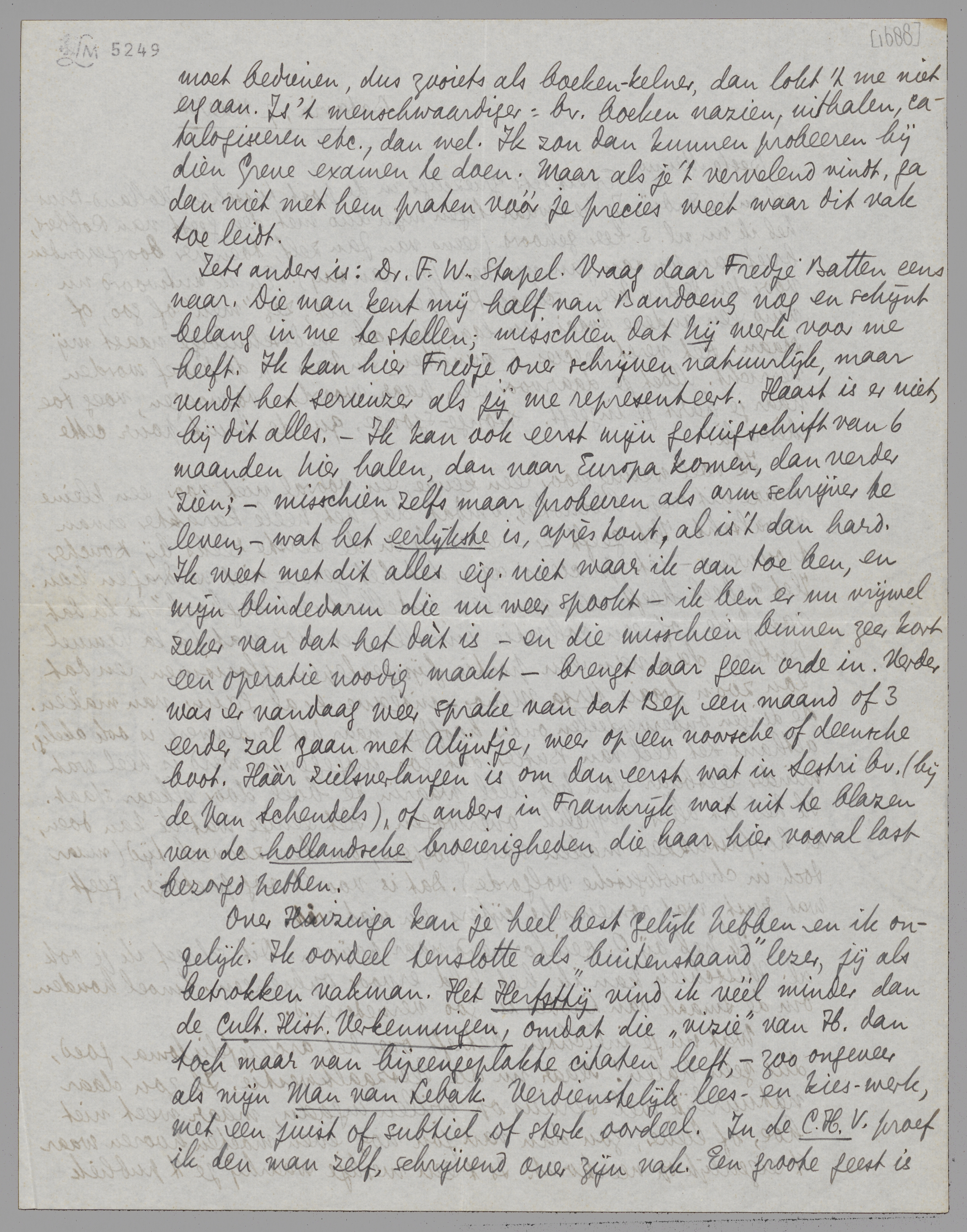 Iets anders is: Dr. F.W. Stapel. Vraag daar Fredje Batten eens naar. Die man kent mij half van Bandoeng nog en schijnt belang in me te stellen; misschien dat hij werk voor me heeft. Ik kan hier Fredje over schrijven natuurlijk, maar vindt het serieuzer als jij me representeert. Haast is er niet, bij dit alles. - Ik kan ook eerst mijn getuigschrift van 6 maanden hier halen, dan naar Europa komen, dan verder zien; - misschien zelfs maar probeeren als arm schrijver te leven, - wat het eerlijkste is, après tout, al is 't dan hard. Ik weet met dit alles eig. niet waar ik aan toe ben, en mijn blindedarm die nu weer spookt - ik ben er nu vrijwel zeker van dat het dàt is - en die misschien binnen zeer kort een operatie noodig maakt - brengt daar geen orde in. Verder was er vandaag weer sprake van dat Bep een maand of 3 eerder zal gaan met Alijntje, weer op een noorsche of deensche boot. Hààr zielsverlangen is om dan eerst wat in Sestri bv. (bij de Van Schendels), of anders in Frankrijk wat uit te blazen van de hollandsche broeierigheden die haar hier vooral last bezorgd hebben.