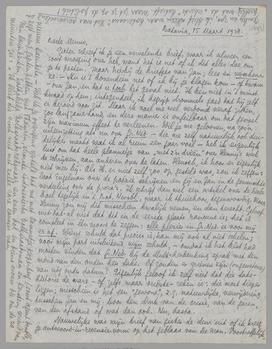 Een tijdje geleden las ik de brieven uit Batavia van Huet aan Potgieter (deel 2 en 3 van de 3 dln.); las jij ze ooit? Als Huet het over de politiek heeft, lult hij alle ‘conservatieven’ na; maar zijn opmerkingen over de samenleving zijn nu nog absoluut van kracht. Ik heb zelfs zoo'n gevoel dat het vroeger hier echter was, stommer, maar àls er behoefte was aan ‘wat beters’, dan ook grappiger, intenser. Tegenwoordig is Batavia een provinciestad die aan de kritiek toe is: iedereen haalt nu z'n neus op voor bv. het dansen van Darja (vindt men dàt nu mooi in Holland??) omdat iedereen in Berlijn, of Parijs, of ergens anders gedurende verloftijd, een andere beroemdheid genoten heeft. Men is meer ‘algemeen ontwikkeld’, méér ‘europeesch’, méér snobistisch, en in laatste instantie even klungelig en belust op schandaaltjes en provinciaal als toen Huet Faust zag opvoeren in de Schouwburg hier. De krontjongtroepen van vroeger zijn vervangen door echte bands (jazz-bands!) - het is er geen haar beter op geworden, behalve voor de indo-snobs. Maar... Batavia is een stad, - al vroeg Jan me na de briefkaart v/h Landsarchief of 't hier zoo landelijk was. Hij dacht dat Batavia toch wel een stad was als Antwerpen. Goeie God, het is 5× Antwerpen, en 10× zoo gevarieerd. Dat komt door de chineesche wijken en door de Javanen die er ook nog zijn. Als er één ding is, dat inderdaad vooruit is gegaan, dan de situatie van den ‘inheemsche’, en de politiek. Niet dat ze politiek vooruitgaan, want Jan Lubbes is slim genoeg om ze net zooveel ruimte te geven als dienstig wordt geacht; maar door al het gelul en gepolitieker en het onderwijs is er een soort betere inheemsche stand, zelfs een ‘intellectueelen’-stand, al blijft het een verdomd lastig ding om met deze intellectueelen te praten, - want, hoe sympathiek ook soms, er is er nauwelijks één bij wien je je illuzies hoeft te maken, zoodra het politieke terrein verlaten wordt (en de Islam of zoo), zoodra je werkelijk tot een gratis wisselen van intellectueeligheden komt, moet alles van één kant komen, en dat is de onze.