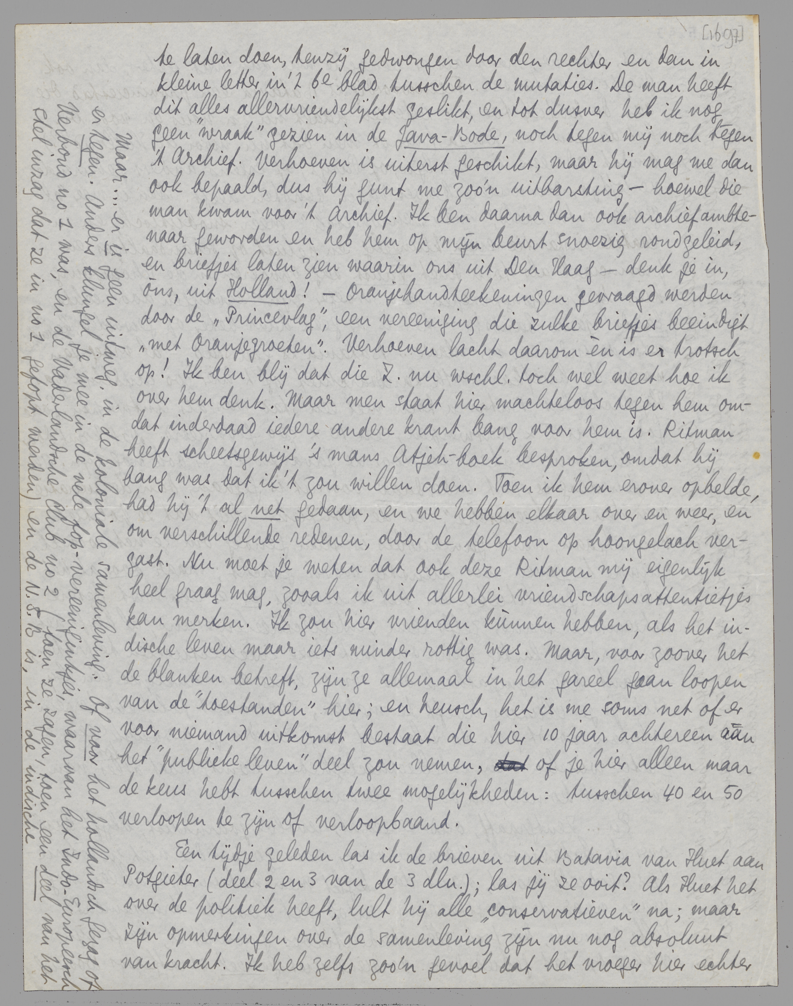 Dank voor de attentie me dit per luchtmail te hebben gezonden. Je opmerking over ‘meer domheid in de critiek of minder critiek op de domheid’ is van je allerbeste. Het heele ding is tegelijk raak èn van op afstand, wat wel het summum aan ergerlijkheid moet opleveren voor dit soort sanguinische pallurken. Er is soms bepaald iets Huetsch in je - ofschoon misschien vooral in de polemische kant - eenzelfde verbinding van scherpte en ‘fatsoen’. Verder ben je veel vlugger, minder stijf, maar dat ligt ook aan den tijd; of je 't wilt of niet, weet of niet, Multatuli heeft jou natuurlijk ook gemasseerd. Zou de ‘kern’, in dezen, de christelijke opvoeding (met samengaande deftigheid) zijn? - Ik liet je stuk lezen aan een journalist die mij het stuk van De Man indertijd gebracht had (Van de Ven van 't Bat. Nwsbl.) en hij zei: ‘Ja, ja... ik ben toch óók meer op den kant van Ter Braak...’ Maar het is pure lummeligheid. Een paar dagen geleden hadden we op het Archief bezoek van zekeren heer Kirdorfer, versch uitgekomen journalist van de Java-Bode, het blad van den unspeakablen Zentgraaff. Een mannetje à la Campert, bleekscheeterig, mager, een brilletje en sprietig haar, een beetje bedorven tandjes en net genoeg finesse om in de vrije avonduren af en toe een slap versje te schrijven. Hij vertelde dat Zentgraaff zoo'n gevoelig en... kunstgevoelig mensch was, heel anders dan hij zelf gedacht had, enz. Verhoeven, die het belang van het Archief voor had, begon dapper mee te doen: dat Z. toch maar de éénige journalist was, enz. Ik heb toen dezen afgezant van de Java-Bode precies gezegd, en waar mijn ‘chef’ bij zat, wat ik van de ‘drek-polemiek’ (term van Huet al uit 1868) van dit soort journalisten dacht; dat Z. de nakomeling was van Lion van het Handelsblad uit dien tijd; dat hij allerbedonderdst, grof en banaal schreef, maar daarom hier toch nog wel ‘de eenige’ kon zijn omdat de anderen heelemààl niet schreven; dat zulke ‘figuren’ als Z. spuugklodders waren op het gezicht van de indische samenleving en dat men ze weg moest vegen door hard te polemiseeren; en dat ik daartoe bereid was, maar dat de lafheid van de andere redacteuren mij dwars zat en dat Z. wel laf genoeg zou zijn om 't mij niet in zijn blad te laten doen, tenzij gedwongen door den rechter en dan in kleine letter in 't 6e blad tusschen de mutaties. De man heeft dit alles allervriendelijkst geslikt, en tot dusver heb ik nog geen ‘wraak’ gezien in de Java-Bode, noch tegen mij noch tegen 't Archief. Verhoeven is uiterst geschikt, maar hij mag me dan ook bepaald, dus hij gunt me zoo'n uitbarsting - hoewel die man kwam voor 't Archief. Ik ben daarna dan ook archiefambtenaar geworden en heb hem op mijn beurt snoezig rondgeleid, en briefjes laten zien waarin ons uit Den Haag - denk je in, òns, uit Holland! - Oranjehandteekeningen gevraagd werden door de Princevlag, een vereeniging die zulke briefjes beeindigt ‘met Oranjegroeten’. Verhoeven lacht daarom èn is er trotsch op! Ik ben blij dat die Z. nu wschl. toch wel weet hoe ik over hem denk. Maar men staat hier machteloos tegen hem omdat inderdaad iedere andere krant bang voor hem is. Ritman heeft scheetsgewijs 's mans Atjeh-boek besproken, omdat hij bang was dat ik 't zou willen doen. Toen ik hem erover opbelde, had hij 't al net gedaan, en we hebben elkaar over en weer, en om verschillende redenen, door de telefoon op hoongelach vergast. Nu moet je weten dat ook deze Ritman mij eigenlijk heel graag mag, zooals ik uit allerlei vriendschapsattentietjes kan merken. Ik zou hier vrienden kùnnen hebben, als het indische leven maar iets minder rottig was. Maar, voor zoover het de blanken betreft, zijn ze allemaal in het gareel gaan loopen van de ‘toestanden’ hier; en heusch, het is me soms net of er voor niemand uitkomst bestaat die hier 10 jaar achtereen aan het ‘publieke leven’ deel zou nemen, of je hier alleen maar de keus hebt tusschen twee mogelijkheden: tusschen 40 en 50 verloopen te zijn of verloopbaand.
